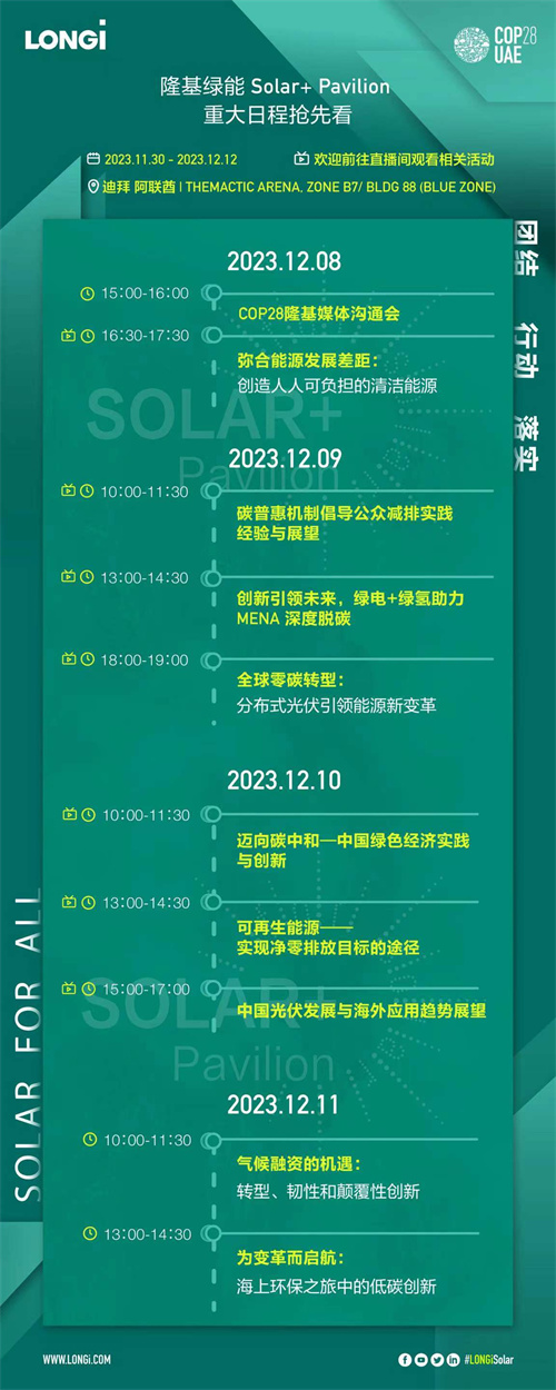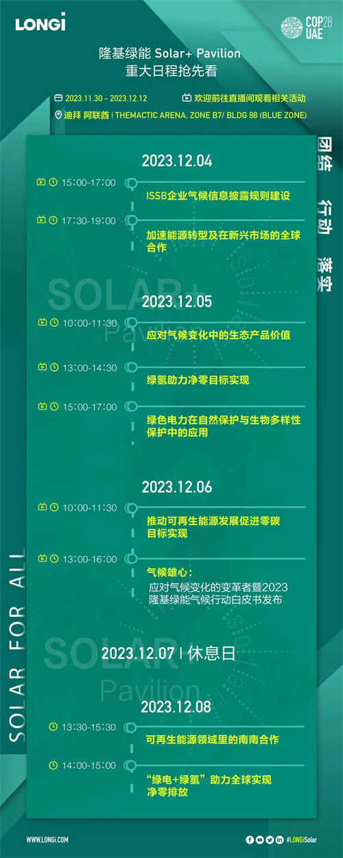 開幕式現(xiàn)場,隆基綠能品牌策劃總監(jiān)王火火介紹Solar+ Pavilion活動概覽及參與規(guī)劃。 這已經(jīng)是隆基綠能第五次參加聯(lián)合國氣候變化大會。此前的2018年,隆基綠能第一次亮相COP24,首次提出“Solar for Solar”理念,即以清潔能源制造清潔能源。2019年,隆基綠能在COP25上發(fā)布了《中國2050年光伏發(fā)展展望》,指出光伏將成為未來中國最重要的電力來源,并給中國乃至全球遏制氣候變化、實現(xiàn)可持續(xù)發(fā)展帶來巨大幫助。2021年,隆基綠能在COP26上發(fā)布了首份企業(yè)氣候行動白皮書,積極踐行RE100、EV100、EP100和SBTi四項國際倡議,并充分展示自身在運營范圍內(nèi)“減碳減排”所采取的實際行動與相應(yīng)成果。2022年,隆基綠能副總裁佘海峰在COP27上首倡全球能源公平。 在今年的COP28上,隆基綠能將宣布多項舉措,包括發(fā)布“綠電”+“綠氫”倡議,以實現(xiàn)全球碳中和。此外,隆基綠能還將分享如何在發(fā)展中國家促進實現(xiàn)能源公平的案例,并從沙特阿拉伯和卡塔爾開創(chuàng)性的太陽能項目中獲得啟示,展示中東清潔能源轉(zhuǎn)型的潛力。 11月30日,特別設(shè)立的COP28 Solar+ Pavilion正式開館。這是一個圍繞應(yīng)對氣候變化和全球可持續(xù)發(fā)展領(lǐng)域的公共交流平臺,也是COP28期間唯一一個以光伏為主題的獨立場館。大會期間,Solar+ Pavilion將舉辦29場系列活動,涉及的議題包括青年、女性、海水淡化、高耗能企業(yè)脫碳轉(zhuǎn)型、欠發(fā)達地區(qū)能源轉(zhuǎn)型、技術(shù)創(chuàng)新、綠電綠氫、與各利益相關(guān)的全球合作等方面。 行勝于言。李振國表示:“我們希望通過參加COP28,展示光伏技術(shù)在共同尋求可持續(xù)發(fā)展實踐中的價值和影響?!?/span> 附:隆基綠能Solar+ Pavilion活動日程