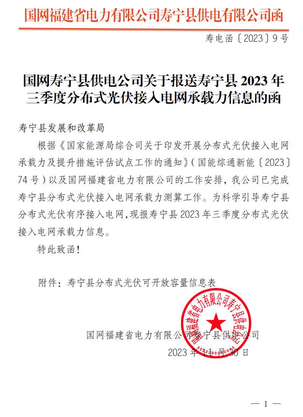 12月4日,福建省寧德市壽寧縣人民政府公布壽寧縣2023年三季度分布式光伏接入電網(wǎng)承載力信息,國網(wǎng)壽寧縣供電公司已完成壽寧縣分布式光伏接入電網(wǎng)承載力測算工作。目前,壽寧縣已接容量18.3MW,在途容量2.4MW,可新增開放容量12.8MW。