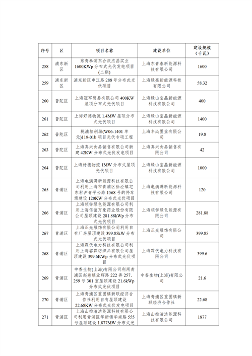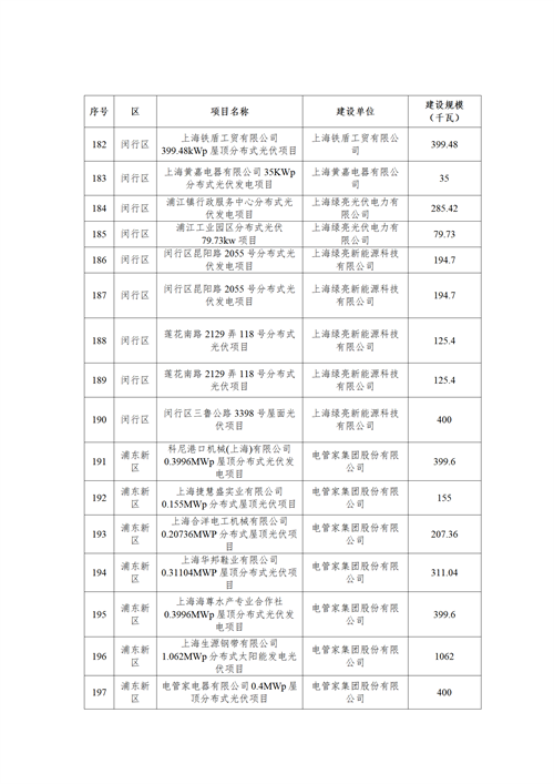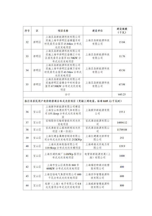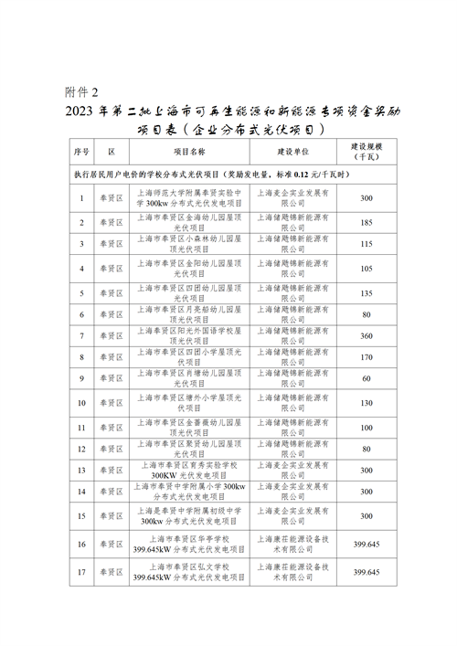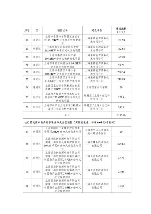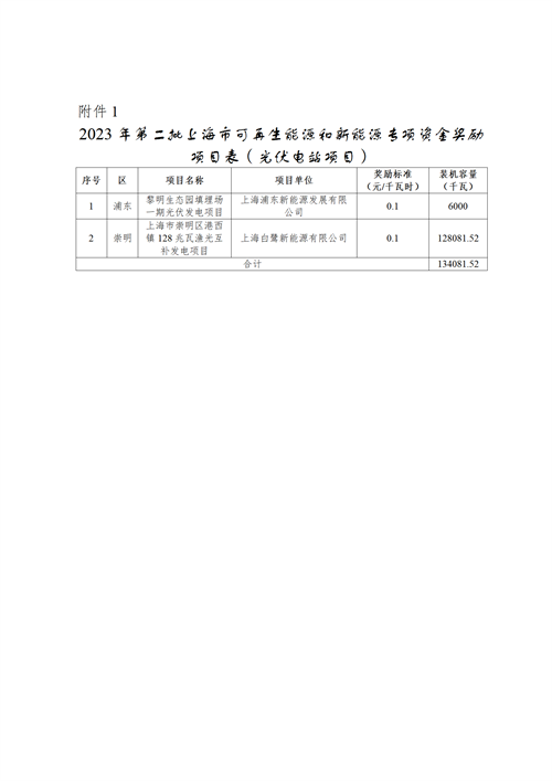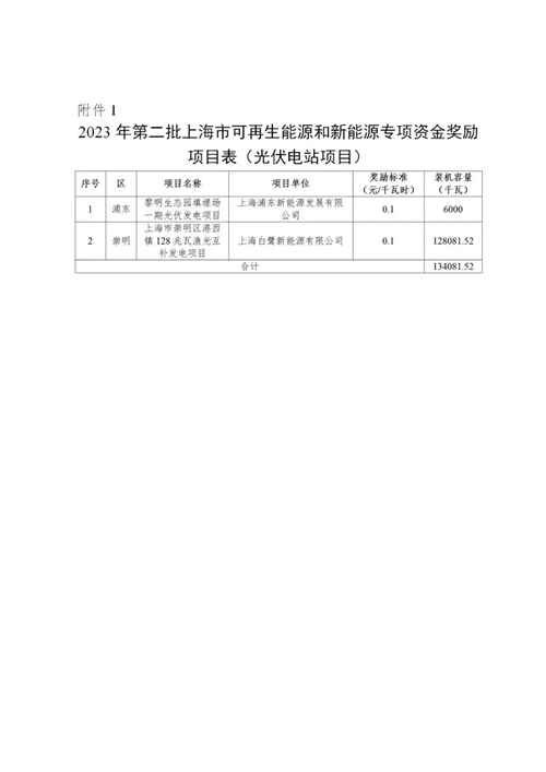 12月4日,上海市發(fā)改委公示上海市2023年第二批可再生能源和新能源發(fā)展專項資金獎勵目錄(草案),其中光伏電站項目2個、裝機容量134081.52千瓦;企業(yè)分布式光伏項目342個,裝機容量196076.825千瓦;居民分布式光伏項目1016個,裝機容量12384.313千瓦。 原文見下: 上海市2023年第二批可再生能源和新能源發(fā)展專項資金獎勵目錄(草案)公示 根據(jù)《上海市可再生能源和新能源發(fā)展專項資金扶持辦法》(滬發(fā)改規(guī)范〔2022〕14號,以下稱“14號文”)、《關于開展上海市可再生能源和新能源發(fā)展專項資金扶持項目線上申報試點工作的通知》(滬發(fā)改能源〔2023〕174號),市發(fā)展改革委會同市財政局組織開展了2023年第二批可再生能源和新能源發(fā)展專項資金獎勵目錄的核實確認工作。 經(jīng)各區(qū)發(fā)改委初審、申請,并委托市節(jié)能減排中心評估核實,擬將以下項目納入2023年第二批可再生能源和新能源發(fā)展專項資金獎勵目錄,現(xiàn)予公示。公示日期:2023年12月4日-12月10日;公示電話:021-23119484。 附件:1.2023年第二批上海市可再生能源和新能源專項資金獎勵項目表(光伏電站項目) 2.2023年第二批上海市可再生能源和新能源專項資金獎勵項目表(企業(yè)分布式光伏項目) 3.2023年第二批上海市可再生能源和新能源專項資金獎勵項目表(居民分布式光伏項目) 4.2023年第二批上海市可再生能源和新能源專項資金獎勵項目表(變更項目) 上海市發(fā)展和改革委員會 2023年12月4日