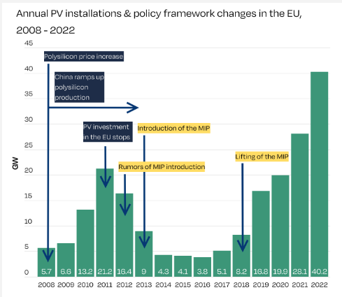 圖2歐洲20228~2022年安裝的光伏系統(tǒng)裝機容量和政策框架的變化 歐洲光伏產(chǎn)業(yè)協(xié)會在信函中重申了他們一貫呼吁政策制定者支持歐洲光伏制造業(yè)的立場,并敦促歐盟領(lǐng)導(dǎo)人: (1)考慮為歐洲光伏組件制造商提供國家擔(dān)保和信貸額度,這些制造商在當(dāng)前充滿挑戰(zhàn)的市場條件下,隨著進口光伏組件價格的下降,正在努力生存和發(fā)展。 (2)調(diào)整和延長臨時危機和過渡框架下的國家援助規(guī)則,以涵蓋光伏組件制造工廠的運營成本,降低獲取和實施的復(fù)雜性。 (3)在獲得國家融資的同時,為光伏組件制造提供歐盟層面的金融工具,例如與創(chuàng)新基金或新的歐盟主權(quán)基金掛鉤的光伏制造銀行。 這些產(chǎn)業(yè)戰(zhàn)略解決方案需要有明確的市場準(zhǔn)入標(biāo)準(zhǔn),以反映歐洲的ESG價值觀。因此,歐洲光伏產(chǎn)業(yè)協(xié)會繼續(xù)支持即將出臺的光伏行業(yè)生態(tài)設(shè)計規(guī)則,以及即將出臺的強制勞動禁令和企業(yè)可持續(xù)發(fā)展盡職調(diào)查指令。