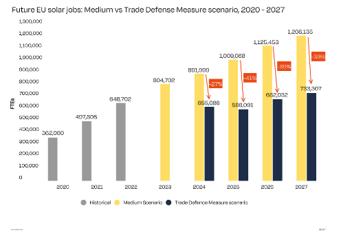 圖1歐盟光伏行業(yè)2020~2027年的就業(yè)與實施貿(mào)易保護措施的情景 在歐洲光伏產(chǎn)業(yè)協(xié)會發(fā)送給歐盟委員會的信函中,該協(xié)會提醒政策制定者注意歐洲光伏制造業(yè)的發(fā)展現(xiàn)狀。在歐洲預(yù)計安裝的54GW光伏系統(tǒng)中,只有不到3%(1.5GW)的光伏組件可以完全在歐洲制造。 報告補充說,這些貿(mào)易保護措施在過去并沒有奏效。根據(jù)行業(yè)媒體在早些時候的報道,當(dāng)光伏行業(yè)協(xié)會警告光伏行業(yè)在2010年代崩潰時,也發(fā)生了類似的情況。其中包括5年前發(fā)生的反傾銷事件。對從中國和馬來西亞等東南亞國家進口的光伏組件征收的反傾銷和反補貼稅被取消是有充分理由的。報告提到,這些關(guān)稅對光伏就業(yè)、項目投資和光伏部署產(chǎn)生了負(fù)面影響。該報告聲稱,在實施這些貿(mào)易保護措施期間,這種情況更加嚴(yán)重。它包括導(dǎo)致客戶成本增加,而且歐洲的光伏制造工廠并沒有得以復(fù)蘇。