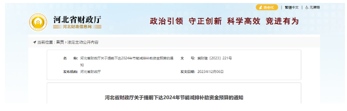 近日,河北省財(cái)政廳印發(fā)了關(guān)于提前下達(dá)2024年節(jié)能減排補(bǔ)助資金預(yù)算的通知。