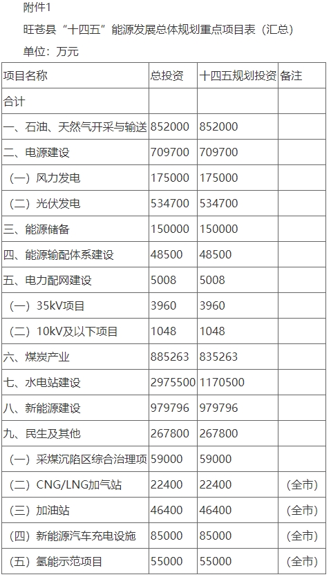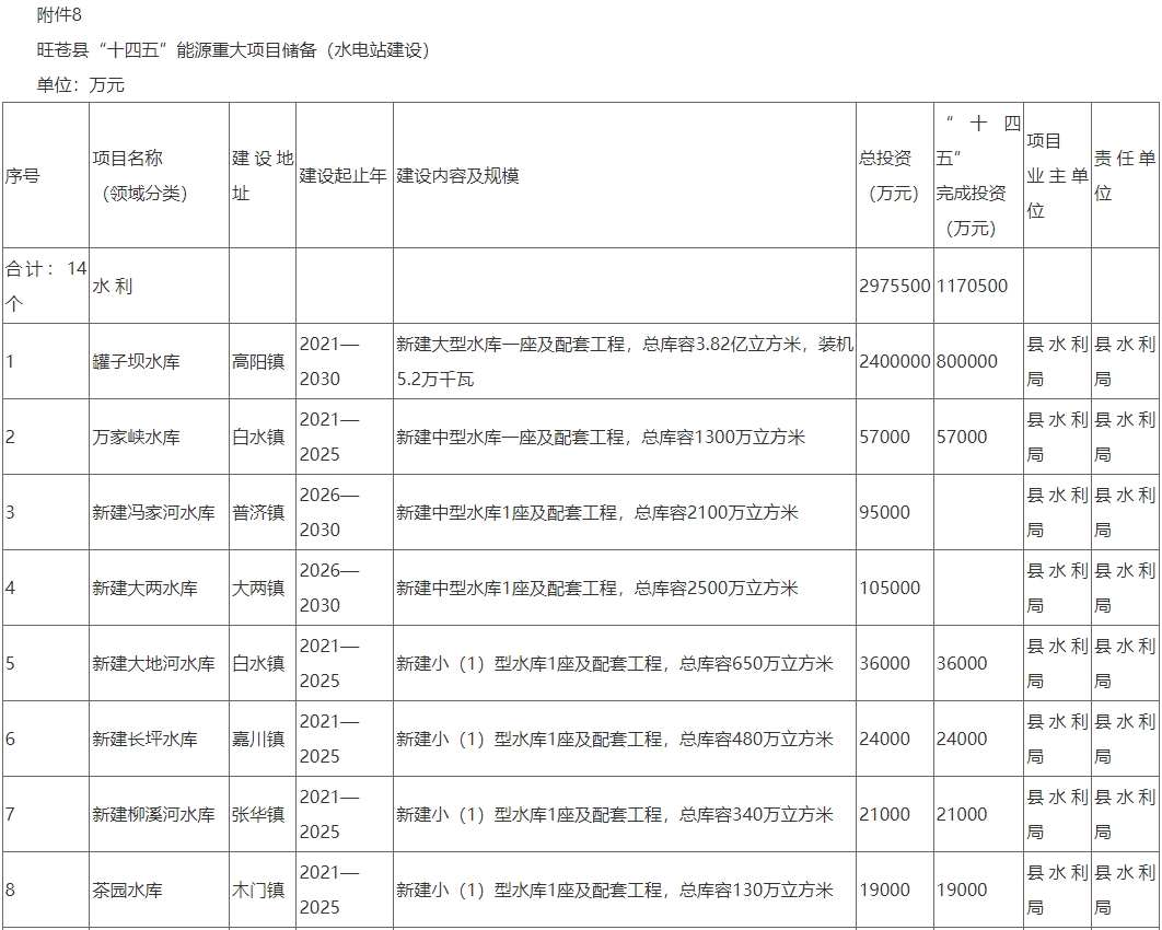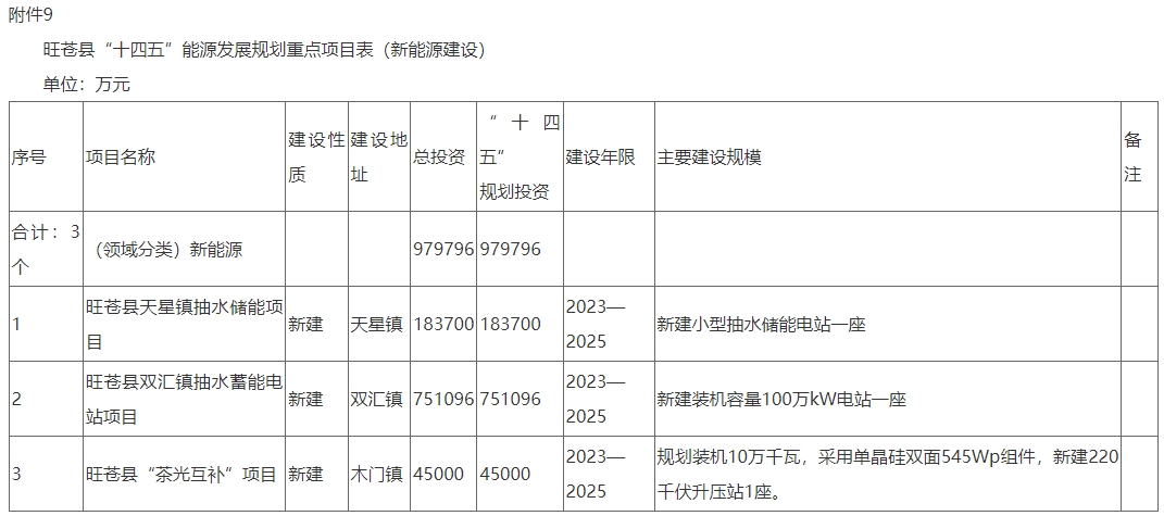 12月11日,四川省廣元市旺蒼縣人民政府關(guān)于印發(fā)《旺蒼縣“十四五”能源發(fā)展規(guī)劃》,其中公示兩座新建抽水蓄能電站,旺蒼縣天星鎮(zhèn)抽水儲能項目、旺蒼縣雙匯鎮(zhèn)抽水蓄能電站項目。同時公示新能源汽車充電設(shè)施、氫能示范項目。 規(guī)劃指出,大力推進抽水蓄能電站建設(shè),積極推動旺蒼天星中小抽水蓄能電站、旺蒼縣雙匯鎮(zhèn)抽水蓄能電站項目實施,確保抽水蓄能調(diào)峰、調(diào)頻、調(diào)相、儲能、系統(tǒng)備用和黑啟動等功能得到充分發(fā)揮。
