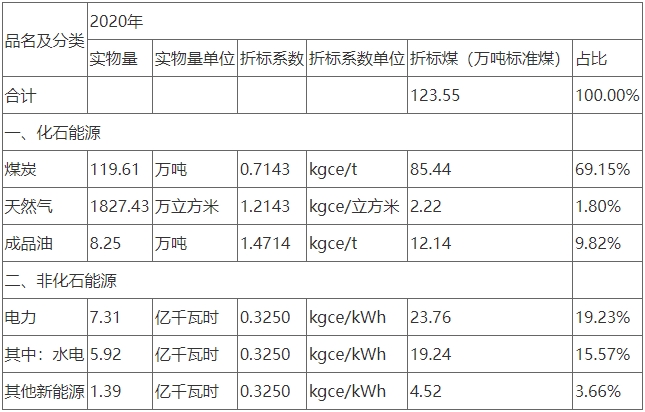 注:以上數(shù)據(jù)來源于2015-2020年《旺蒼縣統(tǒng)計年鑒》和2015-2020年旺蒼縣國民經(jīng)濟和社會發(fā)展統(tǒng)計公報;能源消費增速依據(jù)前述數(shù)據(jù)計算而得。 清潔能源利用深入推進?!笆濉逼陂g,大力發(fā)展以水電、沼氣、太陽能為主的清潔能源,在整體能源使用中占比達19.23%。 (詳見表1—4)。 表1—4 2020年旺蒼縣能源消費結(jié)構(gòu)表
