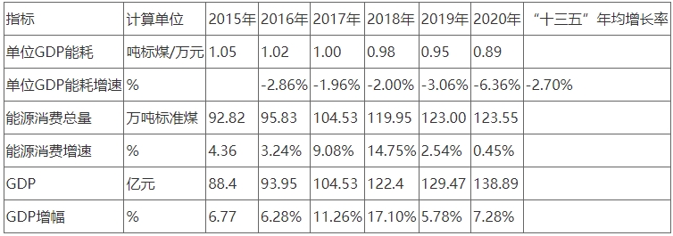 (四)油氣開發(fā)全面推進?!笆濉逼陂g,將劍閣縣、利州區(qū)、昭化區(qū)公司和旺蒼縣的天然氣中壓管網(wǎng)進行連網(wǎng),借助該連網(wǎng)工程串聯(lián)供區(qū)內(nèi)白水鎮(zhèn)、嘉川鎮(zhèn)和東河鎮(zhèn)的中壓管網(wǎng),在供區(qū)范圍內(nèi)形成了“三片區(qū)”的中壓管網(wǎng)供氣格局:“白水—嘉川—東河—黃洋”片區(qū)中壓管網(wǎng);沿東西方向連接白水鎮(zhèn)、嘉川鎮(zhèn)、東河鎮(zhèn)和黃洋鎮(zhèn)中壓主干管道,將上述各鎮(zhèn)中壓管網(wǎng)串聯(lián)成為一個橫向供氣網(wǎng)絡(luò);“普濟”片區(qū)中壓管網(wǎng)位于普濟鎮(zhèn)相對獨立的中壓供氣管網(wǎng)。 (五)節(jié)能降耗穩(wěn)步推進 單位GDP能耗穩(wěn)步下降。截至2020年末,全縣單位GDP能耗為0.89噸標煤/萬元,較2015年的1.05噸標煤/萬元下降0.16噸標煤/萬元,單位GDP能耗年均降幅2.70%。 表1-3旺蒼縣2016-2020年能源消費總量及變化情況