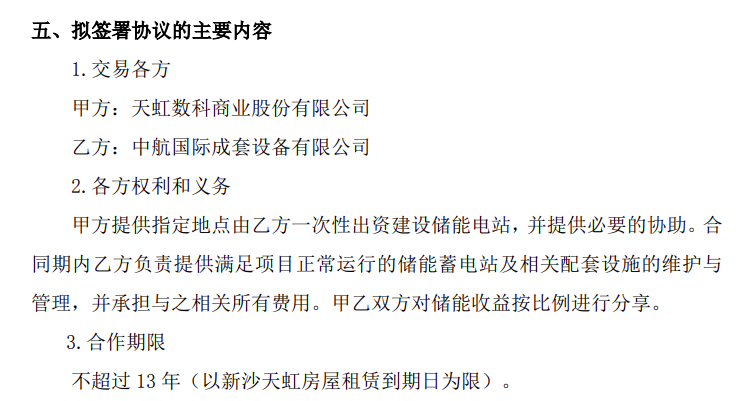 12月13日,天虹股份公告,將與中航國(guó)際成套設(shè)備有限公司(以下簡(jiǎn)稱“中航成套”)合作,在廣東深圳新沙天虹購(gòu)物中心開展儲(chǔ)能電站項(xiàng)目合作。 據(jù)悉,目前廣東深圳市執(zhí)行峰谷平電價(jià)政策,通過儲(chǔ)能電站,可利用平谷期低單價(jià)充電,峰期高單價(jià)放電,產(chǎn)生價(jià)差收益,實(shí)現(xiàn)節(jié)能效益。本次合作項(xiàng)目位于位于深圳市寶安區(qū)沙井街道西環(huán)路2105號(hào),為天虹數(shù)科商業(yè)股份有限公司運(yùn)營(yíng)的新沙天虹購(gòu)物中心,根據(jù)合作協(xié)議將由中航成套投資建設(shè)儲(chǔ)能電站,天虹股份與中航成套雙方就“儲(chǔ)能收益”,即節(jié)省的能源費(fèi)用按1:9比例進(jìn)行分配,合作期限13年,預(yù)計(jì)累計(jì)交易金額約3200萬(wàn)元。中航成套承諾本次合作的儲(chǔ)能電站配置容量為6.9MW/13.4MWh,且合作期內(nèi)儲(chǔ)能總收益不低于3484萬(wàn)元。 據(jù)悉,中航成套是公司注冊(cè)資本2.1億元,主營(yíng)業(yè)務(wù)包括施工總承包等,其控股股東中航國(guó)際實(shí)業(yè)控股有限公司的全資子公司,也是中航股份的關(guān)聯(lián)法人,本次交易構(gòu)成關(guān)聯(lián)交易。