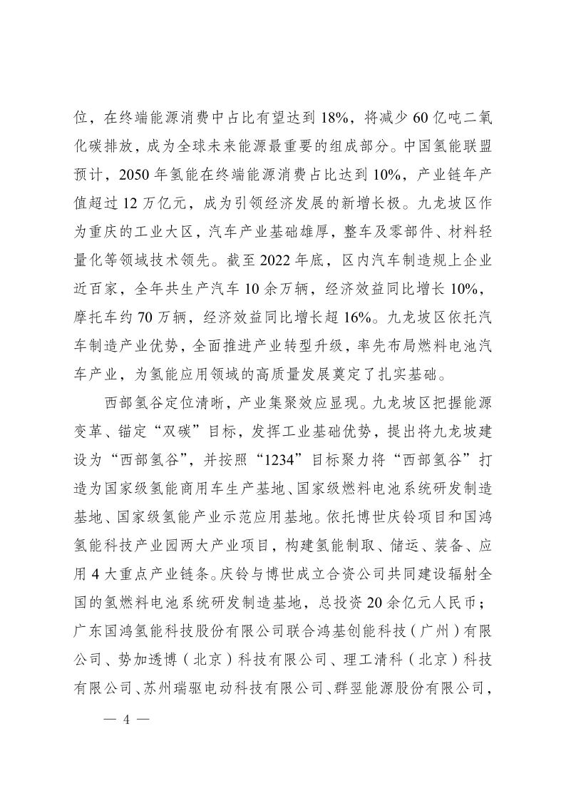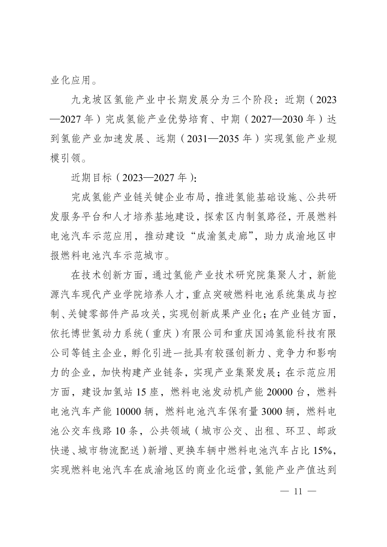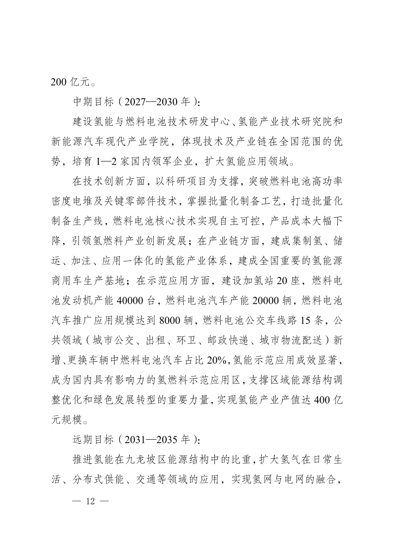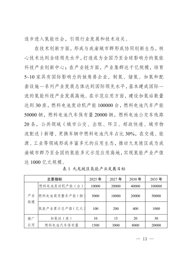 近日,重慶市九龍坡區(qū)人民政府發(fā)布《重慶市九龍坡區(qū)氫能產(chǎn)業(yè)中長(zhǎng)期發(fā)展規(guī)劃(2023—2035)》,文件指出,九龍坡區(qū)氫能產(chǎn)業(yè)中長(zhǎng)期發(fā)展分為三個(gè)階段:近期(2023—2027年)完成氫能產(chǎn)業(yè)優(yōu)勢(shì)培育、中期(2027—2030年)達(dá)到氫能產(chǎn)業(yè)加速發(fā)展、遠(yuǎn)期(2031—2035年)實(shí)現(xiàn)氫能產(chǎn)業(yè)規(guī)模引領(lǐng)。其中到2035年,在示范應(yīng)用方面,建設(shè)加氫站數(shù)量達(dá)到30座,燃料電池發(fā)動(dòng)機(jī)產(chǎn)能100000臺(tái),燃料電池汽車(chē)產(chǎn)能50000輛,燃料電池汽車(chē)保有量20000輛,燃料電池公交車(chē)線(xiàn)路20條,實(shí)現(xiàn)氫能產(chǎn)業(yè)產(chǎn)值達(dá)1000億元規(guī)模。 原文如下: