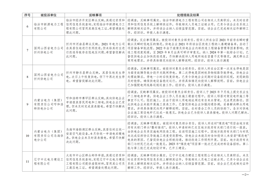 (三)問題處置情況 針對群眾反映的投訴舉報,國家能源局派出機構(gòu)嚴格根據(jù)國家有關(guān)法規(guī)政策進行處理。一是督促供電企業(yè)進一步規(guī)范用電報裝管理,強化業(yè)擴報裝全流程管控,嚴格按照規(guī)定時限完成裝表接電;二是要求供電企業(yè)加強設(shè)備隱患排查整治和停電搶修管理,加強線路巡視頻次,及時消除隱患缺陷,增加搶修資源投入,提升設(shè)備管控和停電搶修能力,切實提高供電質(zhì)量;三是通過行政處罰、監(jiān)管約談、責令整改等方式,糾正有關(guān)企業(yè)違法違規(guī)行為,維護公平公正的市場秩序和群眾合法權(quán)益;四是通過解釋說明、澄清事實,使群眾消除誤解。(2023年11月12398熱線典型投訴舉報事項具體處理情況見附件2) 附件: 1.全國接收投訴舉報地區(qū)分布情況 2.2023年11月12398熱線典型投訴舉報事項具體處理情況