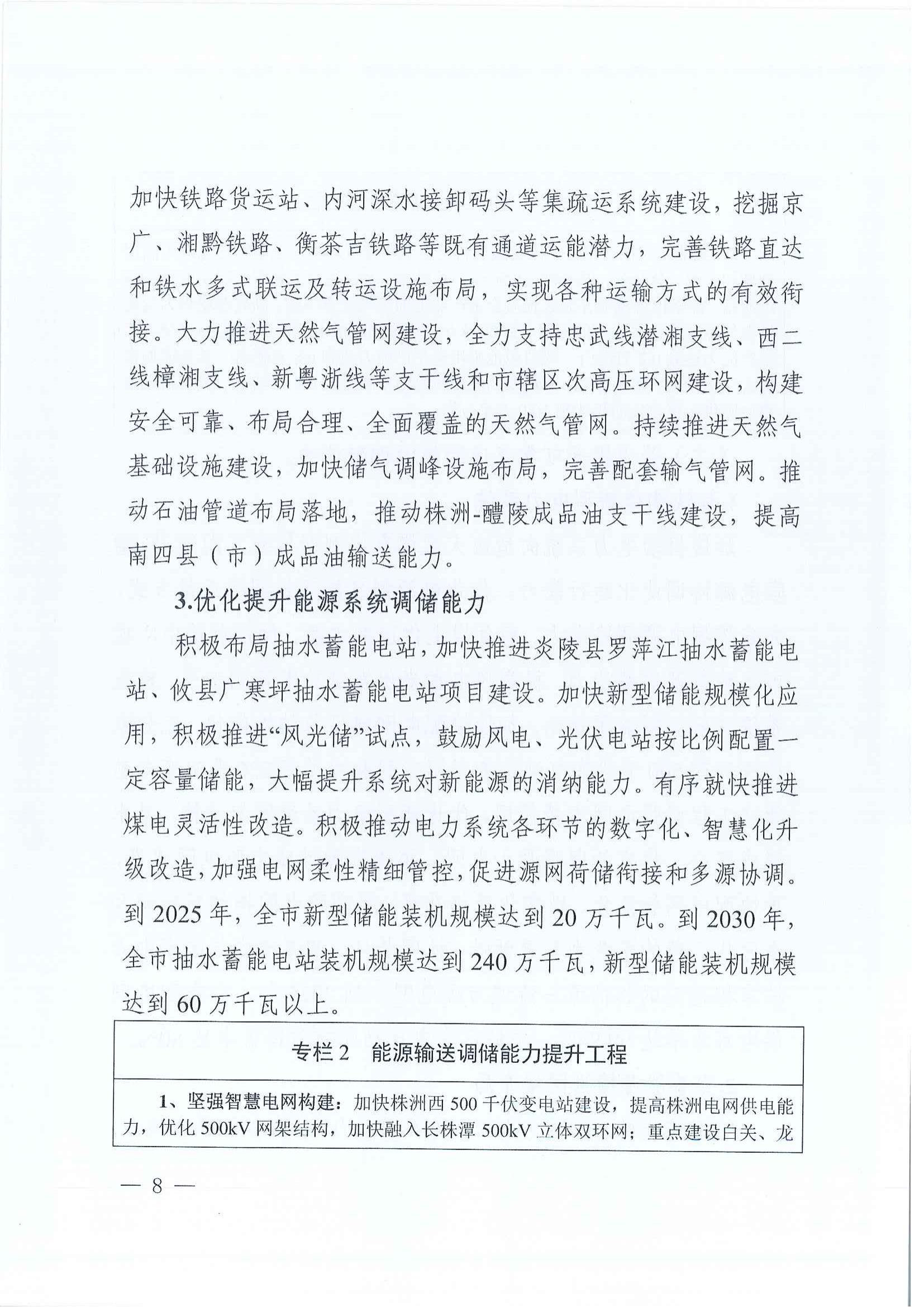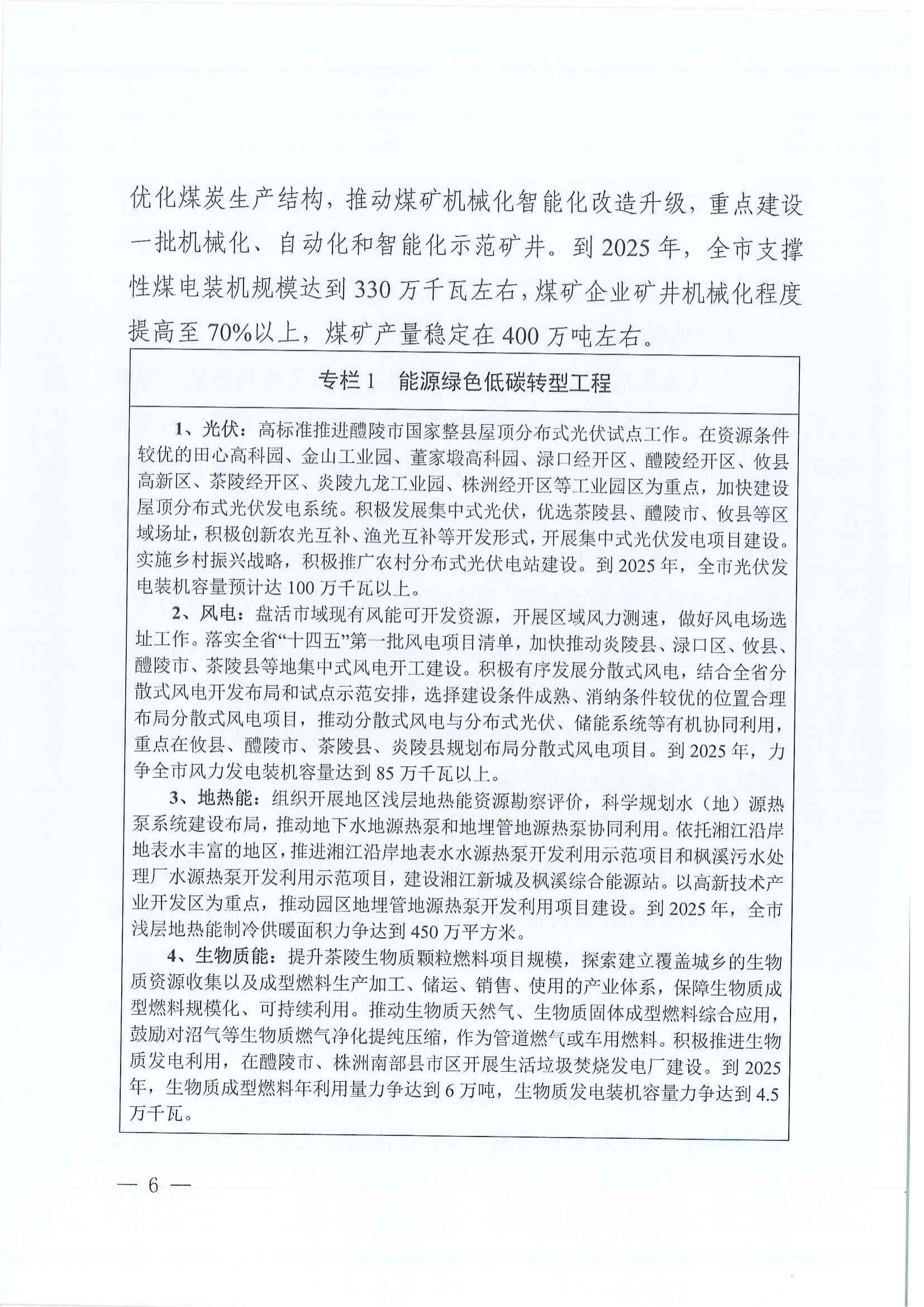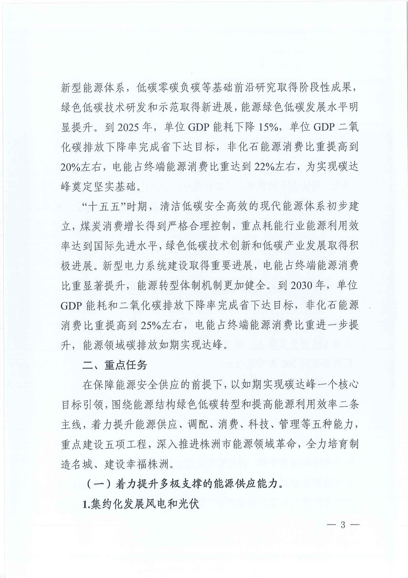 12月18日,株洲市發(fā)展和改革委發(fā)布株洲市能源領(lǐng)域碳達峰實施方案,方案指出,堅持集中式與分布式并舉,努力實現(xiàn)風(fēng)電和光伏發(fā)電規(guī)?;涂缭绞桨l(fā)展。開展區(qū)域風(fēng)力測速與分散式風(fēng)力發(fā)電選址工作,以資源定布局,優(yōu)先在資源稟賦好、建設(shè)條件優(yōu)、消納和送出條件能力強的區(qū)域建設(shè)集中式風(fēng)電、光伏發(fā)電項目。按照“儲備一批、成熟一批、推進一批”的思路,加快推動龍溪風(fēng)電、賀家橋風(fēng)電、鸞山金子嶺風(fēng)電、丫江橋風(fēng)電、上合村復(fù)合光伏等已納入湖南省“十四五”第一批風(fēng)電、集中式光伏發(fā)電項目開發(fā)建設(shè)。支持分布式光伏就地就近開發(fā)利用,在屋頂(含附屬空閑場地)建筑面積充裕、具有穩(wěn)定用電需求的園區(qū)、公共建筑、工商業(yè)樓宇等區(qū)域大力發(fā)展分布式光伏發(fā)電系統(tǒng)。堅持多能互補生態(tài)融合發(fā)展,探索建設(shè)多能互補清潔能源基地。深入落實鄉(xiāng)村振興戰(zhàn)略,推進村級扶貧電站建設(shè),鼓勵城郊高檔住宅、農(nóng)村自建住宅配套建設(shè)家庭光伏發(fā)電。到2025年,全市風(fēng)電、光伏發(fā)電裝機規(guī)模達到185萬千瓦以上;到2030年,力爭全市風(fēng)電、光伏發(fā)電裝機規(guī)模達到300萬千瓦以上。 原文如下: