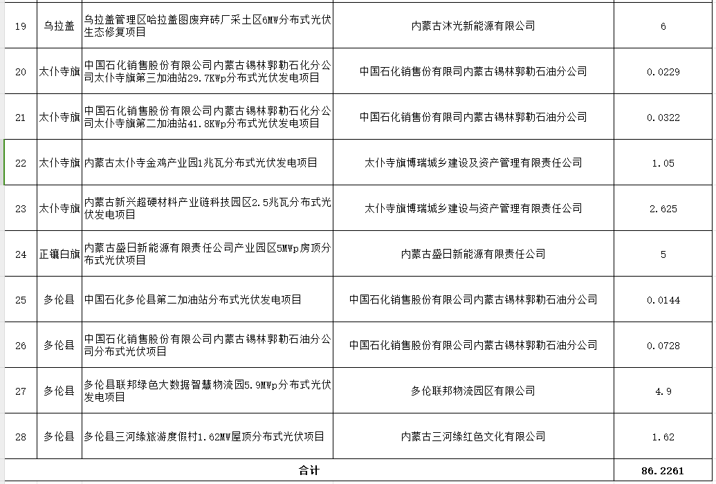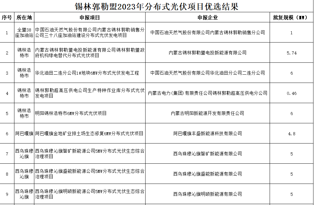 12月26日,錫林郭勒盟能源局發(fā)布關(guān)于對(duì)2023年全盟分散式風(fēng)電、分布式光伏 擬支持項(xiàng)目進(jìn)行公示的通知。 根據(jù)通知,優(yōu)選出錫林郭勒盟2023年擬支持分散式風(fēng)電、分布式光伏項(xiàng)目共計(jì)30個(gè)、總規(guī)模14.8萬千瓦。其中,分布式光伏項(xiàng)目28個(gè),規(guī)??傆?jì)86.2261MW。 全文見下: 關(guān)于對(duì)2023年全盟分散式風(fēng)電、分布式光伏 擬支持項(xiàng)目進(jìn)行公示的通知 根據(jù)《內(nèi)蒙古自治區(qū)能源局關(guān)于印發(fā)<內(nèi)蒙古自治區(qū)分散式風(fēng)電、分布式光伏發(fā)電項(xiàng)目三年行動(dòng)計(jì)劃(2021-2023年)>的通知》(內(nèi)能新能字〔2021〕338號(hào)),錫盟能源局制定了《2023年分散式風(fēng)電和分布式光伏項(xiàng)目競(jìng)爭(zhēng)性配置優(yōu)選工作方案》,并委托中國電建集團(tuán)貴陽勘測(cè)設(shè)計(jì)研究院有限公司按照方案開展全盟2023年分散式風(fēng)電和分布式光伏項(xiàng)目競(jìng)爭(zhēng)性配置優(yōu)選工作,本著公平、公正、客觀的原則,對(duì)各旗縣市(區(qū))申報(bào)的項(xiàng)目方案進(jìn)行了評(píng)價(jià)分析,優(yōu)選出錫林郭勒盟2023年擬支持分散式風(fēng)電、分布式光伏項(xiàng)目共計(jì)30個(gè)、總規(guī)模14.8萬千瓦。經(jīng)錫林郭勒盟能源局黨組研究確定,現(xiàn)將擬支持項(xiàng)目和企業(yè)名單予以公示。公示期為2023年12月25日—12月28日。如對(duì)公示內(nèi)容有異議,請(qǐng)?jiān)诠酒趦?nèi)以書面形式提出意見后,反饋至錫林郭勒盟能源局。 聯(lián)系人:楊 韜 電話:0479-8285610 附件1:錫林郭勒盟2023年分散式風(fēng)電、分布式光伏項(xiàng)目?jī)?yōu)選結(jié)果.xls 附件2:錫林郭勒盟2023年分散式風(fēng)電項(xiàng)目?jī)?yōu)選結(jié)果.xls