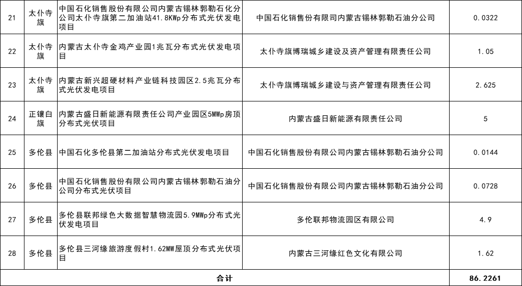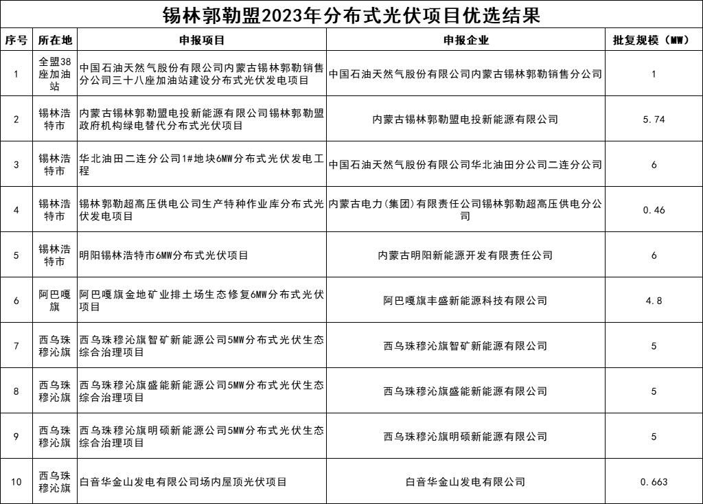 12月26日,錫林郭勒盟能源局發(fā)布《關(guān)于對(duì)2023年全盟分散式風(fēng)電、分布式光伏擬支持項(xiàng)目進(jìn)行公示的通知》。 《通知》指出,錫林郭勒盟2023年擬支持分散式風(fēng)電、分布式光伏項(xiàng)目共計(jì)30個(gè)、總規(guī)模14.8萬(wàn)千瓦。其中,分散式風(fēng)電項(xiàng)目2個(gè),批復(fù)規(guī)模62MW;分布式光伏項(xiàng)目28個(gè),批復(fù)規(guī)模為86.2261MW。 原文見下: 關(guān)于對(duì)2023年全盟分散式風(fēng)電、分布式光伏 擬支持項(xiàng)目進(jìn)行公示的通知 根據(jù)《內(nèi)蒙古自治區(qū)能源局關(guān)于印發(fā)<內(nèi)蒙古自治區(qū)分散式風(fēng)電、分布式光伏發(fā)電項(xiàng)目三年行動(dòng)計(jì)劃(2021-2023年)>的通知》(內(nèi)能新能字〔2021〕338號(hào)),錫盟能源局制定了《2023年分散式風(fēng)電和分布式光伏項(xiàng)目競(jìng)爭(zhēng)性配置優(yōu)選工作方案》,并委托中國(guó)電建集團(tuán)貴陽(yáng)勘測(cè)設(shè)計(jì)研究院有限公司按照方案開展全盟2023年分散式風(fēng)電和分布式光伏項(xiàng)目競(jìng)爭(zhēng)性配置優(yōu)選工作,本著公平、公正、客觀的原則,對(duì)各旗縣市(區(qū))申報(bào)的項(xiàng)目方案進(jìn)行了評(píng)價(jià)分析,優(yōu)選出錫林郭勒盟2023年擬支持分散式風(fēng)電、分布式光伏項(xiàng)目共計(jì)30個(gè)、總規(guī)模14.8萬(wàn)千瓦。經(jīng)錫林郭勒盟能源局黨組研究確定,現(xiàn)將擬支持項(xiàng)目和企業(yè)名單予以公示。公示期為2023年12月25日—12月28日。如對(duì)公示內(nèi)容有異議,請(qǐng)?jiān)诠酒趦?nèi)以書面形式提出意見后,反饋至錫林郭勒盟能源局。 聯(lián)系人:楊 韜 電話:0479-8285610 附件1:錫林郭勒盟2023年分散式風(fēng)電、分布式光伏項(xiàng)目?jī)?yōu)選結(jié)果.xls 附件2:錫林郭勒盟2023年分散式風(fēng)電項(xiàng)目?jī)?yōu)選結(jié)果.xls