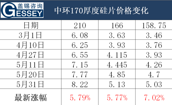 蓋錫咨詢了解到,中環(huán)股份調(diào)高單晶硅片價格:G1型硅片報價5.03元,上漲 0.33元;M6型硅片報價5.13元,上漲0.28元;G12型硅片報價8.22元,上漲0.45元。這是五月以來中環(huán)第三次公布硅片漲價信息。 與3月1日,中環(huán)首次公開發(fā)布硅片的價格相比,210硅片上漲2.04元,166硅片上漲1.5元,158.75硅片上漲1.57元。