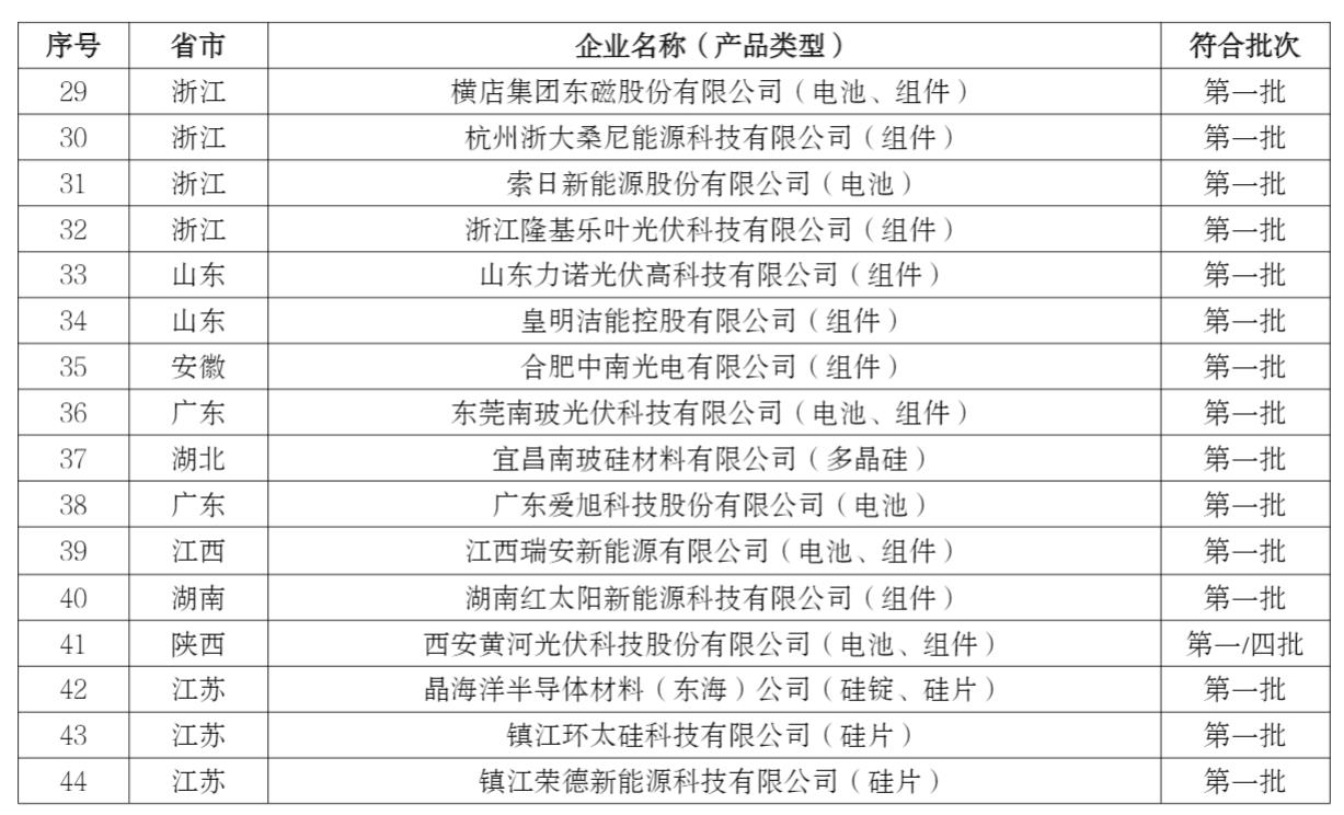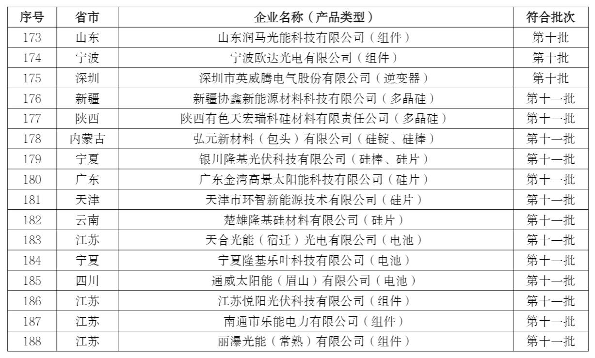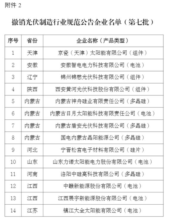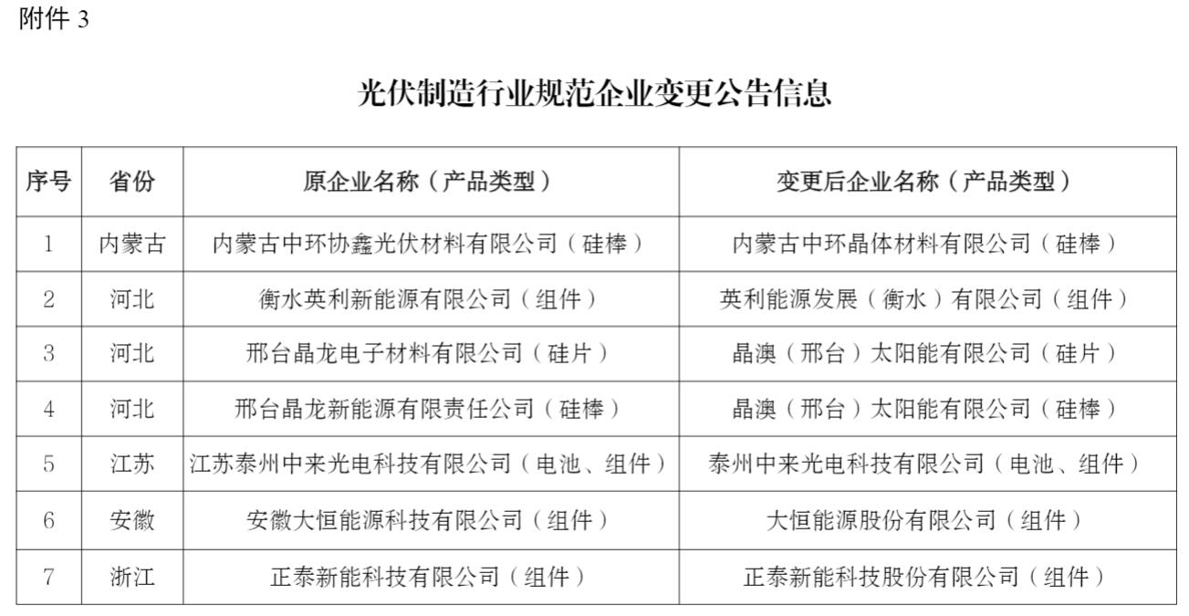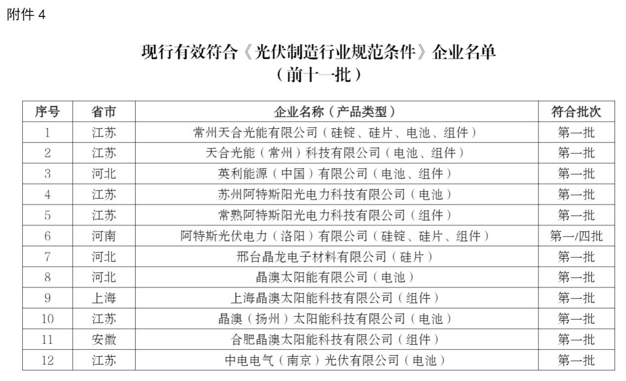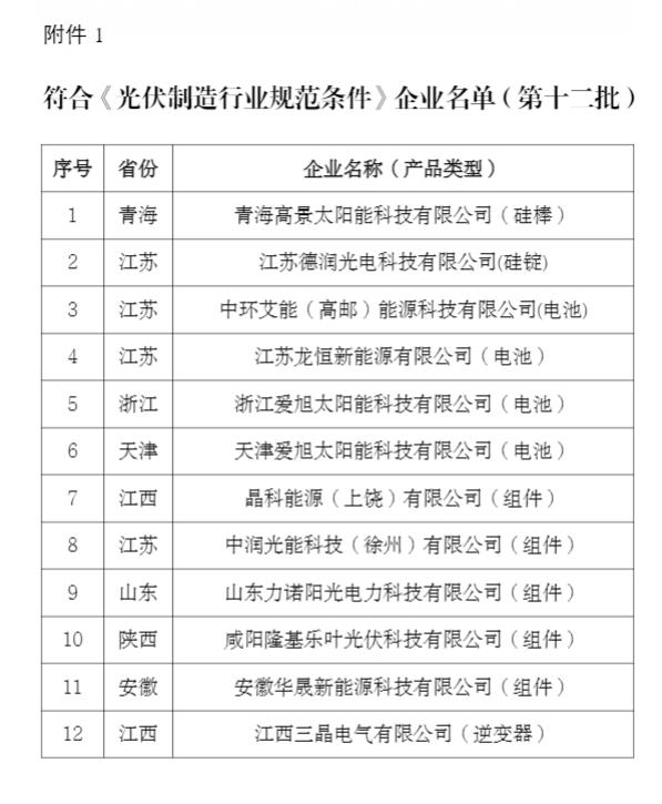 12月29日,工信部公布了符合《光伏制造行業(yè)規(guī)范條件》企業(yè)名單(第十二批)及撤銷(xiāo)光伏制造行業(yè)規(guī)范公告企業(yè)名單(第七批)。 詳情如下: 中華人民共和國(guó)工業(yè)和信息化部公告 2023年第41號(hào) 按照《國(guó)務(wù)院關(guān)于促進(jìn)光伏產(chǎn)業(yè)健康發(fā)展的若干意見(jiàn)》(國(guó)發(fā)〔2013〕24號(hào))要求,根據(jù)《光伏制造行業(yè)規(guī)范條件(2021年本)》及《光伏制造行業(yè)規(guī)范公告管理暫行辦法(2021年本)》規(guī)定,經(jīng)企業(yè)申報(bào)、省級(jí)工業(yè)和信息化管理部門(mén)推薦、專家復(fù)核、現(xiàn)場(chǎng)核實(shí)、網(wǎng)上公示等程序,確定符合《光伏制造行業(yè)規(guī)范條件》企業(yè)名單(第十二批)、撤銷(xiāo)光伏制造行業(yè)規(guī)范公告企業(yè)名單(第七批),現(xiàn)予以公告。光伏制造行業(yè)規(guī)范企業(yè)變更公告信息和現(xiàn)行有效符合《光伏制造行業(yè)規(guī)范條件》企業(yè)名單(前十一批),一并予以公告。 附件:1.符合《光伏制造行業(yè)規(guī)范條件》企業(yè)名單(第十二批) 2.撤銷(xiāo)光伏制造行業(yè)規(guī)范公告企業(yè)名單(第七批) 3.光伏制造行業(yè)規(guī)范企業(yè)變更公告信息 4.現(xiàn)行有效符合《光伏制造行業(yè)規(guī)范條件》企業(yè)名單(前十一批) 工業(yè)和信息化部 2023年12月22日