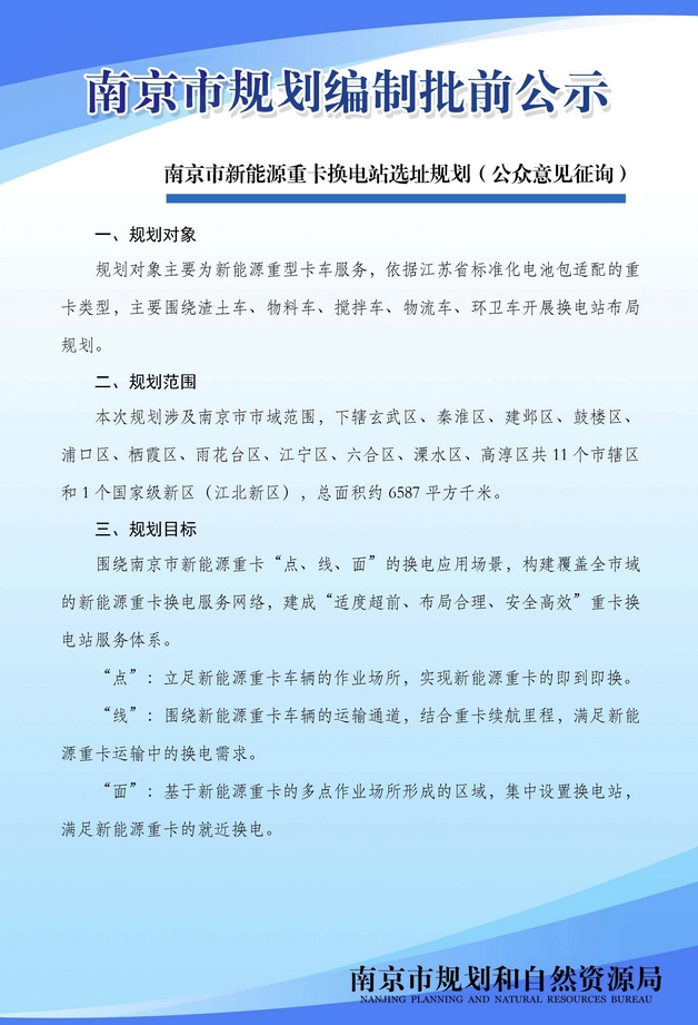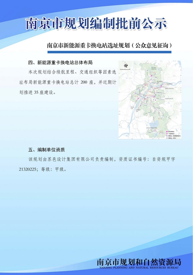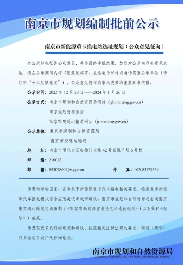 2023年12月27日,南京市規(guī)劃和自然資源局對(duì)南京市新能源重卡換電站選址規(guī)劃進(jìn)行批前公示。規(guī)劃顯示,南京擬布局新能源重卡換電站總計(jì)200座,近期計(jì)劃推進(jìn)35座建設(shè)。