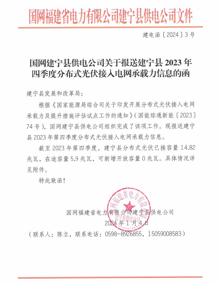 1月4日,福建省三明市建寧縣人民政府發(fā)布《關(guān)于建寧縣2023年四季度分布式光伏接入電網(wǎng)承載力信息的復函》,復函顯示,截至2023年第四季度,建寧縣分布式光伏已接容量14.82MW,在途容量5.9MW,可新增開放容量為0MW。 詳情如下: 關(guān)于建寧縣2023年四季度分布式光伏接入電網(wǎng)承載力信息的復函 國網(wǎng)福建省電力有限公司建寧縣供電公司: 你公司提交的《國網(wǎng)建寧縣供電公司關(guān)于報送建寧縣2023年四季度分布式光伏接入電網(wǎng)承載力信息的函》已收悉,經(jīng)研究,原則同意你公司測算匯總的建寧縣供電區(qū)域內(nèi)截至2023年第四季度220kV饒山變光伏接入可新增開放容量為0兆瓦。在后續(xù)分布式光伏項目備案中,我局將加強與你公司信息溝通,有序引導項目單位開展分布式光伏接入申請有關(guān)事宜。 下一步,我局將按照省、市的統(tǒng)一工作安排,會同你公司做好分布式光伏可開放容量信息公開等相關(guān)工作。 特此函復。 附件:國網(wǎng)建寧縣供電公司關(guān)于報送建寧縣2023年四季度分布式光伏接入電網(wǎng)承載力信息的函(建電函〔2024〕3號) 建寧縣發(fā)展和改革局 2023年1月4日