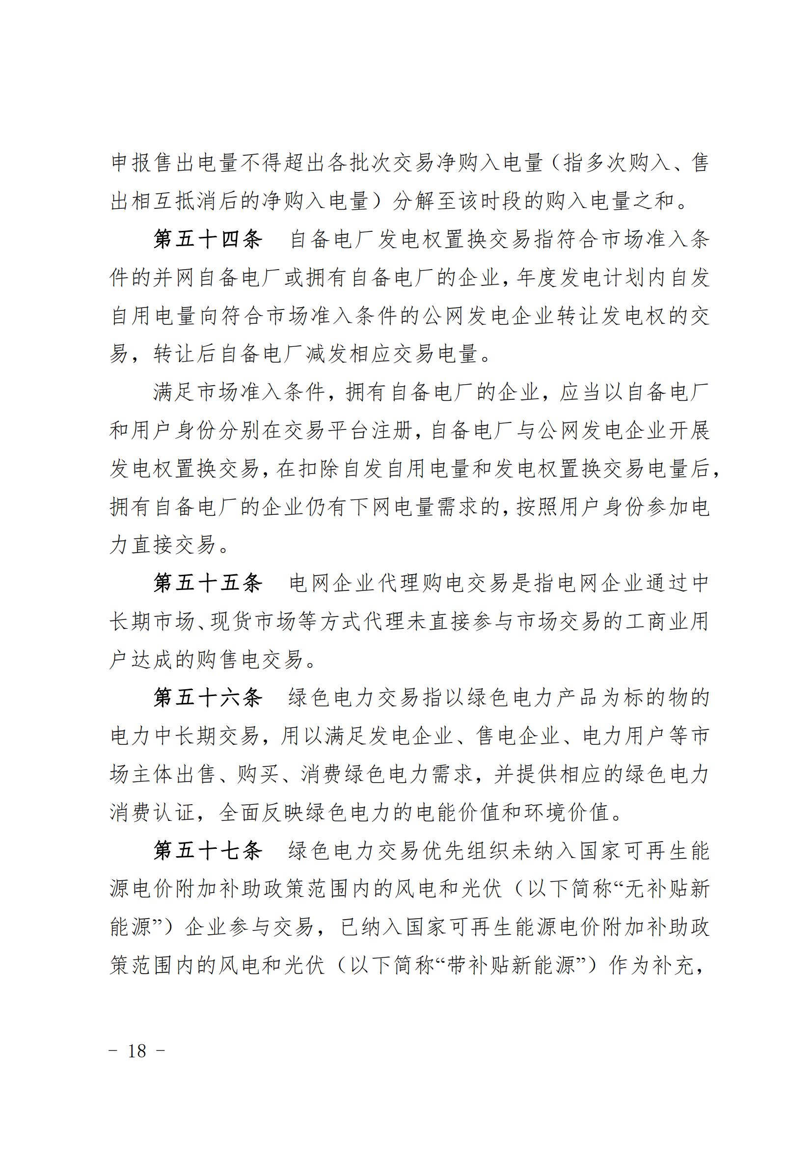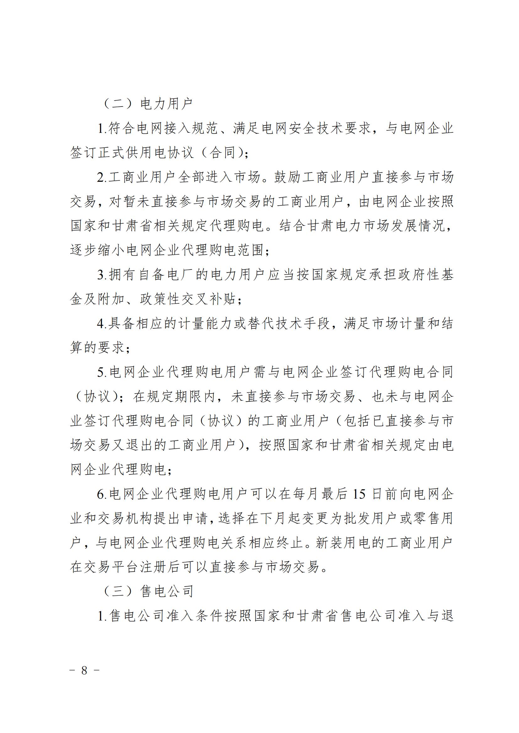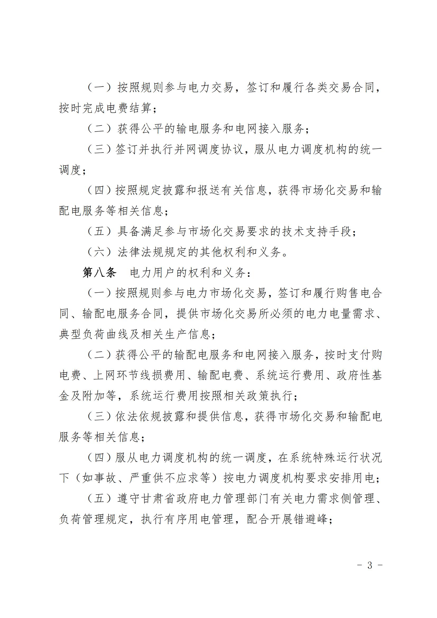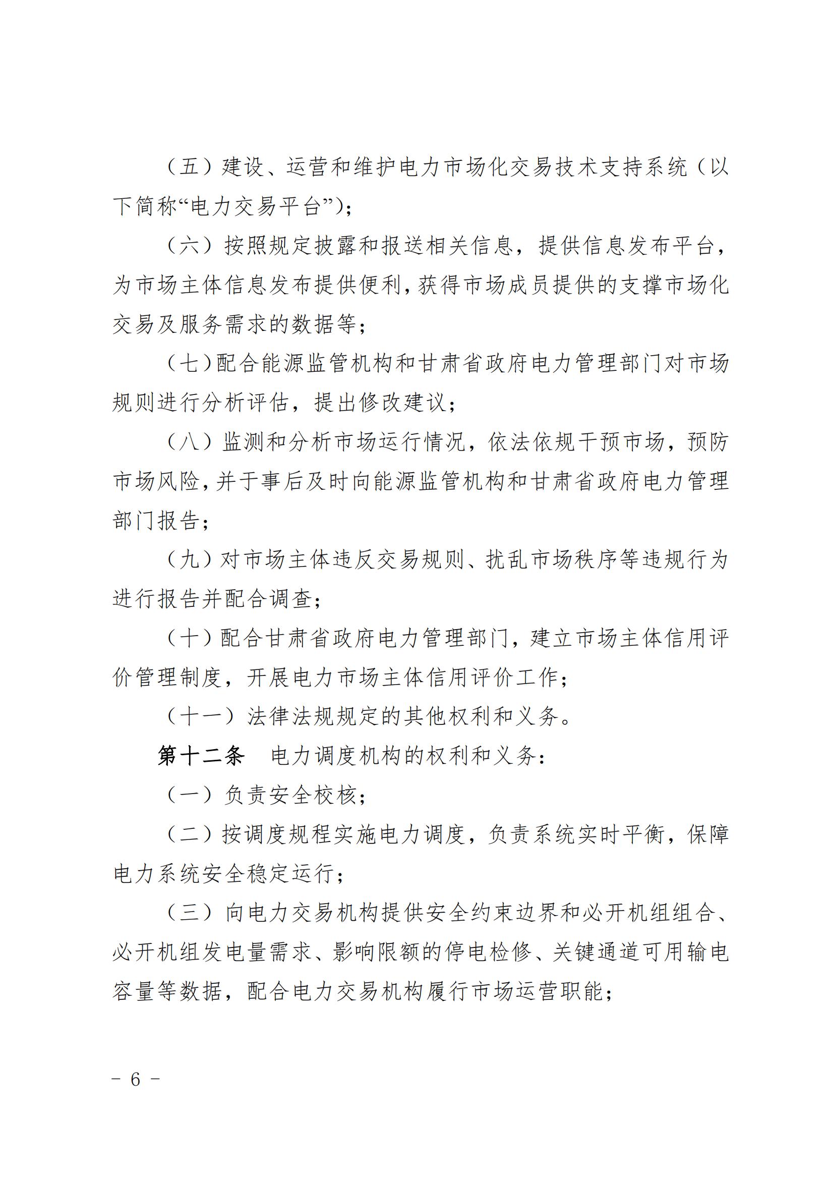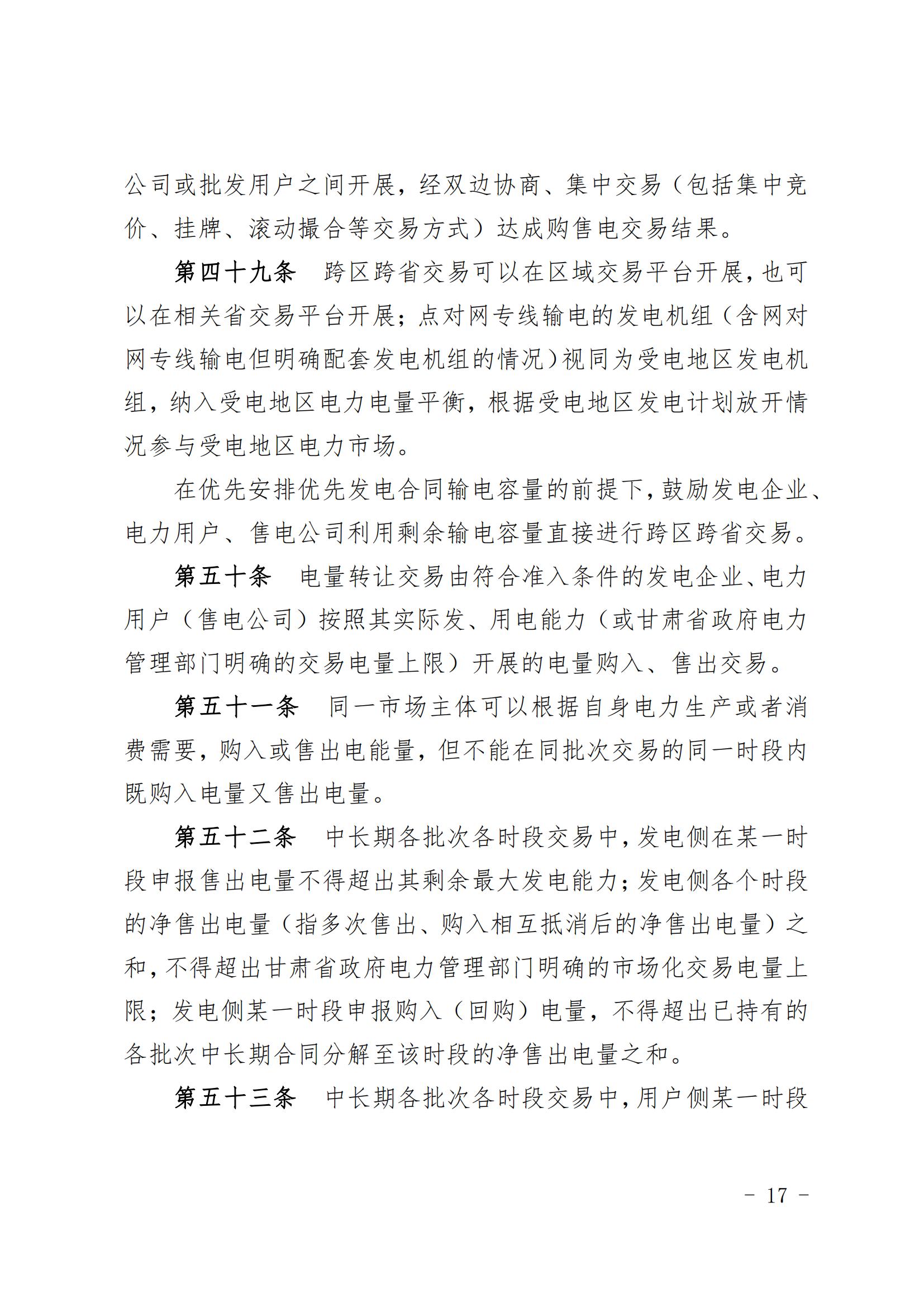 日前,甘肅省電力中長(zhǎng)期交易實(shí)施細(xì)則 (試行)印發(fā)。 細(xì)則指出,綠色電力交易優(yōu)先組織未納入國(guó)家可再生能 源電價(jià)附加補(bǔ)助政策范圍內(nèi)的風(fēng)電和光伏(以下簡(jiǎn)稱“無補(bǔ)貼新 能源”)企業(yè)參與交易,已納入國(guó)家可再生能源電價(jià)附加補(bǔ)助政 策范圍內(nèi)的風(fēng)電和光伏(以下簡(jiǎn)稱“帶補(bǔ)貼新能源”)作為補(bǔ)充,根據(jù)國(guó)家有關(guān)要求可以逐步擴(kuò)大至符合條件的其他類型發(fā)電企 業(yè)。電力用戶主要為具有綠色電力消費(fèi)及認(rèn)證需求、愿意承擔(dān)綠 色電力環(huán)境價(jià)值的用電企業(yè),主要包括直接參與交易的工商業(yè)用 戶和電網(wǎng)企業(yè)代理購(gòu)電用戶。 多臺(tái)發(fā)電機(jī)組共用上網(wǎng)計(jì)量點(diǎn)且無法拆 分,各發(fā)電機(jī)組需分別結(jié)算時(shí),按照每臺(tái)機(jī)組的實(shí)際發(fā)電量等比 例拆分共用計(jì)量點(diǎn)的上網(wǎng)電量。對(duì)于風(fēng)電、光伏企業(yè)處于相同運(yùn) 行狀態(tài)的不同項(xiàng)目批次共用同一計(jì)量點(diǎn)的機(jī)組,可以按照額定容 量比例計(jì)算上網(wǎng)電量。 風(fēng)電、光伏發(fā)電企業(yè)年度保障收購(gòu)電量按 照政府批復(fù)的價(jià)格或者價(jià)格機(jī)制進(jìn)行結(jié)算。超出年度保障收購(gòu)電 量的部分通過市場(chǎng)交易方式消納并按照市場(chǎng)交易價(jià)格結(jié)算。 風(fēng)電、光伏發(fā)電量參與市場(chǎng)交易,結(jié)算涉 及中央財(cái)政補(bǔ)貼時(shí),按照國(guó)家相關(guān)補(bǔ)貼管理規(guī)定執(zhí)行。 全文見下: 國(guó)家能源局甘肅監(jiān)管辦公室甘肅省發(fā)展和改革委員會(huì)甘肅省工業(yè)和信息化廳 關(guān)于印發(fā)《甘肅省電力中長(zhǎng)期交易實(shí)施細(xì)則(試行)》的通知 甘監(jiān)能市場(chǎng)〔2023〕161號(hào) 國(guó)網(wǎng)甘肅省電力公司,甘肅電力交易中心有限公司,甘肅省電力市場(chǎng)管理委員會(huì),各有關(guān)發(fā)電企業(yè),售電公司,電力用戶,儲(chǔ)能企業(yè): 為深入貫徹落實(shí)《中共中央國(guó)務(wù)院關(guān)于進(jìn)一步深化電力體制改革的若干意見》(中發(fā)〔2015〕9號(hào))及其配套文件精神,按照《國(guó)家發(fā)展改革委 國(guó)家能源局關(guān)于印發(fā)<電力中長(zhǎng)期交易基本規(guī)則>的通知》(發(fā)改能源規(guī)〔2020〕889號(hào))、《國(guó)家發(fā)展改革委關(guān)于第三監(jiān)管周期省級(jí)電網(wǎng)輸配電價(jià)及有關(guān)事項(xiàng)的通知》(發(fā)改價(jià)格〔2023〕526號(hào))、《國(guó)家發(fā)展改革委 國(guó)家能源局關(guān)于印發(fā)<電力現(xiàn)貨市場(chǎng)基本規(guī)則(試行)>的通知》(發(fā)改能源規(guī)〔2023〕1217號(hào))等文件要求,國(guó)家能源局甘肅監(jiān)管辦公室、甘肅省發(fā)展和改革委員會(huì)、甘肅省工業(yè)和信息化廳組織修訂了《甘肅省電力中長(zhǎng)期交易實(shí)施細(xì)則(試行)》(以下簡(jiǎn)稱“細(xì)則”),現(xiàn)印發(fā)你們,請(qǐng)遵照?qǐng)?zhí)行。 執(zhí)行過程中如遇重大問題,請(qǐng)及時(shí)報(bào)告國(guó)家能源局甘肅監(jiān)管辦公室、甘肅省發(fā)展和改革委員會(huì)、甘肅省工業(yè)和信息化廳。 國(guó)家能源局甘肅監(jiān)管辦公室 甘肅省發(fā)展和改革委員會(huì) 甘肅省工業(yè)和信息化廳 2023年12月27日