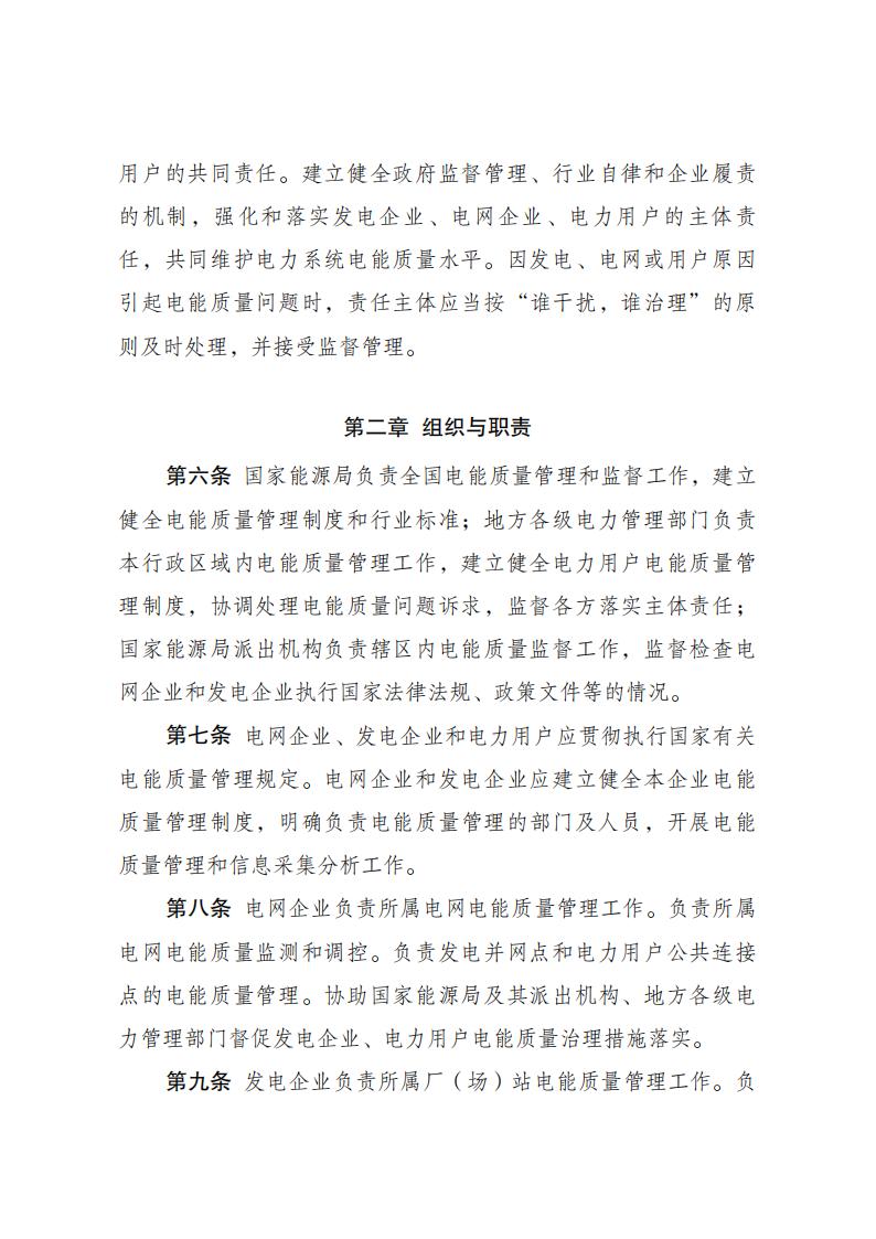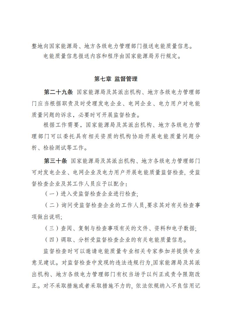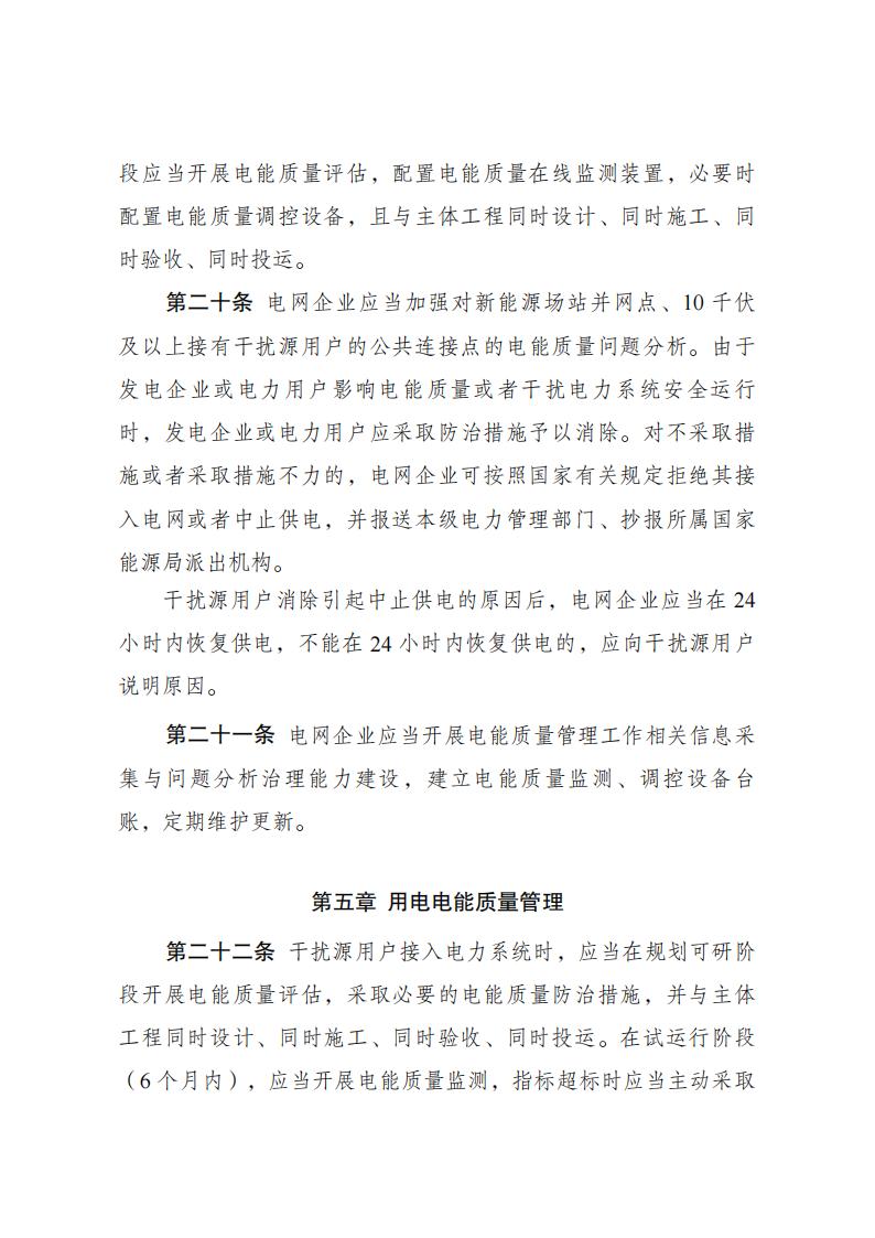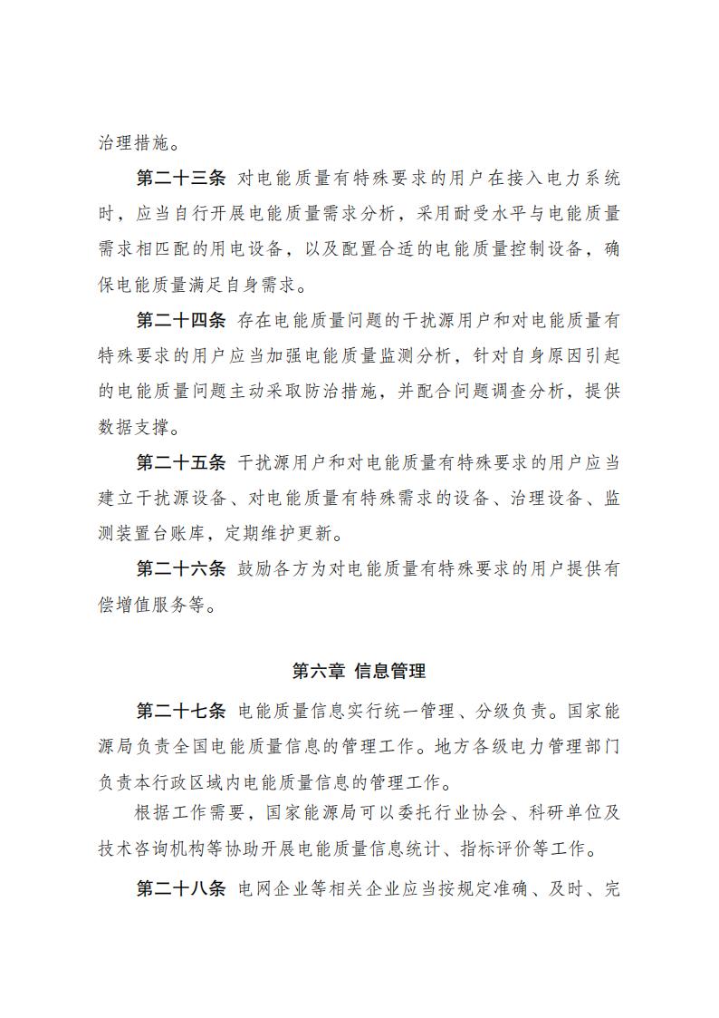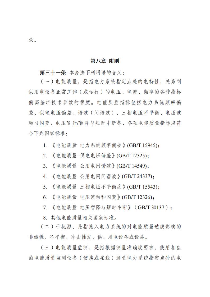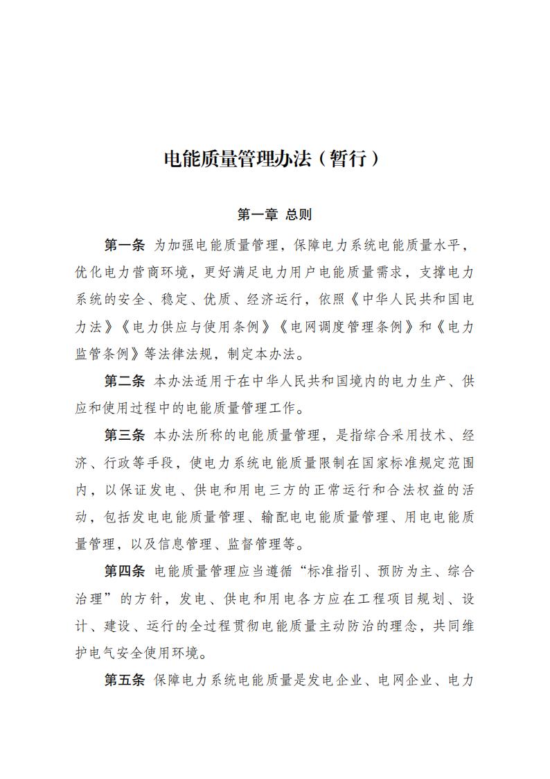 1月10日,國(guó)家發(fā)展和改革委員會(huì)發(fā)布中華人民共和國(guó)國(guó)家發(fā)展和改革委員會(huì)令第8號(hào)?!?/span>電能質(zhì)量管理辦法(暫行)》已經(jīng)2023年12月26日第7次委務(wù)會(huì)議審議通過(guò),現(xiàn)予公布,自2024年4月1日起施行。 原文如下: 中華人民共和國(guó)國(guó)家發(fā)展和改革委員會(huì)令 第8號(hào) 《電能質(zhì)量管理辦法(暫行)》已經(jīng)2023年12月26日第7次委務(wù)會(huì)議審議通過(guò),現(xiàn)予公布,自2024年4月1日起施行。 主任:鄭柵潔 2023年12月27日