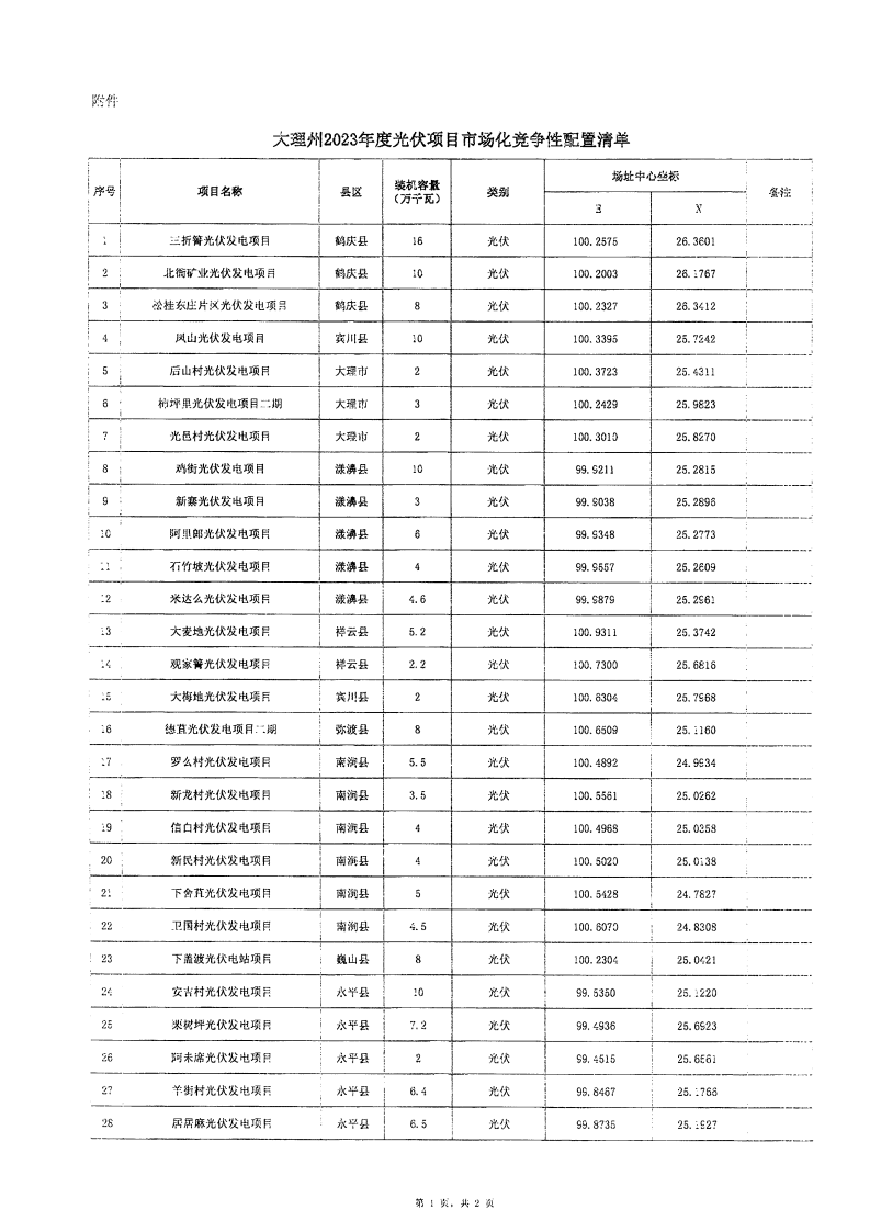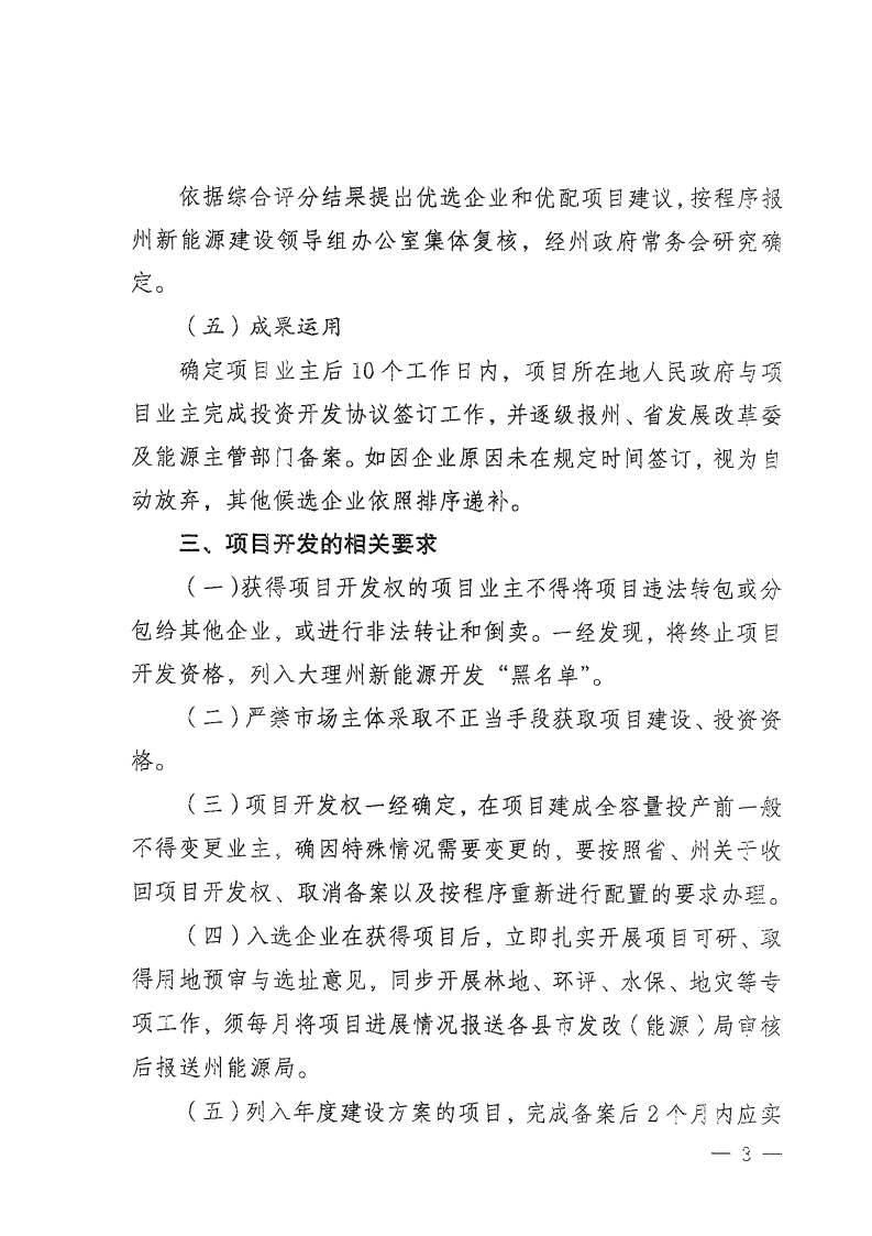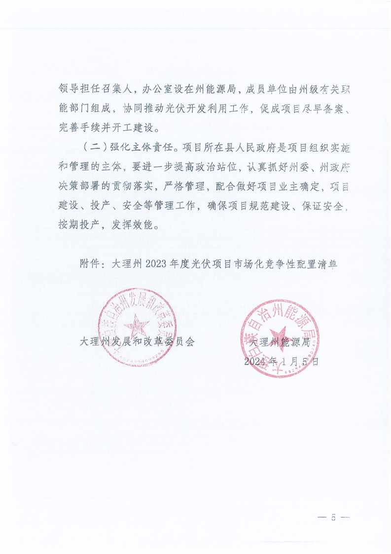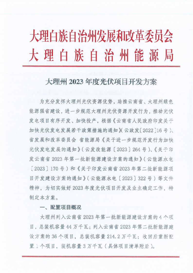 1月5日,云南大理白族自治州人民政府發(fā)布大理州2023年度光伏項目競爭性配置公告,其中明確,光伏發(fā)電項目按照裝機(jī)的10%配置調(diào)節(jié)資源,由州發(fā)展和改革委、州能源局統(tǒng)籌,可通過自建新型儲能設(shè)施、購買共享儲能服務(wù)和購買燃煤發(fā)電系統(tǒng)調(diào)節(jié)服務(wù)等方式實現(xiàn)。 根據(jù)《大理州2023年度光伏項目開發(fā)方案》,大理州列入云南省2023年第一批新能源建設(shè)方案的4個項目,總裝機(jī)容量44萬千瓦;列入云南省2023年第二批新能源建設(shè)方案的36個項目,總裝機(jī)容量214.2萬千瓦;收回后重新配置1個項目,裝機(jī)容量3萬千瓦。合計規(guī)模261.2萬千瓦。 根據(jù)項目開發(fā)方案要求:列入年度建設(shè)方案的項目,完成備案后2個月內(nèi)應(yīng)實現(xiàn)開工(辦理用林用地、環(huán)保水保、接入系統(tǒng)審批等開工前期手續(xù)的時間可剔除,剔除時間最長不超過2個月),原則上開工后8個月內(nèi)應(yīng)具備投產(chǎn)條件,自開工之日起1年內(nèi)應(yīng)具備全容量并網(wǎng)條件。 原文如下: 大理州發(fā)展和改革委員會、大理州能源局關(guān)于大理州2023年度光伏項目競爭性配置公告
