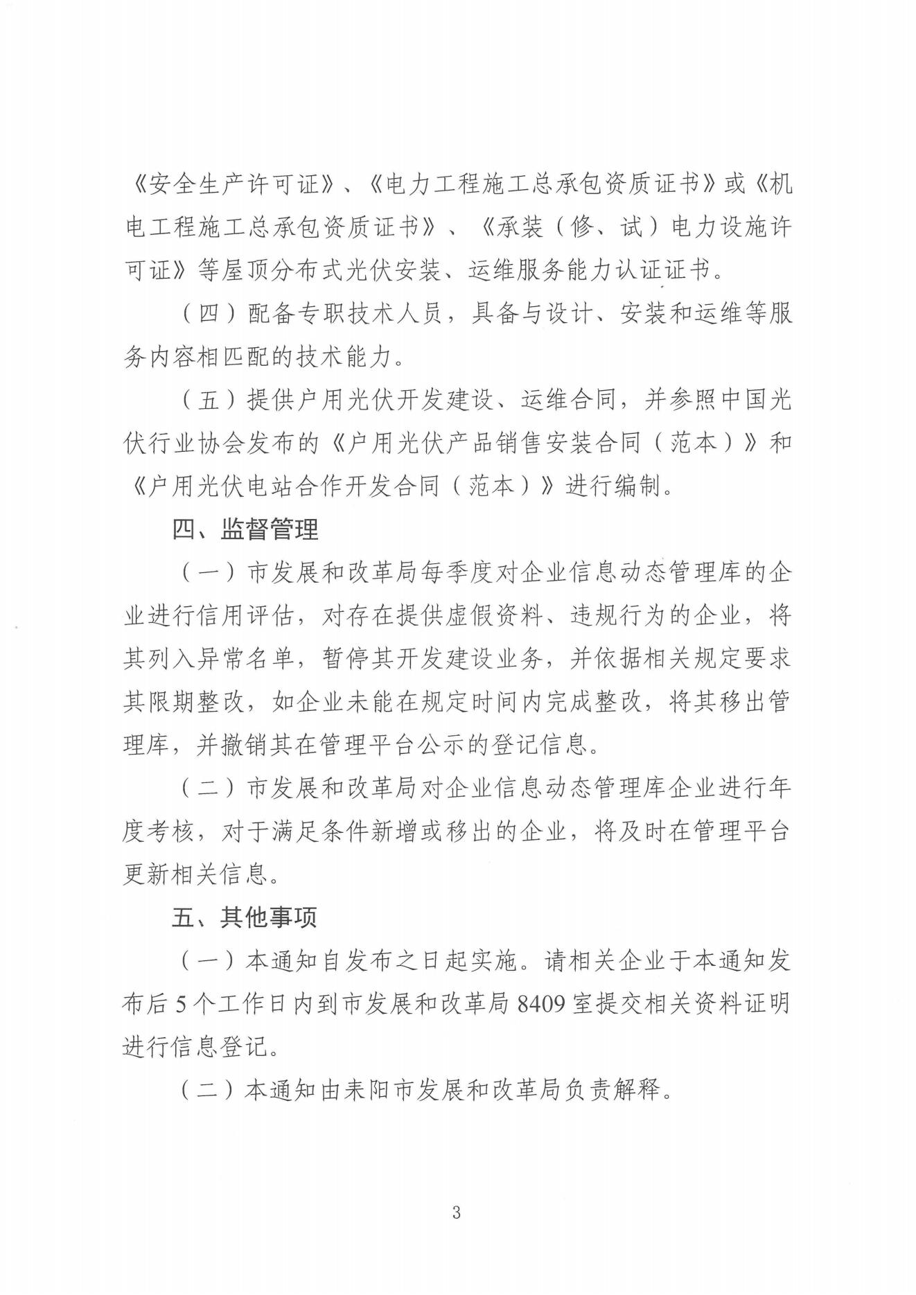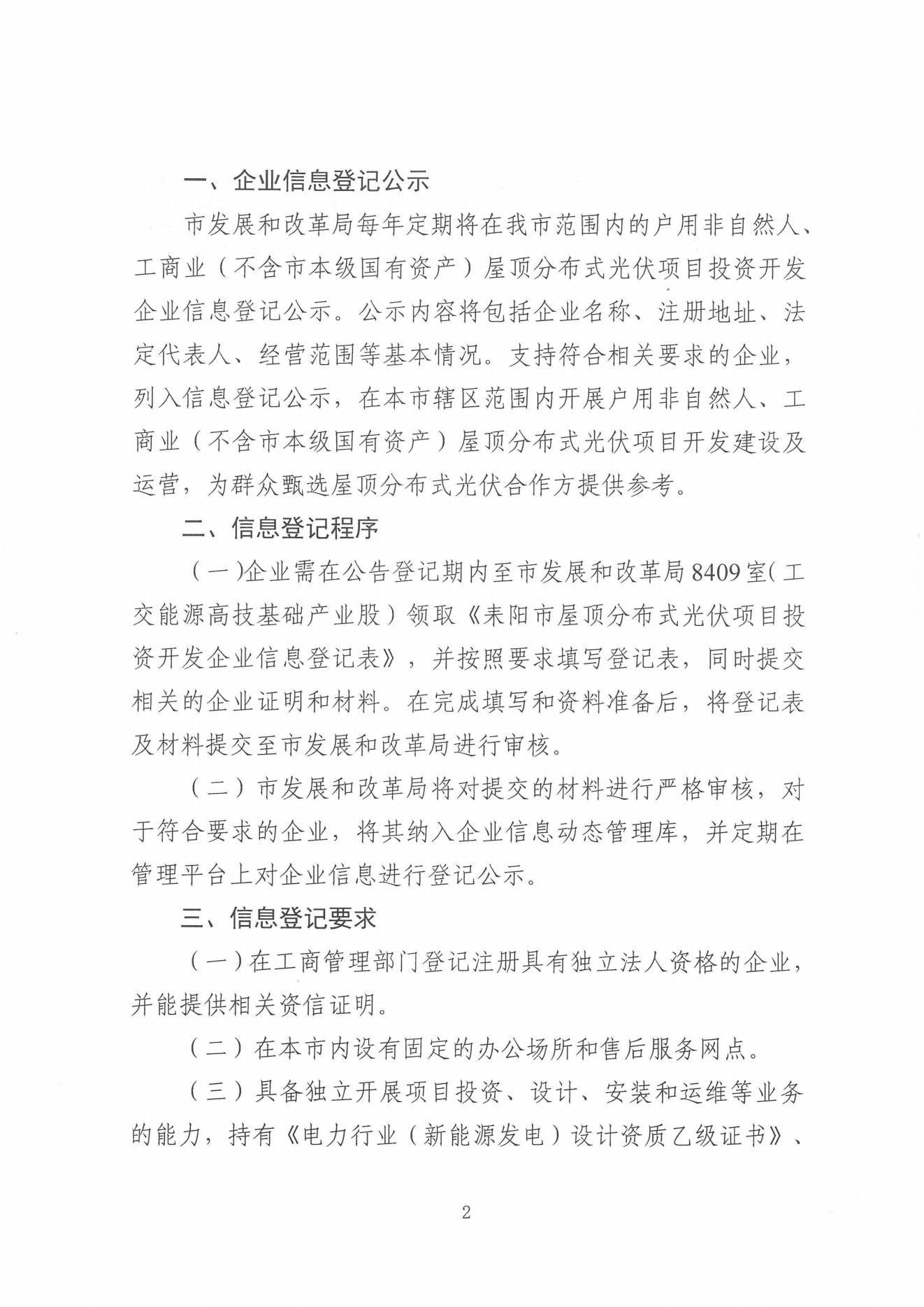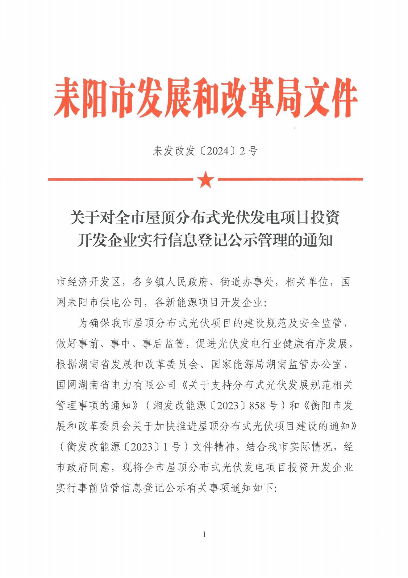 1月17日,湖南省耒陽市人民政府發(fā)布關于對全市屋頂分布式光伏發(fā)電項目投資開發(fā)企業(yè)實行信息登記公示管理的通知。 通知指出,耒陽市發(fā)展和改革局每年定期將在耒陽市范圍內的戶用非自然人、工商業(yè)(不含市本級國有資產)屋頂分布式光伏項目投資開發(fā)企業(yè)信息登記公示。公示內容將包括企業(yè)名稱、注冊地址、法定代表人、經營范圍等基本情況。支持符合相關要求的企業(yè),列入信息登記公示,在本市轄區(qū)范圍內開展戶用非自然人、工商業(yè)(不含市本級國有資產)屋頂分布式光伏項目開發(fā)建設及運營,為群眾甄選屋頂分布式光伏合作方提供參考。 原文如下: