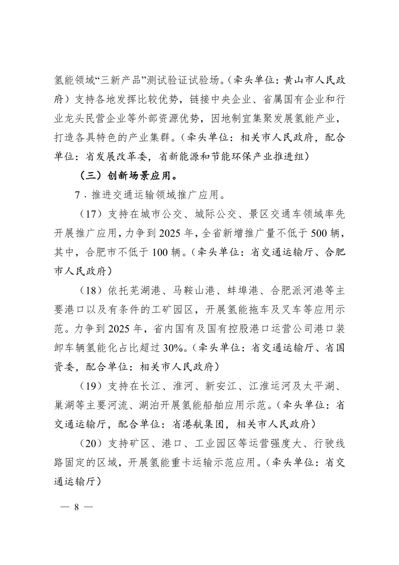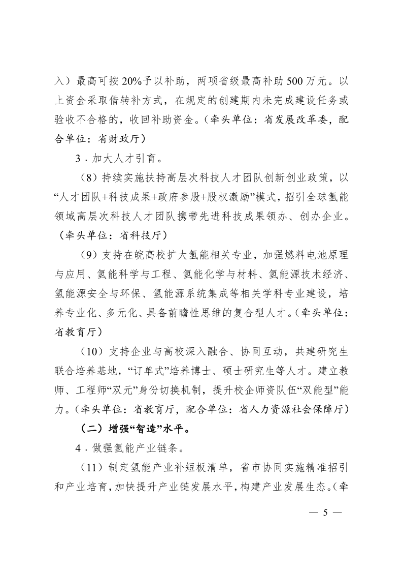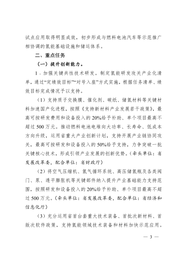 近日,安徽省發(fā)改委正式發(fā)布《安徽省氫能產(chǎn)業(yè)高質(zhì)量發(fā)展三年行動計劃》,文件提出,力爭通過3年左右的努力,到2025年,建成國內(nèi)重要的氫能產(chǎn)業(yè)發(fā)展高地。產(chǎn)業(yè)總產(chǎn)值達到500億元以上,燃料電池車輛推廣量達到2000輛以上、氫能船舶運營10艘以上、建成加氫站(包括合建站)數(shù)量達到30座,建成1個以上氫能產(chǎn)業(yè)特色園區(qū)。 文件提出獎補措施: 支持質(zhì)子交換膜、催化劑、碳紙、儲氫材料等關(guān)鍵材料加速國產(chǎn)化進程,按照《支持新材料產(chǎn)業(yè)發(fā)展若干政策》,最高可按研發(fā)費用和設(shè)備投入的20%給予補助、單個項目最高不超過500萬元。 推動燃料電池電堆向大功率、長壽命、低成本方向升級,運用省重大產(chǎn)業(yè)創(chuàng)新計劃,支持開展產(chǎn)業(yè)鏈協(xié)同攻關(guān),最高可按研發(fā)和設(shè)備投入的50%給予支持。 將空氣壓縮機、氫氣循環(huán)系統(tǒng)、高壓儲氫瓶及各類閥門、泵、透平膨脹機等關(guān)鍵部件納入提升產(chǎn)業(yè)基礎(chǔ)能力支持范圍,按照研發(fā)和設(shè)備投入的20%給予補助、單個項目最高不超過500萬元。 充分運用省首臺套重大技術(shù)裝備、首批次新材料、首版次軟件政策,支持氫能領(lǐng)域技術(shù)裝備和材料加快示范應(yīng)用。 對經(jīng)評定的產(chǎn)業(yè)公共服務(wù)平臺項目,綜合采取“貼息+補助”方式,對項目建設(shè)貸款按照40%給予貼息;對固定資產(chǎn)投入(不含土地投入)最高可按20%予以補助,兩項省級最高補助500萬元。以上資金采取借轉(zhuǎn)補方式,在規(guī)定的創(chuàng)建期內(nèi)未完成建設(shè)任務(wù)或驗收不合格的,收回補助資金。 推進加氫站建設(shè)。對建成投用的500公斤及以上的加氫站(對應(yīng)用于工業(yè)用等特殊場景的撬裝站和氫燃料電池船舶場景的加氫站,日加氫能力100公斤及以上),省級按加氫站(撬裝站)固定資產(chǎn)投入(不含土地價款)的50%予以補助,每站省級最高補助300萬元。對日加氫能力1000公斤及以上的加氫站(對應(yīng)用于工業(yè)用等特殊場景的撬裝站和氫燃料電池船舶場景的加氫站,日加氫能力300公斤及以上),每站省級最高補助500萬元。 原文如下: 上一篇: 上海市級重大氫能項目正式開工!