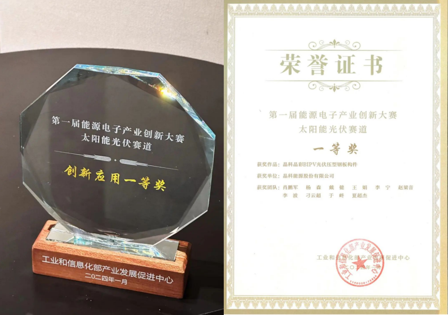 2024年1月3日至5日,工信部產(chǎn)業(yè)發(fā)展促進(jìn)中心和宜賓市人民政府共同主辦的第一屆能源電子產(chǎn)業(yè)創(chuàng)新大賽太陽能光伏賽道決賽暨頒獎(jiǎng)儀式于四川省宜賓市成功舉辦。 晶科能源參賽作品「晶科晶彩BIPV光伏壓型鋼板構(gòu)件產(chǎn)品」,經(jīng)過審查、初賽、決賽層層角逐,在174項(xiàng)作品中脫穎而出,榮獲太陽能光伏賽道創(chuàng)新應(yīng)用類一等獎(jiǎng)!