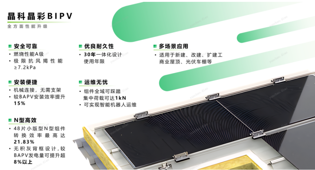 本次大賽以「光伏引領(lǐng)、綠色賦能」為主題,圍繞產(chǎn)業(yè)鏈各環(huán)節(jié)痛點(diǎn)、難點(diǎn)、卡脖子等共性問題設(shè)有創(chuàng)新創(chuàng)意、創(chuàng)新產(chǎn)品及創(chuàng)新應(yīng)用三類賽題。 晶科晶彩BIPV光伏壓型鋼板構(gòu)件不僅具有高效的發(fā)電性能,同時(shí)具有優(yōu)異的安全可靠的建筑屬性。采用自研夾具安裝,支持全域可踩踏特性,具有30年一體化壽命。解決傳統(tǒng)分布式光伏裝機(jī)量低、與建筑壽命不同步、防水、防火、抗風(fēng)性能差、不可踩踏等問題。晶科深入系統(tǒng)的研究光伏屋面可踩踏性能并形成多項(xiàng)國(guó)際發(fā)明專利及國(guó)際標(biāo)準(zhǔn)提案,國(guó)際首創(chuàng)BIPV組件接線頭懸空固定方式及專利線卡,有效防止直流拉弧、燒穿屋面的風(fēng)險(xiǎn)。產(chǎn)品低成本高收益、安全可靠,經(jīng)濟(jì)效益、社會(huì)效益顯著。多項(xiàng)技術(shù)處于國(guó)內(nèi)領(lǐng)先水平。