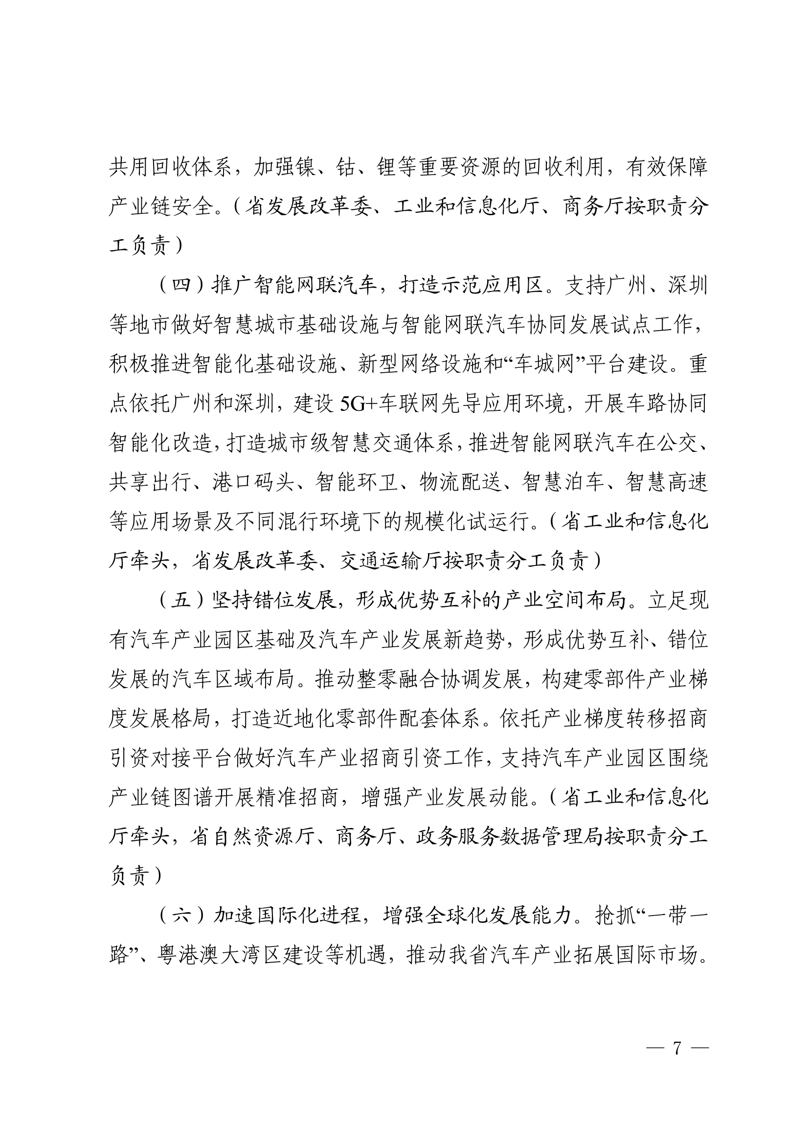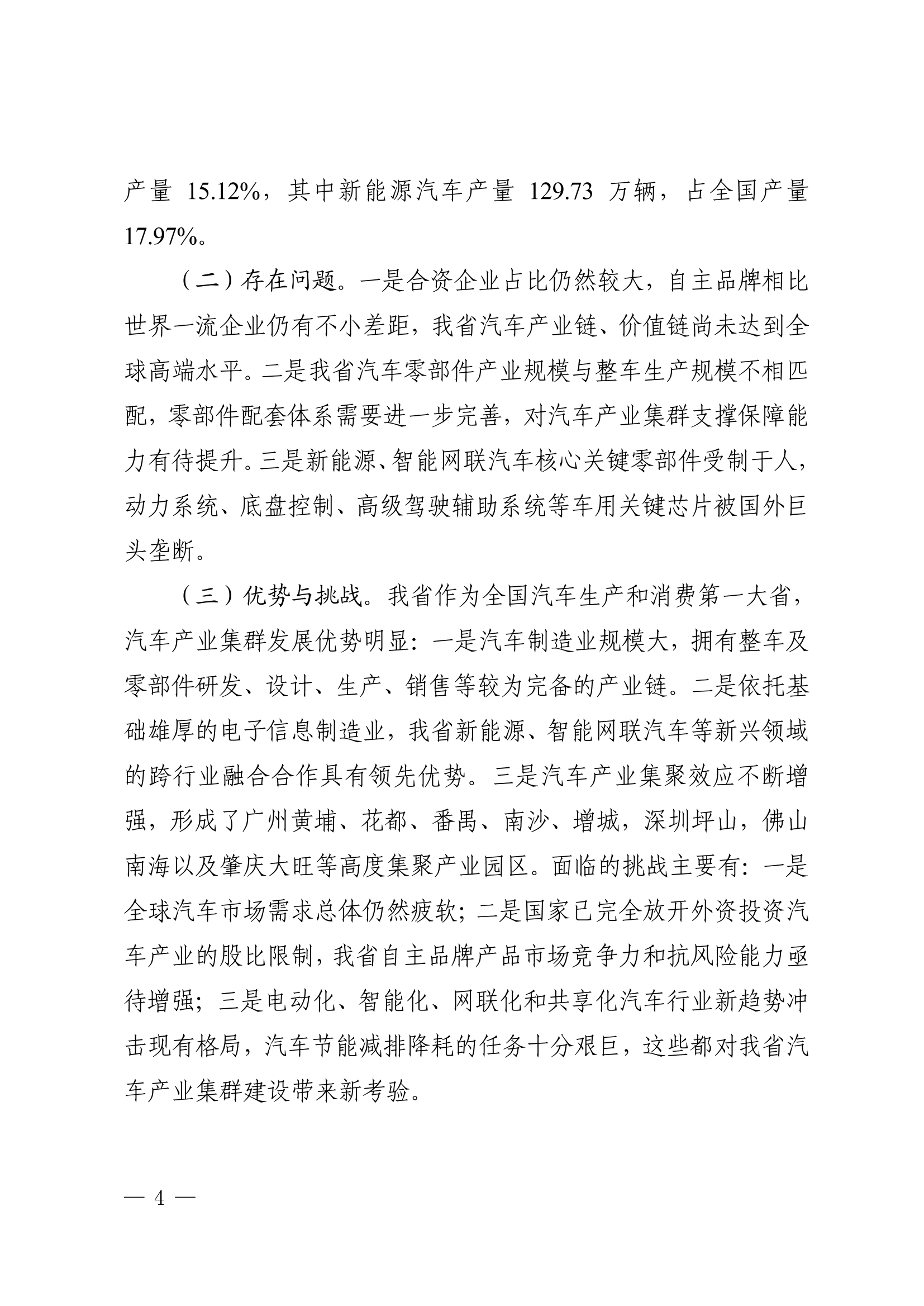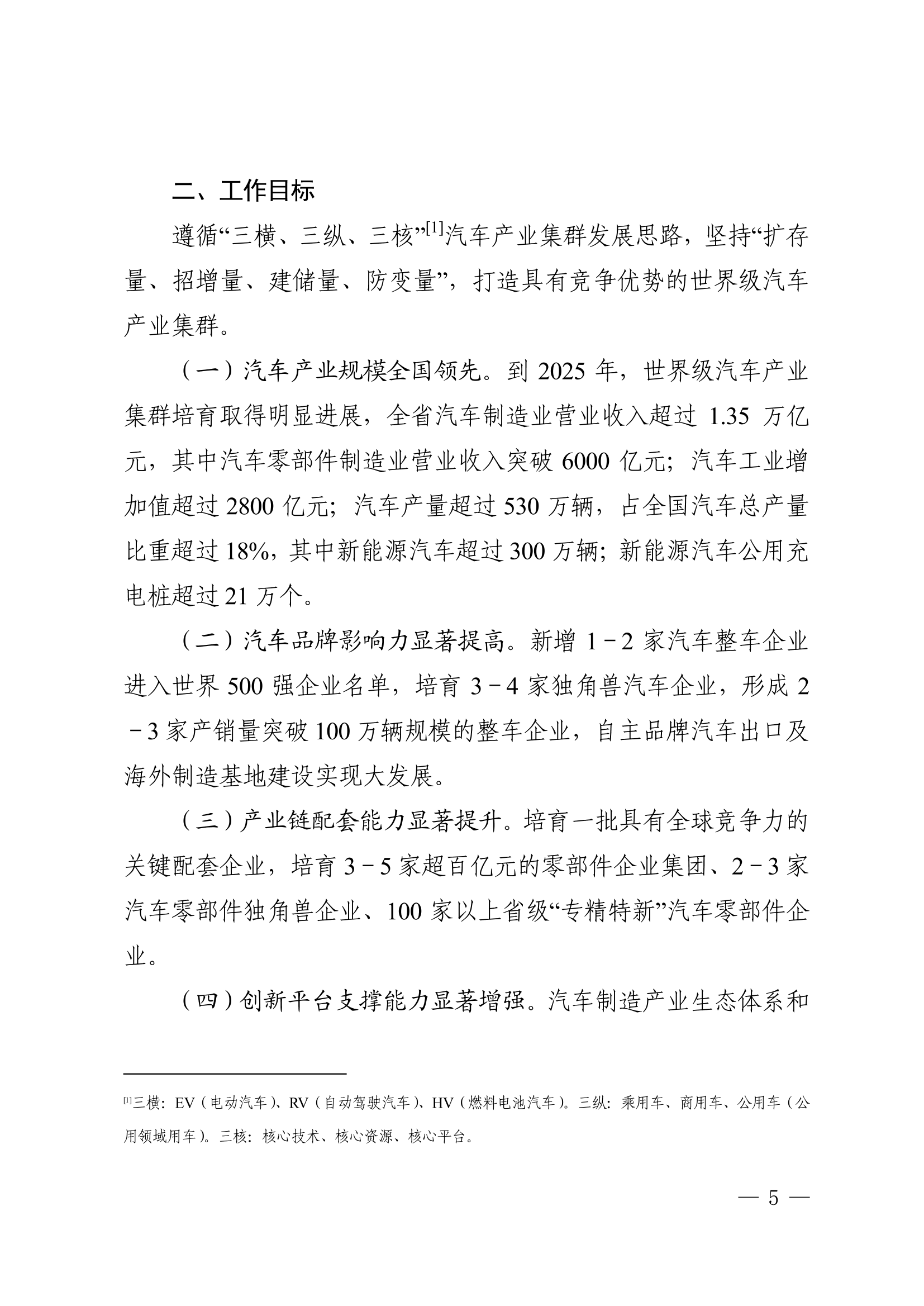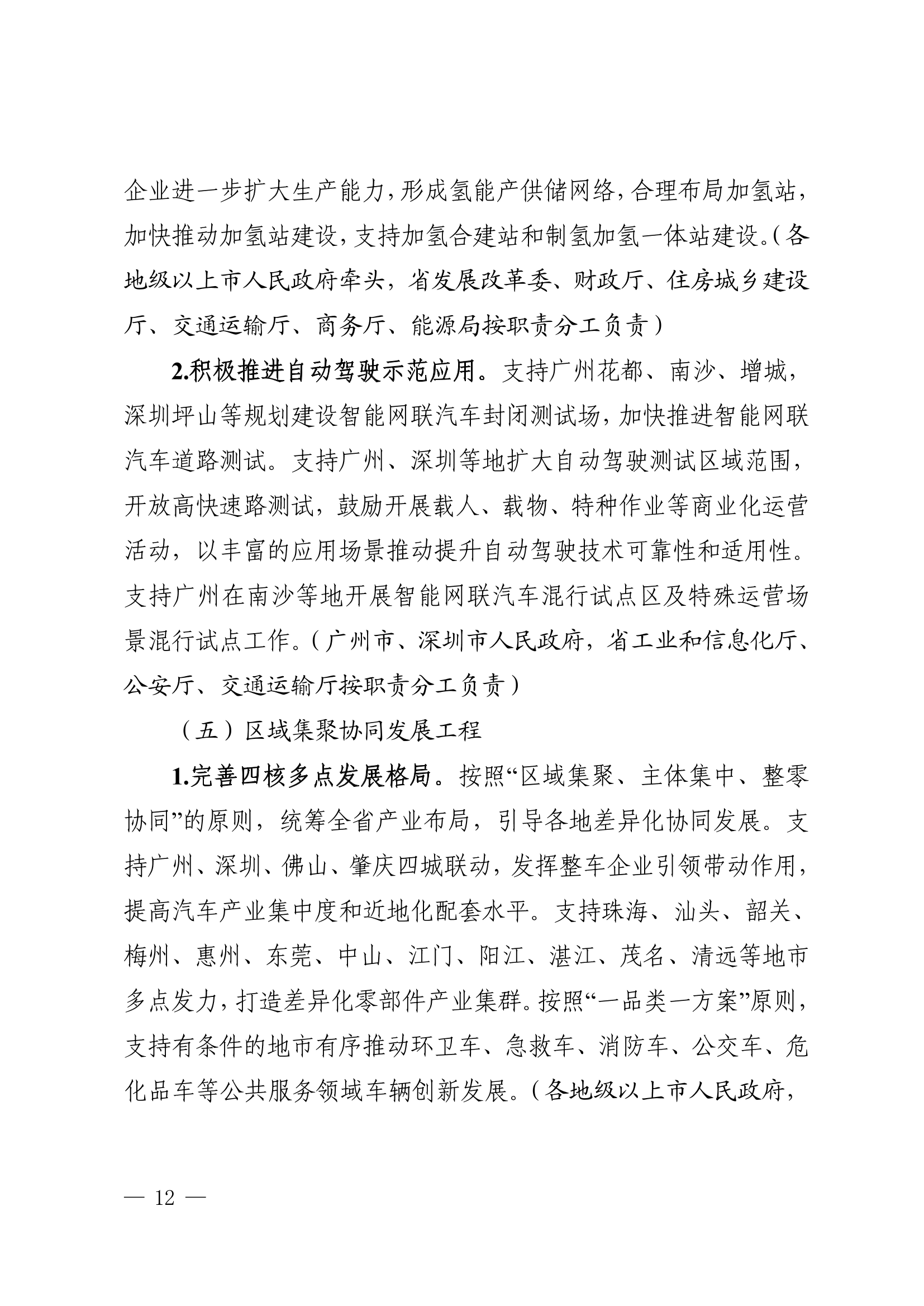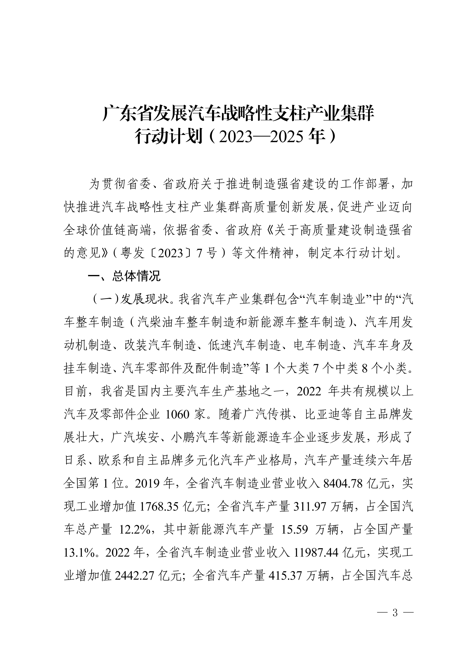 1月17日,廣東工信廳等印發(fā)《廣東省發(fā)展汽車戰(zhàn)略性支柱產(chǎn)業(yè)集群行動(dòng)計(jì)劃(2023—2025年)》,文件提出目標(biāo):到2025年,新能源汽車超過300萬輛,新能源汽車公用充電樁超過21萬個(gè)。 積極引導(dǎo)使用新能源汽車。落實(shí)促進(jìn)汽車消費(fèi)系列政策措施,支持新能源汽車購買使用,加快活躍二手車市場。進(jìn)一步推動(dòng)城市公共服務(wù)領(lǐng)域充換電基礎(chǔ)設(shè)施和居民區(qū)充電樁建設(shè),構(gòu)建適度超前、布局均衡、智能高效的充換電基礎(chǔ)設(shè)施體系。支持制氫、加氫、儲(chǔ)運(yùn)設(shè)備企業(yè)進(jìn)一步擴(kuò)大生產(chǎn)能力,形成氫能產(chǎn)供儲(chǔ)網(wǎng)絡(luò),合理布局加氫站,加快推動(dòng)加氫站建設(shè),支持加氫合建站和制氫加氫一體站建設(shè)。 積極推進(jìn)自動(dòng)駕駛示范應(yīng)用。支持廣州花都、南沙、增城,深圳坪山等規(guī)劃建設(shè)智能網(wǎng)聯(lián)汽車封閉測(cè)試場,加快推進(jìn)智能網(wǎng)聯(lián)汽車道路測(cè)試。支持廣州、深圳等地?cái)U(kuò)大自動(dòng)駕駛測(cè)試區(qū)域范圍,開放高快速路測(cè)試,鼓勵(lì)開展載人、載物、特種作業(yè)等商業(yè)化運(yùn)營活動(dòng),以豐富的應(yīng)用場景推動(dòng)提升自動(dòng)駕駛技術(shù)可靠性和適用性。支持廣州在南沙等地開展智能網(wǎng)聯(lián)汽車混行試點(diǎn)區(qū)及特殊運(yùn)營場景混行試點(diǎn)工作。 原文及解讀如下: 《廣東省發(fā)展汽車戰(zhàn)略性支柱產(chǎn)業(yè)集群行動(dòng)計(jì)劃(2023—2025年)》政策解讀 一、制定背景 為貫徹省委、省政府關(guān)于推進(jìn)制造強(qiáng)省建設(shè)的工作部署,2020年9月省工業(yè)和信息化廳會(huì)同省發(fā)展改革委、科技廳、商務(wù)廳、市場監(jiān)管局聯(lián)合印發(fā)了《廣東省發(fā)展汽車戰(zhàn)略性支柱產(chǎn)業(yè)集群行動(dòng)計(jì)劃(2021—2025年)》,加快發(fā)展汽車戰(zhàn)略性支柱產(chǎn)業(yè)集群,促進(jìn)產(chǎn)業(yè)邁向全球價(jià)值鏈高端。 2023年,按照省委、省政府關(guān)于堅(jiān)持制造業(yè)當(dāng)家、推進(jìn)新型工業(yè)化高質(zhì)量建設(shè)制造強(qiáng)省等工作要求,結(jié)合我省汽車產(chǎn)業(yè)集群發(fā)展情況,對(duì)《廣東省發(fā)展汽車戰(zhàn)略性支柱產(chǎn)業(yè)集群行動(dòng)計(jì)劃(2021—2025年)》相關(guān)內(nèi)容進(jìn)行了修訂,在充分征求各地級(jí)以上市政府、省有關(guān)部門等相關(guān)單位的意見基礎(chǔ)上,形成了《廣東省發(fā)展汽車戰(zhàn)略性支柱產(chǎn)業(yè)集群行動(dòng)計(jì)劃(2023—2025年)》(簡稱汽車產(chǎn)業(yè)集群行動(dòng)計(jì)劃),以便政策文件更好地適應(yīng)新形勢(shì)新要求,加快推進(jìn)汽車產(chǎn)業(yè)集群高質(zhì)量創(chuàng)新發(fā)展。 經(jīng)省政府同意,省工業(yè)和信息化廳聯(lián)合省發(fā)展改革委、科技廳、商務(wù)廳、市場監(jiān)管局于2023年12月印發(fā)實(shí)施汽車產(chǎn)業(yè)集群行動(dòng)計(jì)劃。 二、我省汽車產(chǎn)業(yè)集群發(fā)展總體情況 省委、省政府歷來高度重視汽車產(chǎn)業(yè)工作,將汽車產(chǎn)業(yè)作為我省十大戰(zhàn)略性支柱產(chǎn)業(yè)之一,完善政策措施,深化改革創(chuàng)新,加大要素供給,推動(dòng)汽車產(chǎn)業(yè)發(fā)展取得新成效。廣東是全國汽車生產(chǎn)第一大省,廣汽傳祺、比亞迪等自主品牌發(fā)展壯大,廣汽埃安、小鵬汽車等新能源造車企業(yè)逐步發(fā)展,形成了日系、歐系和自主品牌多元化汽車產(chǎn)業(yè)格局。2022年,廣東汽車產(chǎn)量達(dá)415.37萬輛,占全國汽車總產(chǎn)量15.12%,連續(xù)六年居全國第一,其中新能源汽車產(chǎn)量129.73萬輛,占全國產(chǎn)量17.97%。2022年全省汽車制造業(yè)實(shí)現(xiàn)工業(yè)增加值2442.27億元,營業(yè)收入11987.44億元,首次超萬億元,成為廣東第八個(gè)萬億級(jí)產(chǎn)業(yè)集群。 三、汽車產(chǎn)業(yè)集群行動(dòng)計(jì)劃的目標(biāo)任務(wù) 本行動(dòng)計(jì)劃界定的范圍包含“汽車制造業(yè)”中的“汽車整車制造(汽柴油車整車制造和新能源車整車制造)、汽車用發(fā)動(dòng)機(jī)制造、改裝汽車制造、低速汽車制造、電車制造、汽車車身及掛車制造、汽車零部件及配件制造”等1個(gè)大類7個(gè)中類8個(gè)小類。 (一)總體目標(biāo)。 一是汽車產(chǎn)業(yè)規(guī)模全國領(lǐng)先。到2025年,世界級(jí)汽車產(chǎn)業(yè)集群培育取得明顯進(jìn)展,全省汽車制造業(yè)營業(yè)收入超過1.35萬億元,汽車產(chǎn)量超過530萬輛,其中新能源汽車超過300萬輛。 二是汽車品牌影響力顯著提高。新增1-2家汽車整車企業(yè)進(jìn)入世界500強(qiáng)企業(yè)名單,培育3-4家獨(dú)角獸汽車企業(yè),形成2-3家產(chǎn)銷量突破100萬輛規(guī)模的整車企業(yè),自主品牌汽車出口及海外制造基地建設(shè)實(shí)現(xiàn)大發(fā)展。 三是產(chǎn)業(yè)鏈配套能力顯著提升。培育一批具有全球競爭力的關(guān)鍵配套企業(yè),培育3-5家超百億元的零部件企業(yè)集團(tuán)、2-3家汽車零部件獨(dú)角獸企業(yè)、100家以上省級(jí)“專精特新”汽車零部件企業(yè)。 四是創(chuàng)新平臺(tái)支撐能