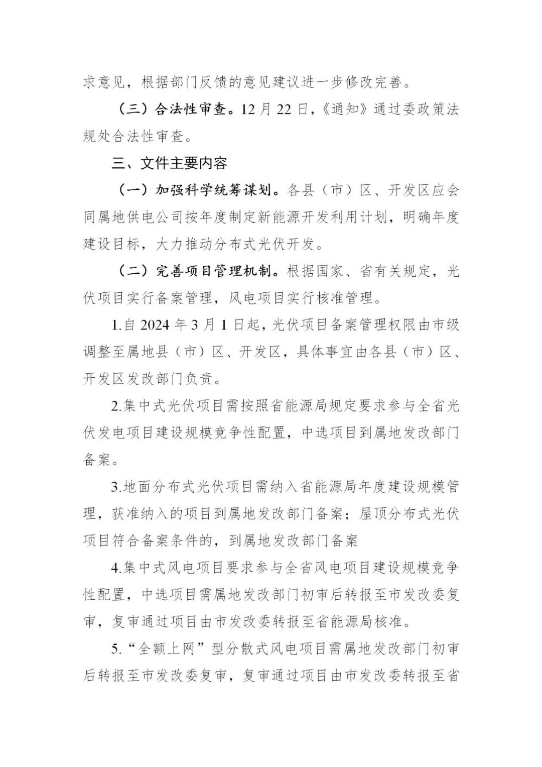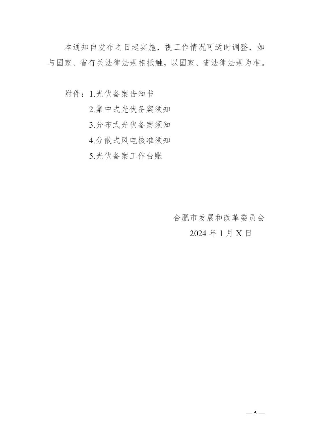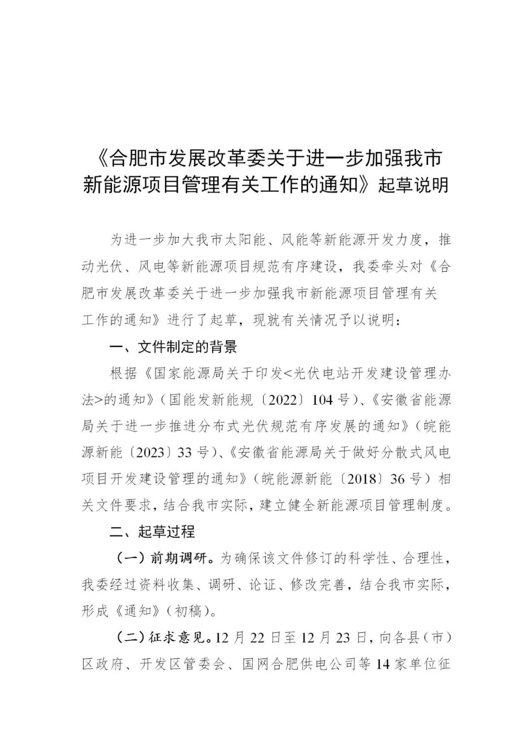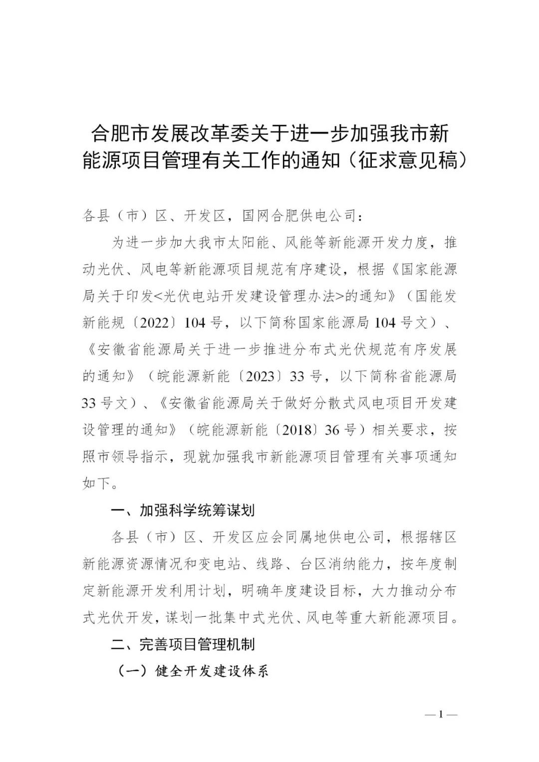 1月26日,合肥市發(fā)改委發(fā)布關(guān)于公開(kāi)征求《合肥市發(fā)展改革委關(guān)于進(jìn)一步加強(qiáng)我市新能源項(xiàng)目管理有關(guān)工作的通知(征求意見(jiàn)稿)》意見(jiàn)建議的公告。 根據(jù)文件,集中式光伏項(xiàng)目需按照省能源局規(guī)定要求參與全省光伏發(fā)電項(xiàng)目建設(shè)規(guī)模競(jìng)爭(zhēng)性配置,中選項(xiàng)目到屬地發(fā)改部門(mén)備案。 分布式光伏項(xiàng)目分為兩種:地面分布式光伏項(xiàng)目需納入省能源局年度建設(shè)規(guī)模管理,獲準(zhǔn)納入的項(xiàng)目到屬地發(fā)改部門(mén)備案;屋頂分布式光伏項(xiàng)目符合備案條件的,到屬地發(fā)改部門(mén)備案。 鼓勵(lì)分布式光伏項(xiàng)目并網(wǎng)就近消納。單點(diǎn)接入小于6兆瓦的工商業(yè)分布式光伏項(xiàng)目和戶用光伏項(xiàng)目按照就近消納原則,在具備接入容量的區(qū)域開(kāi)發(fā)建設(shè),暫不納入年度建設(shè)規(guī)模管理。 統(tǒng)籌分布式光伏項(xiàng)目并網(wǎng)規(guī)模管理。新增備案小于6兆瓦的地面光伏電站(包括利用坑塘水面、結(jié)合農(nóng)業(yè)大棚、牲畜養(yǎng)殖等建設(shè)的光伏電站項(xiàng)目)納入年度建設(shè)規(guī)模管理,未納入年度建設(shè)規(guī)模的項(xiàng)目不得開(kāi)工建設(shè)、不得并網(wǎng)。8月26日前(含8月26日)已備案的小于6兆瓦的地面光伏電站,落實(shí)電網(wǎng)接入消納條件后可開(kāi)工建設(shè),2023年12月底前未并網(wǎng)的,比照新增項(xiàng)目管理。 根據(jù)國(guó)家能源局104號(hào)文、省能源局33號(hào)文有關(guān)規(guī)定,自2024年3月1日起,光伏項(xiàng)目備案管理權(quán)限由市級(jí)調(diào)整至屬地縣(市)區(qū)、開(kāi)發(fā)區(qū),具體事宜由各縣(市)區(qū)、開(kāi)發(fā)區(qū)發(fā)改部門(mén)負(fù)責(zé)。 反饋截止日期為2024年2月7日。 原文如下: 關(guān)于公開(kāi)征求《合肥市發(fā)展改革委關(guān)于進(jìn)一步加強(qiáng)我市新能源項(xiàng)目管理有關(guān)工作的通知(征求意見(jiàn)稿)》意見(jiàn)建議的公告 為進(jìn)一步加大我市太陽(yáng)能、風(fēng)能等新能源開(kāi)發(fā)力度,推動(dòng)光伏、風(fēng)電等新能源項(xiàng)目規(guī)范有序建設(shè),根據(jù)國(guó)家、省有關(guān)規(guī)定,結(jié)合我市實(shí)際,我委起草了《合肥市發(fā)展改革委關(guān)于進(jìn)一步加強(qiáng)我市新能源項(xiàng)目管理有關(guān)工作的通知(征求意見(jiàn)稿)》,現(xiàn)向社會(huì)公開(kāi)征求意見(jiàn)。歡迎社會(huì)各界人士通過(guò)以下途徑和方式提出意見(jiàn)建議,反饋截止日期為2024年2月7日,來(lái)信請(qǐng)注明來(lái)文單位、個(gè)人及聯(lián)系方式: 1.電子郵件:hfsfgwxnyc@163.com,郵件標(biāo)題請(qǐng)注明“合肥市發(fā)展改革委關(guān)于進(jìn)一步加強(qiáng)我市新能源項(xiàng)目管理有關(guān)工作的通知(征求意見(jiàn)稿)”公開(kāi)征求意見(jiàn)”字樣。 2.通信地址:合肥市蜀山區(qū)東流路100號(hào)市政務(wù)中心B座1206室(合肥市發(fā)改委新型能源發(fā)展處,郵政編碼:230071),信封上請(qǐng)注明“合肥市發(fā)展改革委關(guān)于進(jìn)一步加強(qiáng)我市新能源項(xiàng)目管理有關(guān)工作的通知(征求意見(jiàn)稿)”公開(kāi)征求意見(jiàn)”字樣。 3.通過(guò)本網(wǎng)站調(diào)查征集欄目直接留言。 聯(lián)系人:張凱,聯(lián)系電話:0551-63538162 附件1:合肥市發(fā)展改革委關(guān)于進(jìn)一步加強(qiáng)我市新能源項(xiàng)目管理有關(guān)工作的通知(征求意見(jiàn)稿) 附件2:《合肥市發(fā)展改革委關(guān)于進(jìn)一步加強(qiáng)我市新能源項(xiàng)目管理有關(guān)工作的通知》起草說(shuō)明