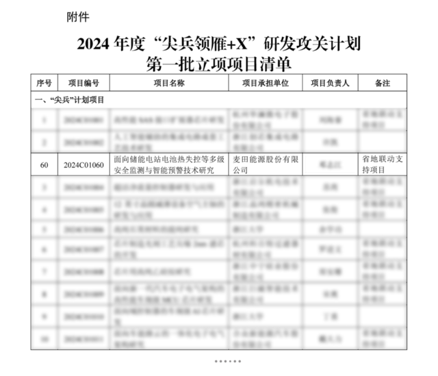 近日,隨著浙江省科學技術廳《關于下達2024年度“尖兵領雁+X”研發(fā)攻關計劃第一批項目的通知》發(fā)布及正式簽約,麥田能源面向儲能電站的“電池熱失控等多級安全監(jiān)測與智能預警技術研究”項目順利獲得立項,作為“尖兵”項目入選浙江省《2024年度“尖兵領雁+X”研發(fā)攻關計劃第一批立項項目清單》。 浙江省“尖兵領雁+X”項目清單 “尖兵領雁+X”研發(fā)攻關計劃由浙江省級財政資金設立,面向世界科技前沿、面向經濟主戰(zhàn)場、面向國家和浙江重大需求、面向人民生命健康,開展重點技術領域的前沿科學問題研究、重大關鍵核心技術攻關、重大社會公益性研究、重大國際科技合作等研究活動的科技計劃,入選項目最高可獲得超過1000萬元的省科技專項資金補助。 其中,麥田能源所入選的“尖兵計劃”以實現(xiàn)技術安全自主可控為目標,按照“急用先行、重點突破”的原則,圍繞數(shù)字安防、射頻芯片、智能網聯(lián)汽車、區(qū)塊鏈、5G、腦機融合、碳捕集利用和封存、智能農機裝備、海洋智能裝備等重點領域,推進1-3年的相對短期、小切口的關鍵核心技術攻關任務。 麥田能源面向儲能電站的“電池熱失控等多級安全監(jiān)測與智能預警技術研究”項目,主要針對規(guī)?;姵貎δ茈娬就哆\中面臨的最為關鍵的安全問題,開展電池失控及火災下的安全防控技術研究。 隨著項目的正式立項并順利進行,不僅能提升麥田能源在工商業(yè)儲能等領域產品的安全防護能力,也將會進一步助力行業(yè)關鍵技術的創(chuàng)新升級,推動清潔能源的發(fā)展和普及,創(chuàng)造更加友好可持續(xù)的全球綠色生態(tài)環(huán)境。
