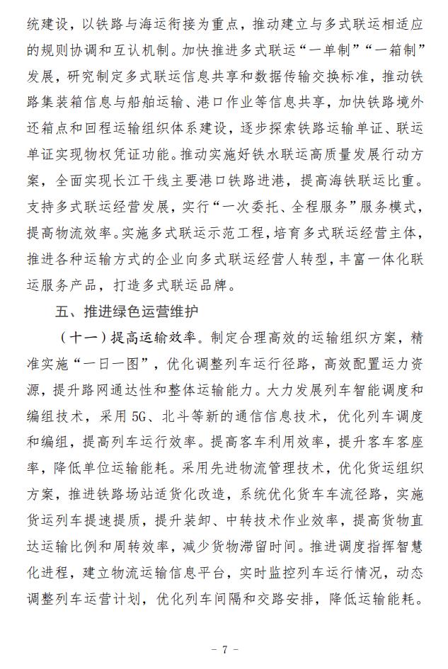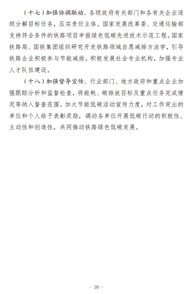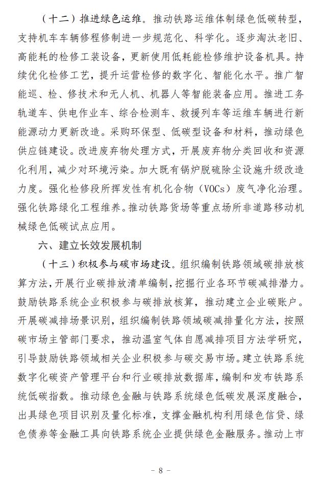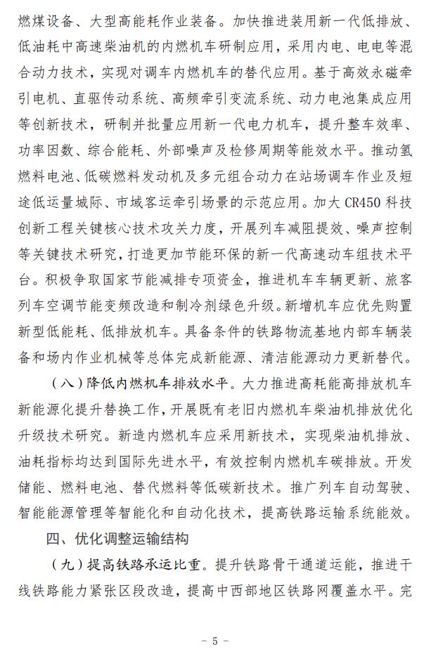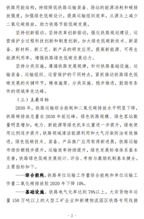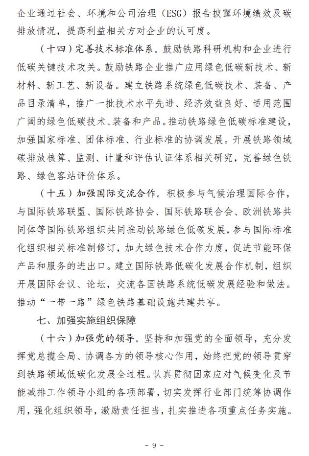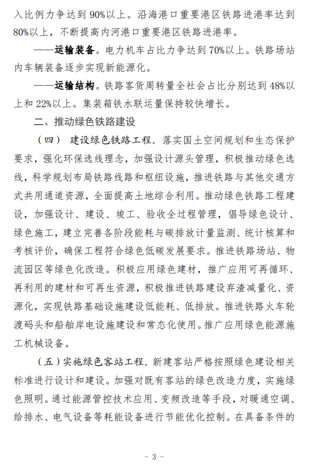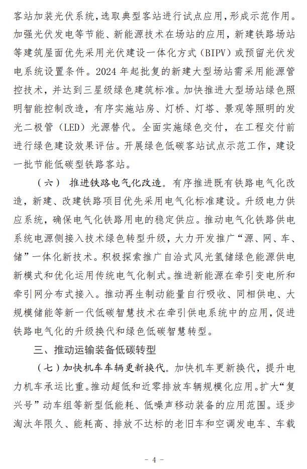 2月5日,國(guó)家鐵路局、國(guó)家發(fā)展改革委、生態(tài)環(huán)境部、交通運(yùn)輸部、國(guó)鐵集團(tuán)聯(lián)合印發(fā)了《推動(dòng)鐵路行業(yè)低碳發(fā)展實(shí)施方案》。 《實(shí)施方案》指明了鐵路行業(yè)低碳發(fā)展的指導(dǎo)思想和基本原則,提出了總體目標(biāo)和主要指標(biāo),并從5方面提出12條重點(diǎn)任務(wù)。一是推動(dòng)綠色鐵路建設(shè)。倡導(dǎo)綠色設(shè)計(jì)、綠色施工,嚴(yán)格按照綠色建設(shè)相關(guān)標(biāo)準(zhǔn)設(shè)計(jì)和新建客站,推動(dòng)既有客站綠色改造,推進(jìn)既有鐵路電氣化改造。二是推動(dòng)運(yùn)輸裝備低碳轉(zhuǎn)型。加快機(jī)車更新?lián)Q代,推動(dòng)超低和近零排放車輛規(guī)模化應(yīng)用,推進(jìn)高耗能高排放機(jī)車新能源化提升替換,降低內(nèi)燃機(jī)車排放水平。三是優(yōu)化調(diào)整運(yùn)輸結(jié)構(gòu)。完善鐵路集疏運(yùn)系統(tǒng),提高鐵路承運(yùn)比重,加強(qiáng)鐵路與其他運(yùn)輸方式銜接,大力推進(jìn)多式聯(lián)運(yùn)發(fā)展。四是推進(jìn)綠色運(yùn)營(yíng)維護(hù)。合理高效開展運(yùn)輸組織,大力發(fā)展列車智能調(diào)度和編組技術(shù),提高運(yùn)輸效率,推動(dòng)運(yùn)維體制綠色低碳轉(zhuǎn)型,降低運(yùn)維環(huán)節(jié)能源消耗和環(huán)境污染。五是建立長(zhǎng)效發(fā)展機(jī)制。積極參與碳市場(chǎng)建設(shè),推動(dòng)鐵路綠色低碳標(biāo)準(zhǔn)建設(shè),積極參與氣候治理國(guó)際合作。 《實(shí)施方案》提出,實(shí)施綠色客站工程。新建客站嚴(yán)格按照綠色建設(shè)相關(guān)標(biāo)準(zhǔn)進(jìn)行設(shè)計(jì)和建設(shè)。加強(qiáng)對(duì)既有客站的綠色改造力度,實(shí)施綠色照明。通過(guò)能源管控技術(shù)應(yīng)用、變頻改造等手段,對(duì)暖通空調(diào)、給排水、電氣設(shè)備等耗能設(shè)備進(jìn)行節(jié)能優(yōu)化控制。在具備條件的客站加裝光伏系統(tǒng),選取典型客站進(jìn)行試點(diǎn)應(yīng)用,形成示范作用。加強(qiáng)光伏發(fā)電等節(jié)能、新能源技術(shù)在場(chǎng)站的應(yīng)用,新建鐵路場(chǎng)站等建筑屋面優(yōu)先采用光伏建設(shè)一體化方式(BIPV)或預(yù)留光伏發(fā)電系統(tǒng)設(shè)置條件。2024年起批復(fù)的新建大型場(chǎng)站需采用能源管控技術(shù),并達(dá)到三星級(jí)綠色建筑標(biāo)準(zhǔn)。加快推進(jìn)大型場(chǎng)站綠色照明智能控制改造,有序?qū)嵤┱痉?、燈橋、燈塔、景觀等照明的發(fā)光二極管(LED)光源替代。全面實(shí)施綠色交付,在工程交付前進(jìn)行綠色建設(shè)效果評(píng)估。開展綠色低碳客站試點(diǎn)示范工作,建設(shè)一批節(jié)能低碳型鐵路客站。