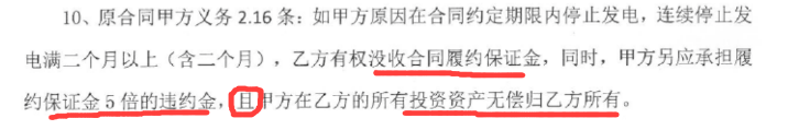 補(bǔ)充協(xié)議條款 此外,廠房拆遷,既定條件由“政府原因”擴(kuò)大至“乙方公司作出重大決策拆遷廠房”,甲方必須無(wú)條件拆除、搬移光伏設(shè)備,且自行承擔(dān)費(fèi)用。超出約定時(shí)間,則沒(méi)收合同履約保證金,并且承擔(dān)履約保證金5倍的違約金,甲方在乙方的所有投資資產(chǎn)無(wú)償歸乙方所有。