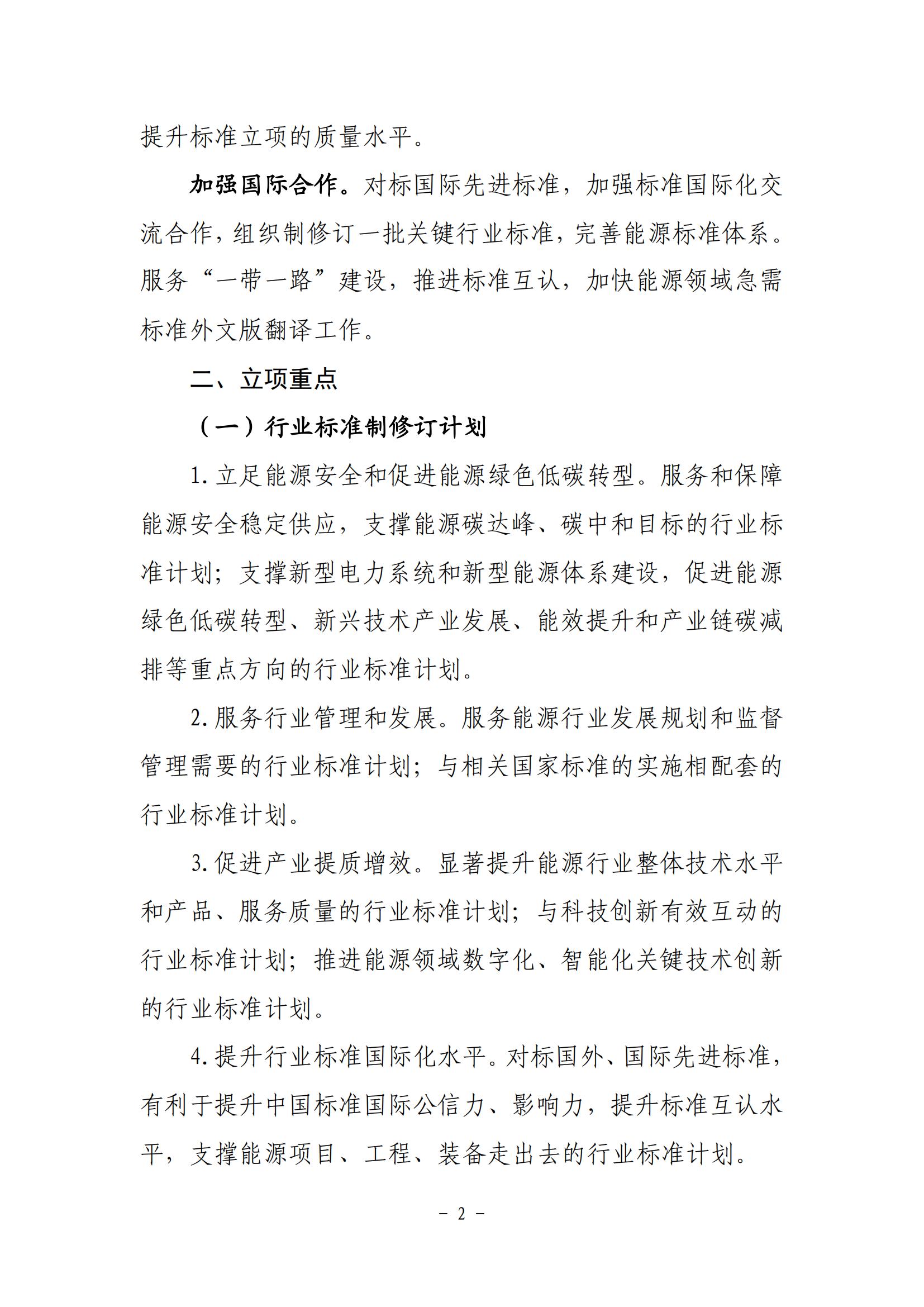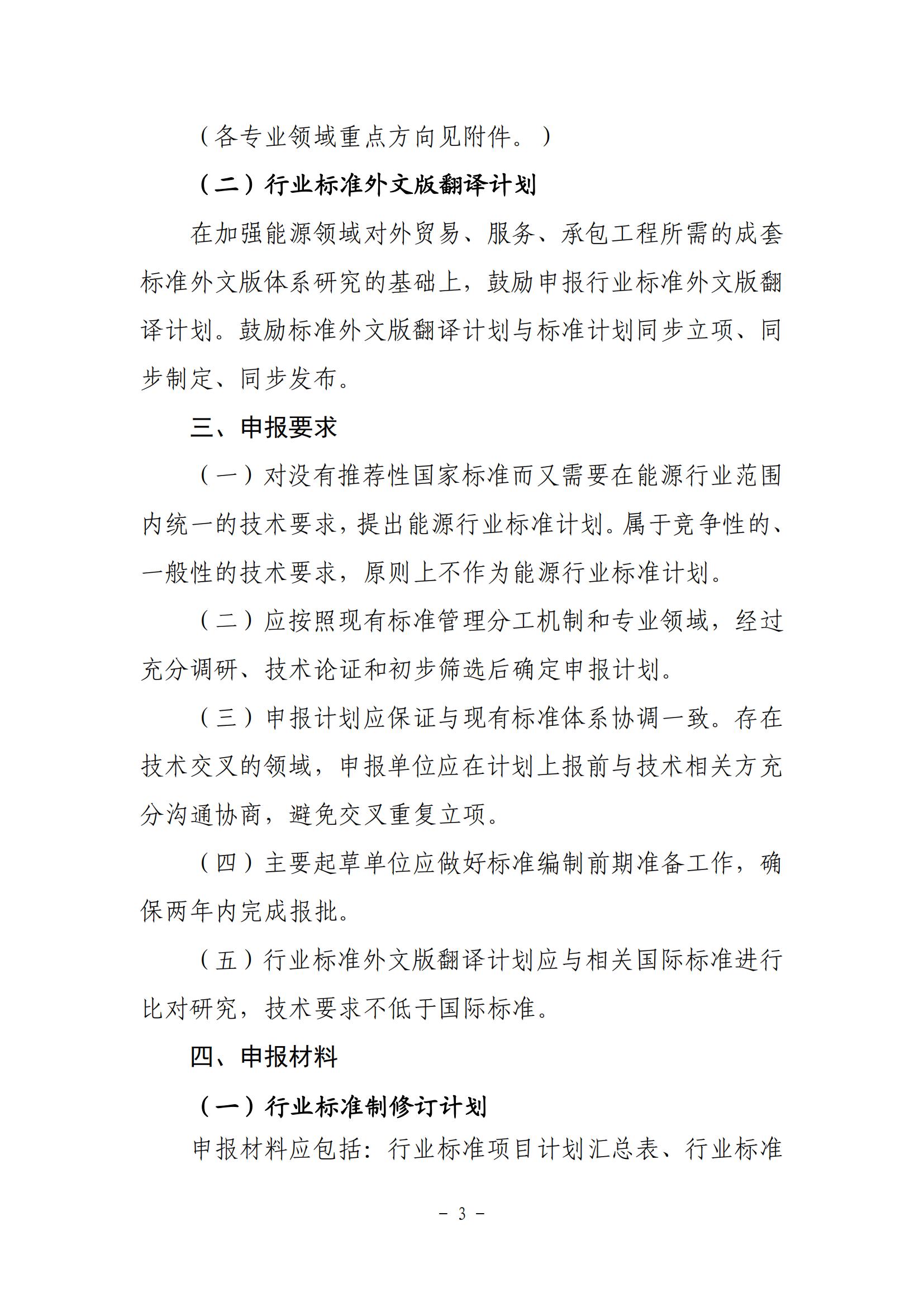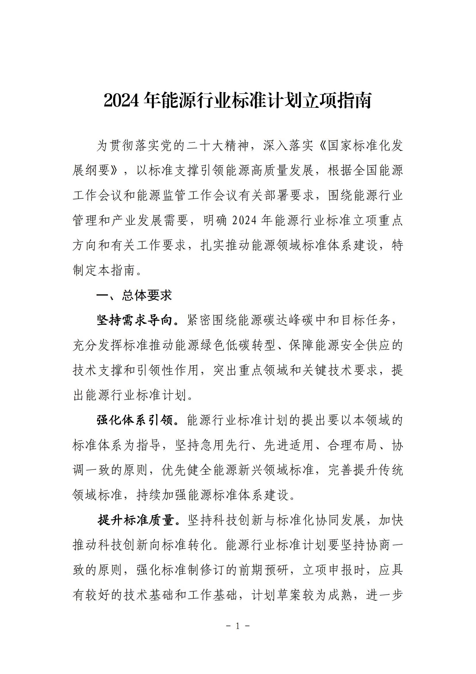 2月23日,國家能源局綜合司關(guān)于印發(fā)《2024年能源行業(yè)標(biāo)準(zhǔn)計劃立項指南》的通知。 根據(jù)通知,立項重點包括立足能源安全和促進能源綠色低碳轉(zhuǎn)型。服務(wù)和保障 能源安全穩(wěn)定供應(yīng),支撐能源碳達峰、碳中和目標(biāo)的行業(yè)標(biāo) 準(zhǔn)計劃;支撐新型電力系統(tǒng)和新型能源體系建設(shè),促進能源 綠色低碳轉(zhuǎn)型、新興技術(shù)產(chǎn)業(yè)發(fā)展、能效提升和產(chǎn)業(yè)鏈碳減 排等重點方向的行業(yè)標(biāo)準(zhǔn)計劃。 申報要求 (一)對沒有推薦性國家標(biāo)準(zhǔn)而又需要在能源行業(yè)范圍 內(nèi)統(tǒng)一的技術(shù)要求,提出能源行業(yè)標(biāo)準(zhǔn)計劃。屬于競爭性的、 一般性的技術(shù)要求,原則上不作為能源行業(yè)標(biāo)準(zhǔn)計劃。 (二)應(yīng)按照現(xiàn)有標(biāo)準(zhǔn)管理分工機制和專業(yè)領(lǐng)域,經(jīng)過 充分調(diào)研、技術(shù)論證和初步篩選后確定申報計劃。 (三)申報計劃應(yīng)保證與現(xiàn)有標(biāo)準(zhǔn)體系協(xié)調(diào)一致。存在 技術(shù)交叉的領(lǐng)域,申報單位應(yīng)在計劃上報前與技術(shù)相關(guān)方充 分溝通協(xié)商,避免交叉重復(fù)立項。 (四)主要起草單位應(yīng)做好標(biāo)準(zhǔn)編制前期準(zhǔn)備工作,確 保兩年內(nèi)完成報批。 (五)行業(yè)標(biāo)準(zhǔn)外文版翻譯計劃應(yīng)與相關(guān)國際標(biāo)準(zhǔn)進行 比對研究,技術(shù)要求不低于國際標(biāo)準(zhǔn)。 全文見下: