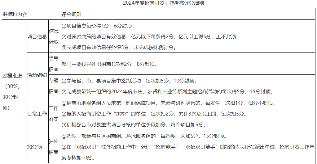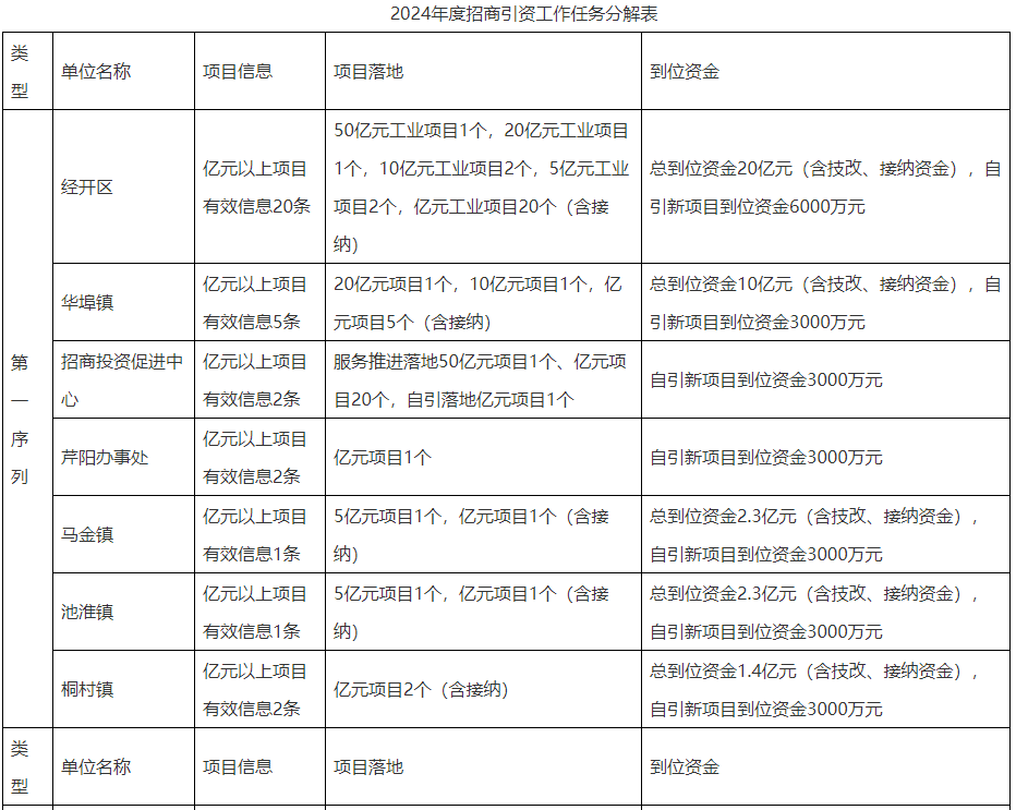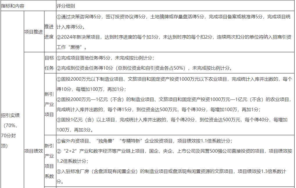 2月22日,浙江開化縣人民政府辦公室發(fā)布關(guān)于印發(fā)《開化縣2024年度招商引資工作實施意見》《開化縣2024年度招商引資工作考核辦法》的通知?!兑庖姟分赋?,2024年開化縣瞄準(zhǔn)項目招引三大主攻方向。其中包括圍繞開化縣有機(jī)硅、糖醇(無糖飲料)、光伏半導(dǎo)體、卡牌“2+2”產(chǎn)業(yè)鏈,突出產(chǎn)業(yè)轉(zhuǎn)型、強(qiáng)鏈補(bǔ)鏈、集群發(fā)展,重點招引功能性糖醇、食品、飲料、硅烷偶聯(lián)劑、硅油、硅橡膠、硅基新材料、光伏輔材、薄膜包材等產(chǎn)業(yè)鏈中下游產(chǎn)品項目,靶向招引一批行業(yè)標(biāo)桿企業(yè)、頭部企業(yè)、高新技術(shù)企業(yè)和“專精特新”企業(yè)。 原文見下: 開化縣2024年度招商引資工作實施意見 為深入貫徹落實省市有關(guān)工作要求,統(tǒng)籌做好全縣招商引資工作,進(jìn)一步提升招商工作主動性、系統(tǒng)性、精準(zhǔn)性,助力產(chǎn)業(yè)高質(zhì)量發(fā)展,為打造中國式現(xiàn)代化山區(qū)縣樣板提供堅強(qiáng)支撐,結(jié)合我縣實際,特制定本意見。 一、指導(dǎo)思想 堅持以習(xí)近平新時代中國特色社會主義思想為指導(dǎo),全面貫徹落實黨的二十大精神和習(xí)近平總書記關(guān)于招商引資重要講話、重要指示批示精神,以推動高質(zhì)量發(fā)展為主線,以非常之功、非常之力,推動招商引資質(zhì)量變革、效率變革、動力變革,助力產(chǎn)業(yè)集群化、現(xiàn)代化、高端化發(fā)展。 二、主要目標(biāo) 2024年,全縣招商引資到位資金突破36億元,新簽約億元以上項目20個,其中10億元以上項目5個、20億元以上項目2個、50億元以上項目1個。 三、工作重點 (一)強(qiáng)化“一把手”招引工程 1.主動外出招商。堅持高位推動,鄉(xiāng)鎮(zhèn)(辦事處)、縣級各部門“一把手”要堅決扛起招商引資“第一責(zé)任人”職責(zé)。各鄉(xiāng)鎮(zhèn)(辦事處)“一把手”要把主要精力放在招商引資、經(jīng)濟(jì)發(fā)展上,全力抓招商、聚資源、拼經(jīng)濟(jì)??h級各部門“一把手”至少騰出三分之一時間謀招商、抓招商,要堅持每月帶隊外出招商,做到親自認(rèn)領(lǐng)招商任務(wù)、親自謀劃招商活動、親自對接招商項目,以上率下、做好示范。 2.嚴(yán)格項目會商。建立健全定期會商研判推進(jìn)和動態(tài)管理機(jī)制,堅持“月會商、季推進(jìn)、年總結(jié)”,強(qiáng)化過程管理和問題破解。每月召開一次會商會議,分析各產(chǎn)業(yè)項目推進(jìn)情況。每季度由分管招商副縣長召集召開聯(lián)席會議,通報項目進(jìn)展情況,部署招商工作。視重大項目推進(jìn)情況,即時召開協(xié)調(diào)會議,解決難點、堵點問題,加快項目推進(jìn)。半年度由縣政府主要領(lǐng)導(dǎo)召集召開全縣招商工作推進(jìn)會,研究部署全縣招商工作。 (二)全力做強(qiáng)一個“雙招雙引”工作組 3.更大力度組建工作力量。創(chuàng)新組建“15421”招商工作組,抽調(diào)15個鄉(xiāng)鎮(zhèn)(辦事處)主要領(lǐng)導(dǎo)組建鄉(xiāng)鎮(zhèn)招商組,重新組建4個片區(qū)招商組,新設(shè)立2支產(chǎn)業(yè)招商小分隊和1個落地服務(wù)組,選優(yōu)配強(qiáng)精干力量,把駐外招商組打造成全縣招商的“沖鋒隊”“排頭兵”。 4.更大力度抓好駐外考核。堅持高目標(biāo)牽引、高水平保障,聚焦引企、引人、引流、引財,完善“雙招雙引”考核管理辦法,對駐外招商組和駐外招商人員明確招引“硬指標(biāo)”、管理“硬規(guī)矩”、考核“硬標(biāo)準(zhǔn)”,激勵督促駐外招商組發(fā)揮招引積極性、主動性。堅持用好駐外資源,充分發(fā)揮鄉(xiāng)賢資源,緊盯所在區(qū)域央企、省屬國企、上市公司和重要民企資源,全力招引一批項目、人才,助力“五鏈”深度融合。 (三)瞄準(zhǔn)項目招引三大主攻方向 5.聚焦聚力制造業(yè)項目招引。圍繞我縣有機(jī)硅、糖醇(無糖飲料)、光伏半導(dǎo)體、卡牌“2+2”產(chǎn)業(yè)鏈,突出產(chǎn)業(yè)轉(zhuǎn)型、強(qiáng)鏈補(bǔ)鏈、集群發(fā)展,重點招引功能性糖醇、食品、飲料、硅烷偶聯(lián)劑、硅油、硅橡膠、硅基新材料、光伏輔材、薄膜包材等產(chǎn)業(yè)鏈中下游產(chǎn)品項目,靶向招引一批行業(yè)標(biāo)桿企業(yè)、頭部企業(yè)、高新技術(shù)企業(yè)和“專精特新”企業(yè)。 6.不斷深化文旅業(yè)項目招引。聚焦國家全域旅游示范區(qū)創(chuàng)建,抓住“一縣一策”戰(zhàn)略機(jī)遇,圍繞根宮佛國、花牽谷、白石尖等文旅資源,加快業(yè)態(tài)招引,做好資源盤活文章。圍繞“文旅+”文章,著力招引一批生態(tài)研學(xué)、紅色旅游、夜游等業(yè)態(tài)項目。圍繞文化產(chǎn)業(yè),依托香火草龍、開化紙、開化瓷等非遺資源,著力招引一批數(shù)字運營、文創(chuàng)推廣企業(yè)。 7.持續(xù)做好服務(wù)業(yè)項目招引。聚焦以“美麗+數(shù)字”為特色的“432”現(xiàn)代服務(wù)業(yè)體系,著力引進(jìn)一批生態(tài)文旅、文化創(chuàng)意、生態(tài)康養(yǎng)、生態(tài)會展等美麗經(jīng)濟(jì)幸福產(chǎn)業(yè)項目。不斷深化“工業(yè)+現(xiàn)代服務(wù)業(yè)”融合發(fā)展,招引一批現(xiàn)代物流、現(xiàn)代商務(wù)、信息服務(wù)等生產(chǎn)性服務(wù)業(yè)企業(y