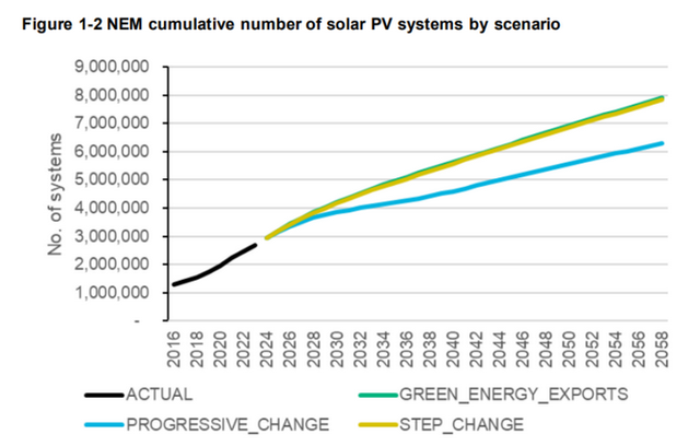 澳大利亞能源市場運營商(AEMO) 在三種方案下對2024~2058年安裝的光伏系統(tǒng)預(yù)測 根據(jù)Green Energy Markets公司在2023年12月發(fā)布的這份報告,預(yù)計該國安裝的屋頂光伏系統(tǒng)裝機(jī)容量將超過目前澳大利亞國家電力市場(NEM)煤炭、天然氣和水力發(fā)電41GW的裝機(jī)容量,但根據(jù)該國政府的三種脫碳方案而有所不同。 這三種方案分別是“漸進(jìn)式變革”、“階梯式變革”和“綠色能源出口”。在漸進(jìn)式變革方案中,澳大利亞將實現(xiàn)到2030年減排43%,到2050年達(dá)到凈零排放的目標(biāo)?!半A梯式變革”方案是基于消費者驅(qū)動的投資,將地球的氣溫上升保持在2℃以下。“綠色能源出口”方案預(yù)測地球的氣溫上升將限制在1.5℃以內(nèi),需要采用快速電氣化、綠色制氫和生物甲烷解決方案。 《分布式資源預(yù)測——光伏系統(tǒng)和電池儲能系統(tǒng)》報告指出,在“漸進(jìn)式變革”方案中,到2053/2054年,澳大利亞安裝的光伏系統(tǒng)裝機(jī)容量將達(dá)到66GW,高于澳大利亞能源市場運營商(AEMO)引用的澳大利亞聯(lián)邦科學(xué)與工業(yè)研究組織(CSIRO)在同期48GW的預(yù)測。 Green Energy Markets公司和CSIRO預(yù)測在全球最受歡迎的“階梯式變革”和“綠色能源出口”方案中安裝的光伏系統(tǒng)容量分別為98GW和92GW。 Green Energy Markets公司分析和咨詢主管、該報告的合著者Tristan Edis表示:“這些預(yù)測表明,澳大利亞安裝的的屋頂光伏裝機(jī)容量(考慮到光伏組件的性能退化)接近或超過了平均電力需求。除此之外,我們還安裝更多的大量光伏電站以及100 kW以上的大型商業(yè)光伏系統(tǒng)。對許多人來說,屋頂光伏裝機(jī)容量的增長似乎超出了可信度的界限?!?/span> Edis表示,有四個原因使屋頂光伏的裝機(jī)容量超過住宅用戶的總電力需求。 Edis說,“隨著時間的推移,考慮到光伏組件的工作壽命為20年,最終安裝的光伏系統(tǒng)裝機(jī)容量越來越高,盡管預(yù)計未來每年新增光伏電站的數(shù)量將比過去幾年大幅下降。” 隨著裝機(jī)容量的增長和越來越多的棄電,光伏系統(tǒng)在批發(fā)電力市場上的價值以及上網(wǎng)電價將會下降。Edis表示,這些情況在很大程度上取決于住宅電池儲能系統(tǒng)的價格也在下降。