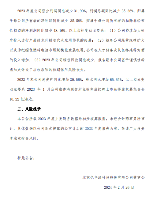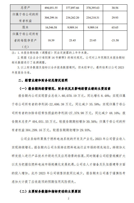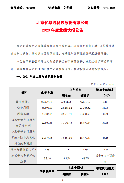 近日,億華通發(fā)布《2023 年度業(yè)績快報公告》。 根據(jù)公告顯示,報告期內(nèi)公司實現(xiàn)營業(yè)總收入80070.19 萬元,同比增長8.48%;實現(xiàn)歸屬于母公司所有者的凈利潤-22,606.38萬元,同比減少35.58%;實現(xiàn)歸屬于母公司所有者的扣除非經(jīng)常性損益的凈利潤-27,379.98 萬元,同比減少48.16%;報告期末總資產(chǎn)494,051.55萬元,較報告期期初增加30.56%;歸屬于母公司的所有者權(quán)益 304,299.16萬元,較報告期期初增加29.93%。