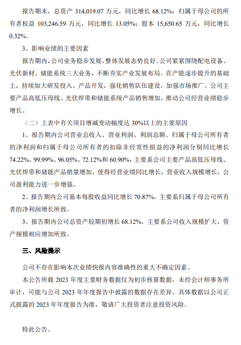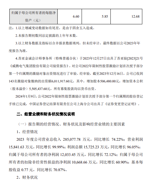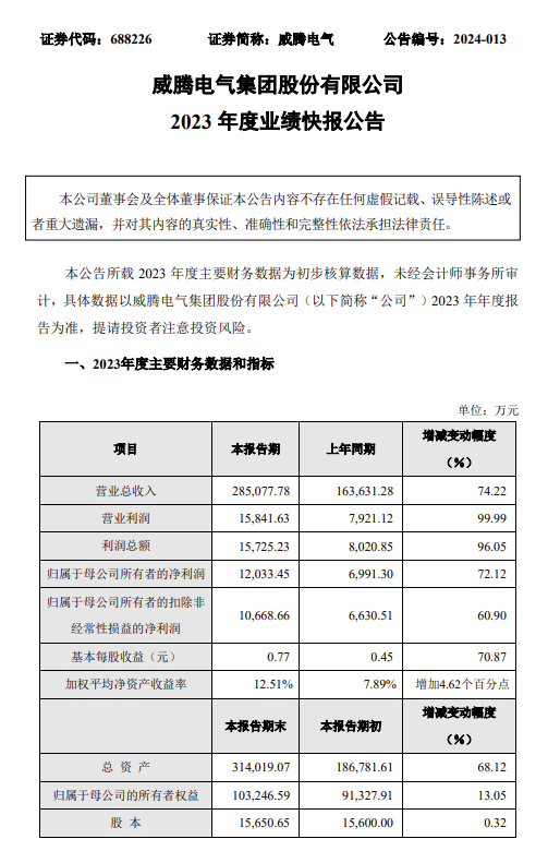近日,威騰電氣發(fā)布2023年度業(yè)績快報(bào)公告。 根據(jù)公告顯示,2023年度威騰電氣營業(yè)總收入285,077.78萬元,同比增長74.22%;營業(yè)利潤15,841.63萬元,同比增長99.99%;利潤總額15,725.23萬元,同比增長96.05%; 歸屬于母公司所有者的凈利潤 12,033.45萬元,同比增長72.12%;歸屬于母公司所有者的扣除非經(jīng)常性損益的凈利潤10,668.66萬元,同比增長60.90%;基本每股收益0.77元,同比增長70.87%。