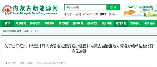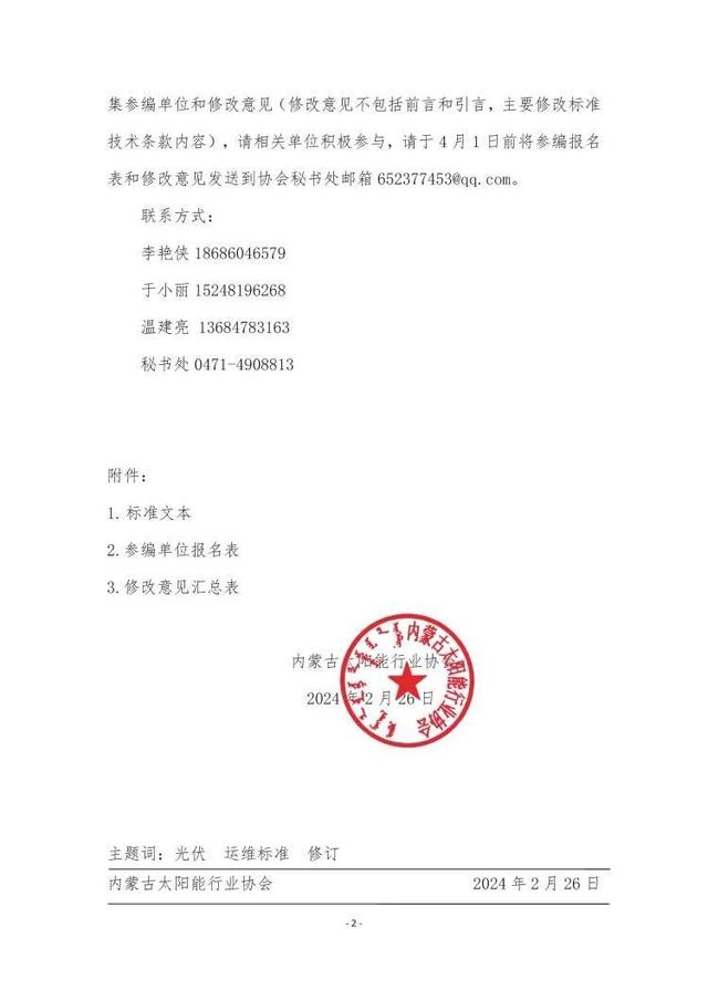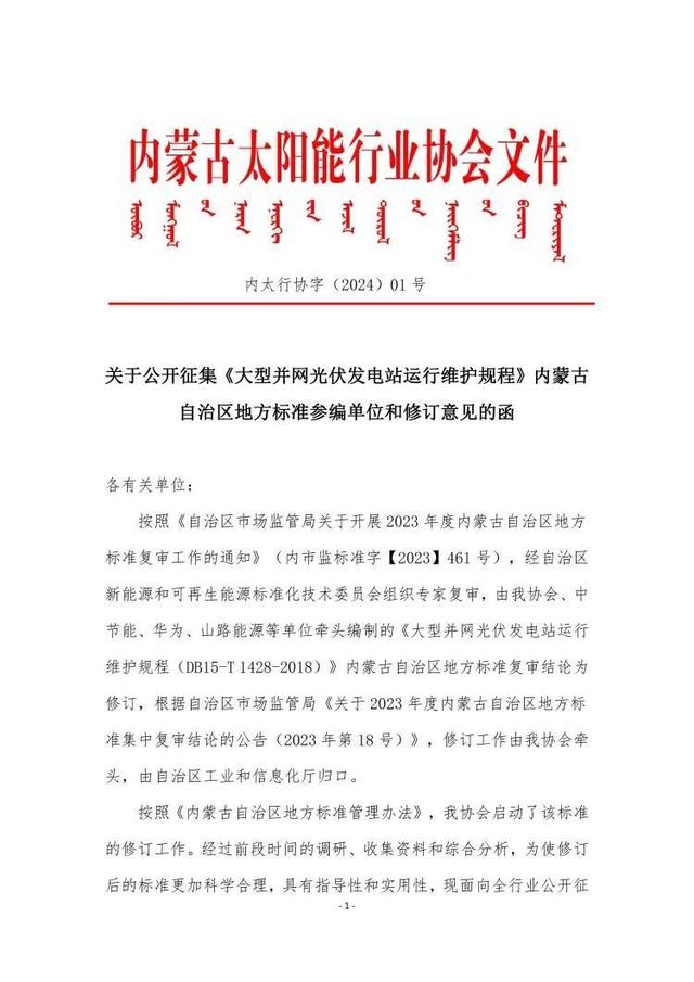各有關(guān)單位: 按照《自治區(qū)市場監(jiān)管局關(guān)于開展2023年度內(nèi)蒙古自治區(qū)地方標準復(fù)審工作的通知》(內(nèi)市監(jiān)標準字【2023】461號),經(jīng)自治區(qū)新能源和可再生能源標準化技術(shù)委員會組織專家復(fù)審,由我協(xié)會、中節(jié)能、華為、山路能源等單位牽頭編制的《大型并網(wǎng)光伏發(fā)電站運行維護規(guī)程(DB15-T 1428-2018)》內(nèi)蒙古自治區(qū)地方標準復(fù)審結(jié)論為修訂,根據(jù)自治區(qū)市場監(jiān)管局《關(guān)于2023年度內(nèi)蒙古自治區(qū)地方標準集中復(fù)審結(jié)論的公告(2023年第18號)》,修訂工作由我協(xié)會牽頭,由自治區(qū)工業(yè)和信息化廳歸口。 按照《內(nèi)蒙古自治區(qū)地方標準管理辦法》,我協(xié)會啟動了該標準的修訂工作。經(jīng)過前段時間的調(diào)研、收集資料和綜合分析,為使修訂后的標準更加科學(xué)合理,具有指導(dǎo)性和實用性,現(xiàn)面向全行業(yè)公開征集參編單位和修改意見(修改意見不包括前言和引言,主要修改標準技術(shù)條款內(nèi)容),請相關(guān)單位積極參與,請于4月1日前將參編報名表和修改意見發(fā)送到協(xié)會秘書處郵箱652377453@qq.com。 聯(lián)系方式: 李艷俠18686046579 于小麗15248196268 溫建亮 13684783163 秘書處0471-4908813 附件: 1.標準文本 2.參編單位報名表 3.修改意見匯總表 內(nèi)蒙古太陽能行業(yè)協(xié)會 2024年2月26日