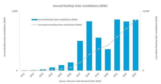 根據(jù)調(diào)研機(jī)構(gòu)Mercom India Research公司日前發(fā)布的《印度2023年及第四季度的屋頂光伏市場(chǎng)報(bào)告》,印度在2023年安裝了1.7GW的屋頂光伏系統(tǒng),是該國(guó)安裝屋頂光伏裝機(jī)容量有記錄以來第二高的年度。 然而,由于許多商業(yè)和工業(yè)(C&I)消費(fèi)者正在等待光伏組件價(jià)格穩(wěn)定而推遲了光伏系統(tǒng)的安裝,印度在2023年安裝的光伏系統(tǒng)裝機(jī)容量增長(zhǎng)率僅為3.7%。Mercom India Research公司預(yù)計(jì),光伏組件在2024年初的較低價(jià)格將有助于降低光伏系統(tǒng)的安裝成本。