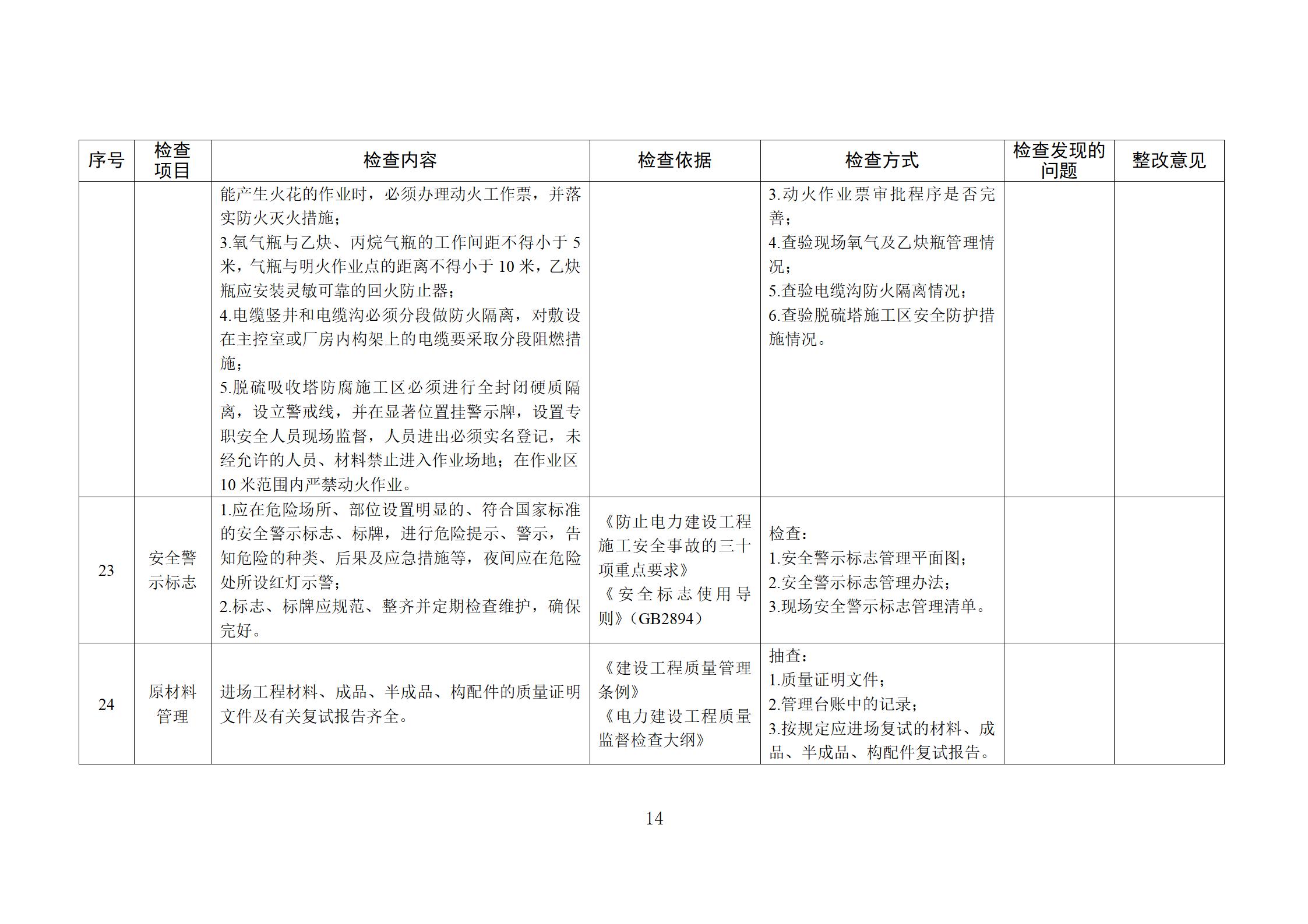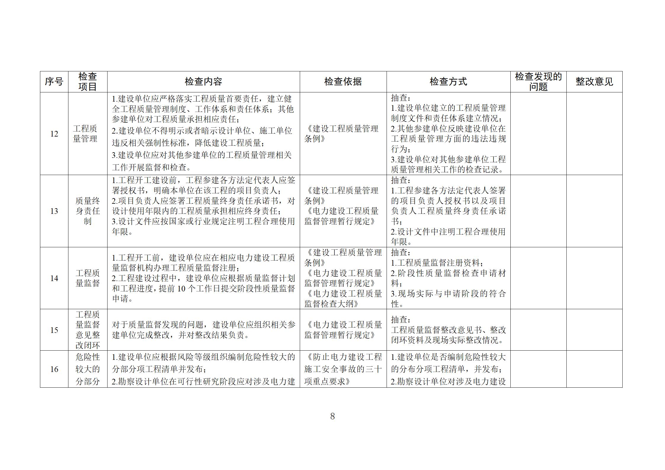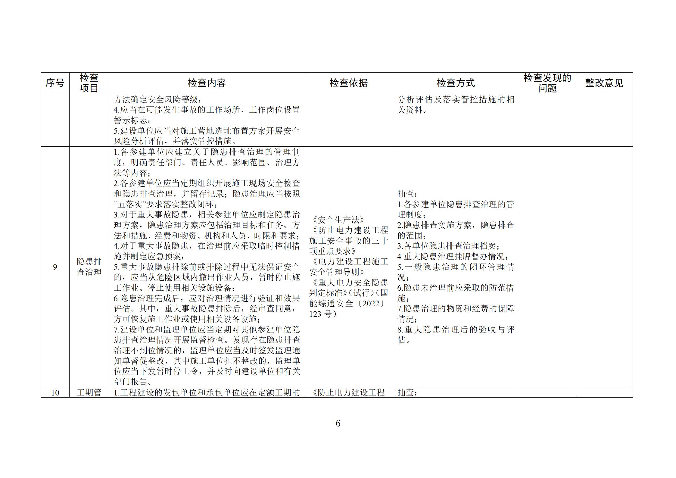 日前,國(guó)家能源局關(guān)于開(kāi)展2024年度電力建設(shè)施工安全和工程質(zhì)量專(zhuān)項(xiàng)監(jiān)管的通知。 根據(jù)通知,重點(diǎn)任務(wù)為全國(guó)電力建設(shè)工程各參建單位要嚴(yán)格落實(shí)安全生產(chǎn)主體責(zé)任,建設(shè)單位要落實(shí)首要責(zé)任,深刻汲取近年來(lái)電力行業(yè)事故事件教訓(xùn),在勘察設(shè)計(jì)、建設(shè)施工、安裝調(diào)試、竣工驗(yàn)收、工程監(jiān)理等階段環(huán)節(jié),深入排查整治各類(lèi)安全風(fēng)險(xiǎn)隱患和管理漏洞短板,重點(diǎn)對(duì)照《2024年度電力建設(shè)施工安全和工程質(zhì)量專(zhuān)項(xiàng)監(jiān)管檢查事項(xiàng)清單》(見(jiàn)附件1)明確的30個(gè)檢查項(xiàng)目、145項(xiàng)檢查內(nèi)容開(kāi)展排查整治,切實(shí)保障施工安全和工程質(zhì)量。 全文見(jiàn)下: 國(guó)家能源局關(guān)于開(kāi)展2024年度電力建設(shè)施工安全和工程質(zhì)量專(zhuān)項(xiàng)監(jiān)管的通知 國(guó)能發(fā)安全〔2024〕16號(hào) 各省(自治區(qū)、直轄市)能源局,有關(guān)省(自治區(qū)、直轄市)及新疆生產(chǎn)建設(shè)兵團(tuán)發(fā)展改革委、工業(yè)和信息化主管部門(mén),北京市城市管理委,各派出機(jī)構(gòu),可靠性和質(zhì)監(jiān)中心,各電力建設(shè)工程質(zhì)量監(jiān)督機(jī)構(gòu),中國(guó)電力建設(shè)企業(yè)協(xié)會(huì),全國(guó)電力安委會(huì)各企業(yè)成員單位: 近年來(lái),全國(guó)電力建設(shè)工程數(shù)量多、規(guī)模大、分布廣、種類(lèi)雜,安全風(fēng)險(xiǎn)長(zhǎng)期居高不下,當(dāng)前已出現(xiàn)事故反彈回潮苗頭,安全生產(chǎn)形勢(shì)較為嚴(yán)峻。為深入學(xué)習(xí)貫徹習(xí)近平總書(shū)記關(guān)于安全生產(chǎn)重要指示批示精神,認(rèn)真落實(shí)國(guó)務(wù)院安委會(huì)安全生產(chǎn)十五條硬措施及治本攻堅(jiān)三年行動(dòng)統(tǒng)一部署,加強(qiáng)電力建設(shè)工程安全監(jiān)督管理,推動(dòng)電力安全生產(chǎn)形勢(shì)穩(wěn)定向好,國(guó)家能源局決定在全國(guó)范圍內(nèi)組織開(kāi)展電力建設(shè)施工安全和工程質(zhì)量專(zhuān)項(xiàng)監(jiān)管工作,現(xiàn)就有關(guān)要求通知如下。 一、總體目標(biāo) 通過(guò)開(kāi)展專(zhuān)項(xiàng)監(jiān)管工作,電力行業(yè)各有關(guān)單位進(jìn)一步樹(shù)牢安全發(fā)展理念,進(jìn)一步增強(qiáng)“時(shí)時(shí)放心不下”的責(zé)任感,進(jìn)一步加強(qiáng)電力建設(shè)工程安全監(jiān)督管理,管控一批安全風(fēng)險(xiǎn),消除一批事故隱患,堵塞一批管理漏洞,提升電力建設(shè)工程本質(zhì)安全水平,防范遏制各類(lèi)事故發(fā)生,守住不發(fā)生重特大事故的底線(xiàn)。 二、專(zhuān)項(xiàng)監(jiān)管時(shí)間 自本通知印發(fā)之日至2024年12月。 三、重點(diǎn)任務(wù) 全國(guó)電力建設(shè)工程各參建單位要嚴(yán)格落實(shí)安全生產(chǎn)主體責(zé)任,建設(shè)單位要落實(shí)首要責(zé)任,深刻汲取近年來(lái)電力行業(yè)事故事件教訓(xùn),在勘察設(shè)計(jì)、建設(shè)施工、安裝調(diào)試、竣工驗(yàn)收、工程監(jiān)理等階段環(huán)節(jié),深入排查整治各類(lèi)安全風(fēng)險(xiǎn)隱患和管理漏洞短板,重點(diǎn)對(duì)照《2024年度電力建設(shè)施工安全和工程質(zhì)量專(zhuān)項(xiàng)監(jiān)管檢查事項(xiàng)清單》(見(jiàn)附件1)明確的30個(gè)檢查項(xiàng)目、145項(xiàng)檢查內(nèi)容開(kāi)展排查整治,切實(shí)保障施工安全和工程質(zhì)量。 四、進(jìn)度安排 (一)集中自查自糾階段(3—4月) 各電力企業(yè)要建立并嚴(yán)格落實(shí)電力建設(shè)施工安全和工程質(zhì)量常態(tài)化巡查檢查工作機(jī)制,對(duì)發(fā)現(xiàn)的問(wèn)題要建立清單,并立行立改;問(wèn)題復(fù)雜而不能立即整改的,要及時(shí)制定整改計(jì)劃,明確整改目標(biāo),分解責(zé)任到崗到人,積極推進(jìn)整改,確保問(wèn)題閉環(huán)管理。2024年3—4月,各電力企業(yè)要結(jié)合春季安全生產(chǎn)大檢查、春節(jié)后開(kāi)復(fù)工安全評(píng)估檢查等工作安排,集中開(kāi)展一次施工安全和工程質(zhì)量自查自糾行動(dòng),并于4月底前將自查自糾問(wèn)題清單及整改情況報(bào)送當(dāng)?shù)厥〖?jí)電力管理部門(mén)和派出機(jī)構(gòu)。 (二)重點(diǎn)督查督導(dǎo)階段(3—11月) 各省級(jí)電力管理部門(mén)、各派出機(jī)構(gòu)要跟蹤分析研判轄區(qū)內(nèi)電力建設(shè)工程安全形勢(shì),會(huì)同相關(guān)專(zhuān)業(yè)支撐機(jī)構(gòu),選擇安全生產(chǎn)工作態(tài)度不端正、專(zhuān)項(xiàng)監(jiān)管推進(jìn)不扎實(shí)、風(fēng)險(xiǎn)隱患整治不到位的電力建設(shè)工程和相關(guān)企業(yè)開(kāi)展督查,其中要對(duì)2023年發(fā)生過(guò)事故現(xiàn)仍在建的工程和2024年發(fā)生事故的工程實(shí)現(xiàn)督查全覆蓋。國(guó)家能源局電力安全監(jiān)管司將會(huì)同可靠性和質(zhì)監(jiān)中心、相關(guān)專(zhuān)業(yè)支撐機(jī)構(gòu)及行業(yè)協(xié)會(huì),對(duì)電力建設(shè)任務(wù)繁重、重大風(fēng)險(xiǎn)隱患突出、事故多發(fā)頻發(fā)的地方和企業(yè)開(kāi)