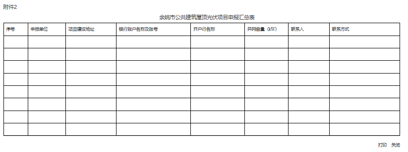 3月18日,余姚市發(fā)展和改革局關(guān)于組織申報2023年度余姚市公共建筑屋頂光伏項目資金補助的通知。 根據(jù)通知,對2023年度經(jīng)過備案認(rèn)可的裝機容量100千瓦及以上的公共建筑屋頂光伏項目,經(jīng)并網(wǎng)驗收后,按照并網(wǎng)容量給予一次性0.3元/瓦補助,單個項目不超過15萬元。 全文見下: 余姚市發(fā)展和改革局關(guān)于組織申報2023年度余姚市公共建筑屋頂光伏項目資金補助的通知 各鄉(xiāng)鎮(zhèn)(街道)人民政府,各有關(guān)單位: 為深入實施光伏+十大工程建設(shè),加快推進(jìn)光伏整市規(guī)?;_發(fā),根據(jù)《余姚市人民政府辦公室關(guān)于印發(fā)余姚市整市推進(jìn)光伏規(guī)?;_發(fā)工作方案的通知》(余政辦發(fā)〔2021〕71號)、《余姚市發(fā)展和改革局 余姚市財政局<關(guān)于推動產(chǎn)業(yè)高質(zhì)量發(fā)展的若干政策意見>發(fā)改相關(guān)政策的實施細(xì)則》(余發(fā)改辦〔2023〕9號)等文件要求,現(xiàn)決定組織開展2023年度余姚市公共建筑屋頂光伏項目資金補貼申報工作,有關(guān)事項通知如下: 一、項目申報范圍和對象 1.利用公共建筑(政府、學(xué)校、商場、酒店、醫(yī)院等非生產(chǎn)性建筑,不含工業(yè))屋頂建設(shè)光伏發(fā)電系統(tǒng)的項目。 2.凡享受本政策企業(yè),必須在余姚市范圍內(nèi)工商登記注冊,符合《余姚市發(fā)展和改革局 余姚市財政局<關(guān)于推動產(chǎn)業(yè)高質(zhì)量發(fā)展的若干政策意見>發(fā)改相關(guān)政策的實施細(xì)則》(余發(fā)改辦〔2023〕9號)基本條件。 3.凡所涉新組建的各類企業(yè)和項目,在籌建、籌辦時必須到相關(guān)職能部門備案登記。 二、項目申報材料 1.公共建筑分布式光伏補貼申請表(附件1); 2.項目備案文件; 3.所在地供電公司出具的并網(wǎng)驗收意見書復(fù)印件; 4.項目光伏組件及逆變器質(zhì)保證明文件; 5.企業(yè)法人營業(yè)執(zhí)照副本和稅務(wù)登記證復(fù)印件; 三、申報項目的補貼額度和時限 對2023年度經(jīng)過備案認(rèn)可的裝機容量100千瓦及以上的公共建筑屋頂光伏項目,經(jīng)并網(wǎng)驗收后,按照并網(wǎng)容量給予一次性0.3元/瓦補助,單個項目不超過15萬元。 四、工作要求 請市住建局、市文廣局、市商務(wù)局、市教育局、市衛(wèi)健局、市農(nóng)業(yè)農(nóng)村局、各鄉(xiāng)鎮(zhèn)街道做好符合條件的項目業(yè)主單位通知工作。請各業(yè)主單位依據(jù)申報要求,將申報材料報送至各行業(yè)主管部門初審,請各行業(yè)主管部門初審后匯總,于3月29日前將申報材料及匯總表(附件2)反饋至市發(fā)改局。 聯(lián)系人:劉樺,聯(lián)系電話:89553365,18042081958(浙政釘同號) 附件:1.余姚市公共建筑分布式光伏補貼申請表 2.余姚市公共建筑屋頂光伏項目申報匯總表 余姚市發(fā)展和改革局 2024年3月18日 附件1 公共建筑分布式光伏補貼申請表