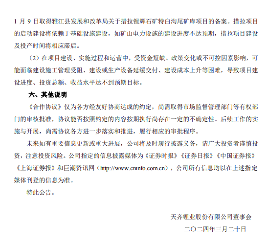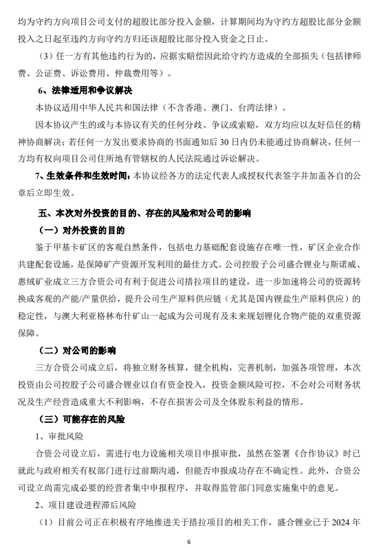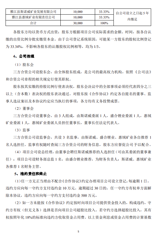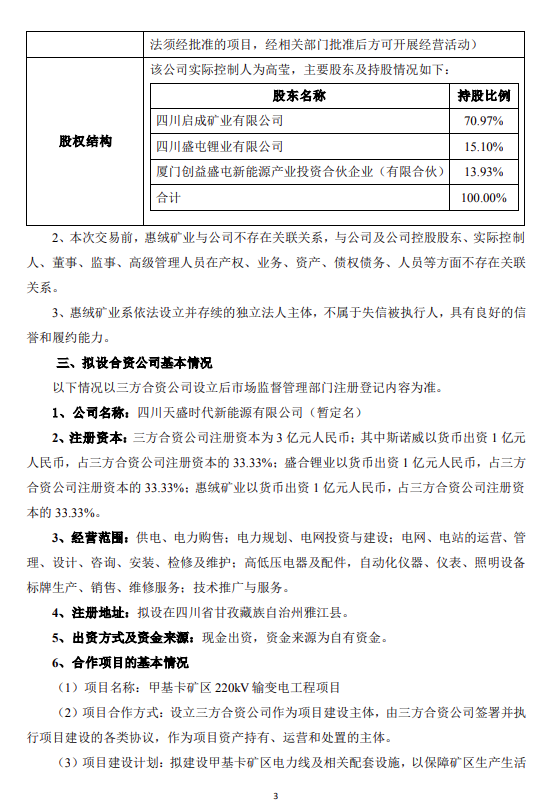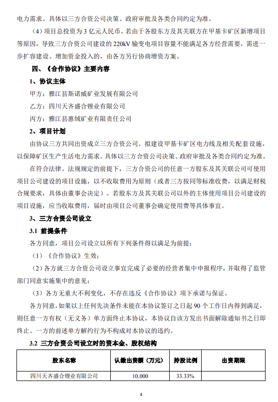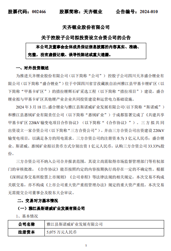 天齊鋰業(yè)發(fā)布《關(guān)于控股子公司擬投資設(shè)立合資公司的公告》。 根據(jù)公告顯示,為推進(jìn)天齊鋰業(yè)股份有限公司控股子公司四川天齊盛合鋰業(yè)有限公司位于中國(guó)四川省甘孜藏族自治州雅江縣甲基卡鋰礦區(qū)的措拉鋰輝石礦采選工程建設(shè),盛合鋰業(yè)擬與甲基卡礦區(qū)其他鋰產(chǎn)業(yè)企業(yè)共同投資建設(shè)和運(yùn)營(yíng)電力基礎(chǔ)設(shè)施。 2024 年 3 月 18 日,盛合鋰業(yè)與雅江縣斯諾威礦業(yè)發(fā)展有限公司和雅江縣惠絨礦業(yè)有限責(zé)任公司于成都簽署完成了《共建共享甲基卡礦區(qū) 220kV 輸變電項(xiàng)目合作協(xié)議》。三方擬共同出資設(shè)立一家合資公司,并由合資公司出資建設(shè)220kV輸變電項(xiàng)目,以滿足各方的用電需求。三方合資公司的注冊(cè)資本為3億元人民幣;盛合鋰業(yè)、斯諾威、惠絨礦業(yè)擬以貨幣方式分別出資1億元人民幣,認(rèn)購(gòu)三方合資公司33.33%股份。