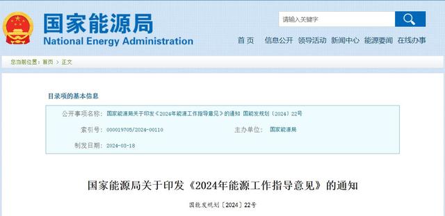 原文如下: 2024年能源工作指導(dǎo)意見(jiàn) 2024年是新中國(guó)成立75周年,是深入實(shí)施“四個(gè)革命、一個(gè)合作”能源安全新戰(zhàn)略十周年,是完成“十四五”規(guī)劃目標(biāo)任務(wù)的關(guān)鍵一年,做好全年能源工作十分重要。為深入貫徹落實(shí)黨中央、國(guó)務(wù)院決策部署,持續(xù)推動(dòng)能源綠色低碳轉(zhuǎn)型和高質(zhì)量發(fā)展,保障能源安全,制定本意見(jiàn)。 一、總體要求 (一)指導(dǎo)思想 堅(jiān)持以習(xí)近平新時(shí)代中國(guó)特色社會(huì)主義思想為指導(dǎo),全面貫徹黨的二十大精神,深入落實(shí)中央經(jīng)濟(jì)工作會(huì)議和政府工作報(bào)告的部署,堅(jiān)持穩(wěn)中求進(jìn)工作總基調(diào),完整、準(zhǔn)確、全面貫徹新發(fā)展理念,加快構(gòu)建新發(fā)展格局,深入踐行能源安全新戰(zhàn)略,更好統(tǒng)籌發(fā)展和安全,處理好新能源與傳統(tǒng)能源、全局與局部、能源開(kāi)發(fā)和節(jié)約利用等關(guān)系,著力提升能源安全保障能力,著力推進(jìn)能源綠色低碳轉(zhuǎn)型,著力深化能源改革創(chuàng)新,著力提高能源國(guó)際合作水平,加快規(guī)劃建設(shè)新型能源體系,為中國(guó)式現(xiàn)代化建設(shè)提供安全可靠的能源保障。 (二)基本原則 堅(jiān)持把保障國(guó)家能源安全放在首位。持續(xù)鞏固“電力穩(wěn)定可靠、油氣底線可保、煤炭壓艙兜底、新能源高質(zhì)量躍升”良好態(tài)勢(shì)。保持能源生產(chǎn)能力合理彈性,強(qiáng)化儲(chǔ)備能力建設(shè),堅(jiān)守安全生產(chǎn)底線,有效應(yīng)對(duì)能源安全風(fēng)險(xiǎn)挑戰(zhàn),保障經(jīng)濟(jì)社會(huì)發(fā)展和人民群眾美好生活用能需求。 堅(jiān)持積極有力推進(jìn)能源綠色低碳轉(zhuǎn)型。深入踐行生態(tài)優(yōu)先、綠色發(fā)展理念,堅(jiān)定不移落實(shí)雙碳目標(biāo),把握好節(jié)奏和力度,著力加強(qiáng)供需協(xié)同,強(qiáng)化系統(tǒng)消納,保持清潔能源高質(zhì)量較快發(fā)展勢(shì)頭。 堅(jiān)持依靠科技創(chuàng)新增強(qiáng)發(fā)展新動(dòng)能。深入實(shí)施能源技術(shù)裝備補(bǔ)短板、鍛長(zhǎng)板、拓新板,加強(qiáng)關(guān)鍵核心技術(shù)聯(lián)合攻關(guān),強(qiáng)化優(yōu)勢(shì)能源產(chǎn)業(yè)國(guó)際競(jìng)爭(zhēng)力。加強(qiáng)科研成果轉(zhuǎn)化運(yùn)用,促進(jìn)新質(zhì)生產(chǎn)力發(fā)展。 堅(jiān)持以深化改革開(kāi)放激發(fā)發(fā)展活力。深入推進(jìn)重點(diǎn)領(lǐng)域和關(guān)鍵環(huán)節(jié)體制機(jī)制改革,持續(xù)推進(jìn)全國(guó)統(tǒng)一電力市場(chǎng)體系建設(shè),深化油氣市場(chǎng)體系改革,不斷提高能源治理效能。務(wù)實(shí)推進(jìn)能源國(guó)際合作,擴(kuò)大高水平對(duì)外開(kāi)放,積極參與全球能源治理。 (三)主要目標(biāo) 供應(yīng)保障能力持續(xù)增強(qiáng)。全國(guó)能源生產(chǎn)總量達(dá)到49.8億噸標(biāo)準(zhǔn)煤左右。煤炭穩(wěn)產(chǎn)增產(chǎn),原油產(chǎn)量穩(wěn)定在2億噸以上,天然氣保持快速上產(chǎn)態(tài)勢(shì)。發(fā)電裝機(jī)達(dá)到31.7億千瓦左右,發(fā)電量達(dá)到9.96萬(wàn)億千瓦時(shí)左右,“西電東送”輸電能力持續(xù)提升。 能源結(jié)構(gòu)持續(xù)優(yōu)化。非化石能源發(fā)電裝機(jī)占比提高到55%左右。風(fēng)電、太陽(yáng)能發(fā)電量占全國(guó)發(fā)電量的比重達(dá)到17%以上。天然氣消費(fèi)穩(wěn)中有增,非化石能源占能源消費(fèi)總量比重提高到18.9%左右,終端電力消費(fèi)比重持續(xù)提高。 質(zhì)量效率穩(wěn)步提高。能源清潔高效開(kāi)發(fā)利用取得新成效。煤電“三改聯(lián)動(dòng)”持續(xù)推進(jìn)??缡】鐓^(qū)輸電通道平均利用小時(shí)數(shù)處于合理區(qū)間。推動(dòng)北方地區(qū)清潔取暖持續(xù)向好發(fā)展??萍紕?chuàng)新成果應(yīng)用取得新進(jìn)展。 二、持續(xù)夯實(shí)能源保障基礎(chǔ) 把能源安全作為高質(zhì)量發(fā)展的基石,持續(xù)鞏固提升油氣產(chǎn)量,保持煤炭產(chǎn)能合理裕度,增加戰(zhàn)略儲(chǔ)備和調(diào)節(jié)能力,強(qiáng)化區(qū)域協(xié)同保障,筑牢能源安全保障的根基。 強(qiáng)化化石能源安全兜底保障。深入研究實(shí)施油氣中長(zhǎng)期增儲(chǔ)上產(chǎn)發(fā)展戰(zhàn)略。加大油氣勘探開(kāi)發(fā)力度,推進(jìn)老油田穩(wěn)產(chǎn),加快新區(qū)建產(chǎn),強(qiáng)化“兩深一非一穩(wěn)”重點(diǎn)領(lǐng)域油氣產(chǎn)能建設(shè)。有序推動(dòng)煉油項(xiàng)目改造升級(jí)。加快儲(chǔ)氣設(shè)施建設(shè),推進(jìn)地下儲(chǔ)氣庫(kù)、沿海液化天然氣接收站儲(chǔ)罐工程。加強(qiáng)油氣管道保護(hù)。有序釋放煤炭先進(jìn)產(chǎn)能,推動(dòng)已核準(zhǔn)項(xiàng)目盡快開(kāi)工建設(shè),在建煤礦項(xiàng)目盡早投產(chǎn)達(dá)產(chǎn),核準(zhǔn)一批安全、智能、綠色的大型現(xiàn)代化煤礦,保障煤炭產(chǎn)能接續(xù)平穩(wěn),在安全生產(chǎn)基礎(chǔ)上,推動(dòng)產(chǎn)量保持較高水平。建立煤炭產(chǎn)能儲(chǔ)備制度,加強(qiáng)煤炭運(yùn)輸通道和產(chǎn)品儲(chǔ)備能力建設(shè),提升煤炭供給體系彈性。 提升電力系統(tǒ