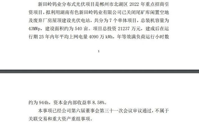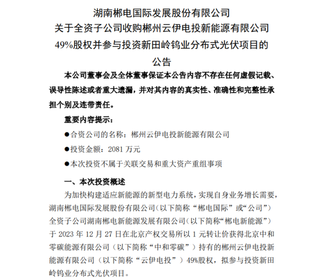 3月23日,郴電國際發(fā)布公告表示,全資子公司湖南郴電新能源發(fā)展有限公司于 2023 年 12 月 27 日在北京產(chǎn)權(quán)交易所以 1 元轉(zhuǎn)讓價獲得北京中和零碳能源有限公司持有的郴州云伊電投新能源有限公司49%股權(quán),擬參與投資新田嶺鎢業(yè)分布式光伏項(xiàng)目。