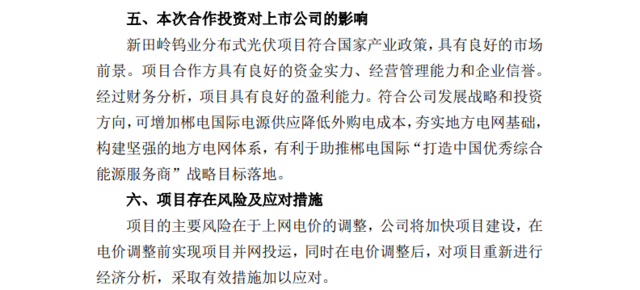 針對此次項(xiàng)目,郴電國際表示, 新田嶺鎢業(yè)分布式光伏項(xiàng)目符合國家產(chǎn)業(yè)政策,具有良好的市場前景。項(xiàng)目合作方具有良好的資金實(shí)力、經(jīng)營管理能力和企業(yè)信譽(yù)。經(jīng)過財(cái)務(wù)分析,項(xiàng)目具有良好的盈利能力。符合公司發(fā)展戰(zhàn)略和投資方向,可增加郴電國際電源供應(yīng)降低外購電成本,夯實(shí)地方電網(wǎng)基礎(chǔ),構(gòu)建堅(jiān)強(qiáng)的地方電網(wǎng)體系,有利于助推郴電國際“打造中國優(yōu)秀綜合能源服務(wù)商”戰(zhàn)略目標(biāo)落地。