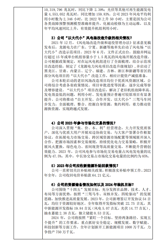 4月8日,龍?jiān)措娏Πl(fā)布投資者關(guān)系活動(dòng)記錄表表示,2023年,龍?jiān)措娏π略隹毓裳b機(jī)容量4509.83兆瓦,其中風(fēng)電1562.55兆瓦,光伏2947.28兆瓦。 截至2023年底,龍?jiān)措娏偪毓裳b機(jī)容量為35593.67兆瓦,其中風(fēng)電27754.39兆瓦,火電1875.00兆瓦,光伏等其他可再生能源5964.28兆瓦。 2023年,龍?jiān)措娏塾?jì)完成發(fā)電量76225816兆瓦時(shí),同比增加7.92%,其中風(fēng)電發(fā)電量61352968兆瓦時(shí),同比增加5.22%;火電發(fā)電量10319796兆瓦時(shí),同比下降2.39%;光伏等其他可再生能源發(fā)電量4553052兆瓦時(shí),同比增加159.83%。 2023年風(fēng)電平均利用小時(shí)數(shù)為2346小時(shí),比2022年上升50小時(shí),主要是因?yàn)辇堅(jiān)措娏Ω黝惞收项A(yù)警預(yù)測(cè)模型準(zhǔn)確率提升,化被動(dòng)檢修為主動(dòng)運(yùn)維,以及年平均風(fēng)速同比上升,有效提升機(jī)組利用小時(shí)。 2023年,龍?jiān)措娏π略龊炗嗛_發(fā)協(xié)議54吉瓦,均位于資源較好地區(qū)。全年取得開發(fā)指標(biāo)突破22.75吉瓦,其中新能源開發(fā)指標(biāo)19.84吉瓦(風(fēng)電5.07吉瓦,光伏14.77吉瓦),抽水蓄能2.38吉瓦,獨(dú)立儲(chǔ)能0.53吉瓦。 2024年,龍?jiān)措娏凑铡熬o盯一個(gè)目標(biāo)、堅(jiān)持兩條路徑、實(shí)現(xiàn)五個(gè)提升”的工作要求,重點(diǎn)抓好安全穩(wěn)定、規(guī)模發(fā)展、數(shù)字賦能、科技創(chuàng)新等方面工作,全年計(jì)劃新開工新能源項(xiàng)目1000萬(wàn)千瓦,力爭(zhēng)投產(chǎn)750萬(wàn)千瓦。