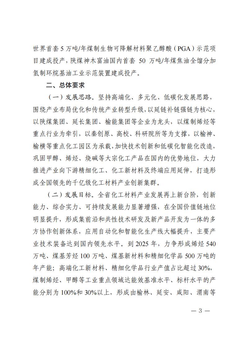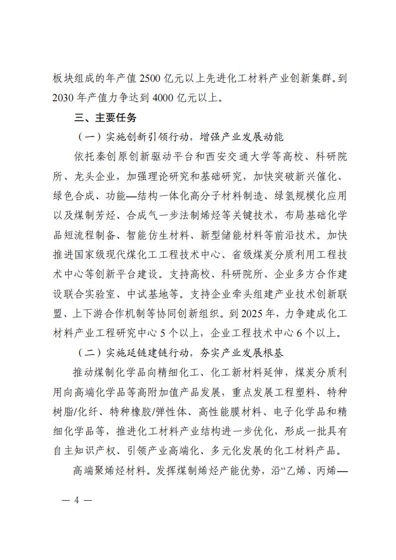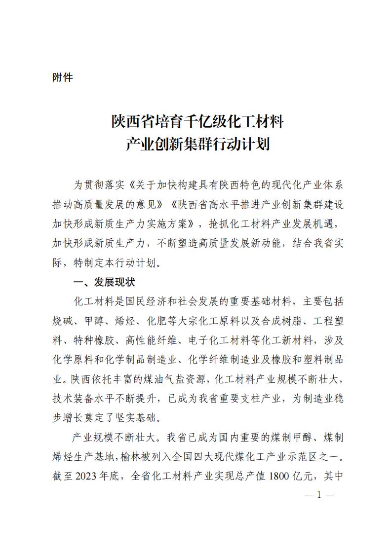 4月7日,陜西省發(fā)展和改革委員會關(guān)于印發(fā)《陜西省培育千億級化工材料產(chǎn)業(yè)創(chuàng)新集群行動計(jì)劃》(以下簡稱《計(jì)劃》)的通知。 《計(jì)劃》指出,實(shí)施創(chuàng)新引領(lǐng)行動,增強(qiáng)產(chǎn)業(yè)發(fā)展動能 依托秦創(chuàng)原創(chuàng)新驅(qū)動平臺和西安交通大學(xué)等高校、科研院 所、龍頭企業(yè),加強(qiáng)理論研究和基礎(chǔ)研究,加快突破新興催化、 綠色合成、功能—結(jié)構(gòu)一體化高分子材料制造、綠氫規(guī)?;瘧?yīng)用 以及煤制芳烴、合成氣一步法制烯烴等關(guān)鍵技術(shù),布局基礎(chǔ)化學(xué) 品短流程制備、智能仿生材料、新型儲能材料等前沿技術(shù)。加快 推進(jìn)國家級現(xiàn)代煤化工工程技術(shù)中心、省級煤炭分質(zhì)利用工程技 術(shù)中心等創(chuàng)新平臺建設(shè)。支持高校、科研院所、企業(yè)多方合作建 設(shè)聯(lián)合實(shí)驗(yàn)室、中試基地等。支持企業(yè)牽頭組建產(chǎn)業(yè)技術(shù)創(chuàng)新聯(lián) 盟、上下游合作機(jī)制等協(xié)同創(chuàng)新組織。到 2025 年,力爭建成化工 材料產(chǎn)業(yè)工程研究中心 5 個以上,企業(yè)工程技術(shù)中心 6 個以上。 原文如下: 陜西省發(fā)展和改革委員會關(guān)于印發(fā)《陜西省培育千億級化工材料產(chǎn)業(yè)創(chuàng)新集群行動計(jì)劃》的通知 各設(shè)區(qū)市發(fā)展改革委、楊凌示范區(qū)發(fā)展改革局,各有關(guān)單位: 為貫徹落實(shí)《關(guān)于加快構(gòu)建具有陜西特色的現(xiàn)代化產(chǎn)業(yè)體系推動高質(zhì)量發(fā)展的意見》《陜西省高水平推進(jìn)產(chǎn)業(yè)創(chuàng)新集群建設(shè)加快形成新質(zhì)生產(chǎn)力實(shí)施方案》,搶抓化工材料產(chǎn)業(yè)發(fā)展機(jī)遇,加快形成新質(zhì)生產(chǎn)力,不斷塑造高質(zhì)量發(fā)展新動能,結(jié)合我省實(shí)際,特制定《陜西省培育千億級化工材料產(chǎn)業(yè)創(chuàng)新集群行動計(jì)劃》。 請有關(guān)市區(qū)立足當(dāng)?shù)貙?shí)際,深入分析產(chǎn)業(yè)創(chuàng)新發(fā)展現(xiàn)狀,落實(shí)落細(xì)產(chǎn)業(yè)發(fā)展“五大體系”和“六個一”工作機(jī)制,突出抓項(xiàng)目、促創(chuàng)新、強(qiáng)主體、優(yōu)生態(tài),指導(dǎo)專業(yè)化園區(qū)做好化工材料產(chǎn)業(yè)創(chuàng)新集群培育工作,制定相應(yīng)行動計(jì)劃及時報送省發(fā)展改革委。 陜西省發(fā)展和改革委員會 2024年4月4日