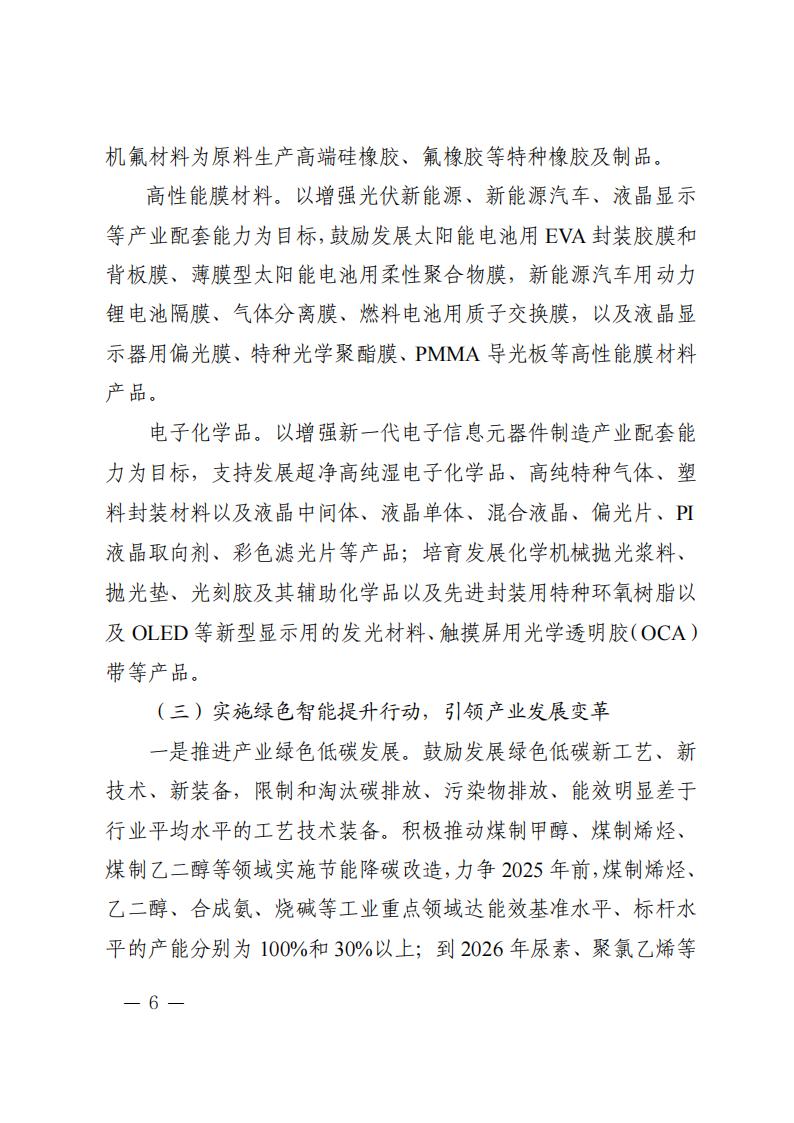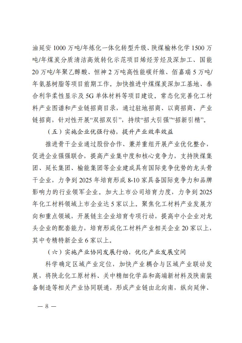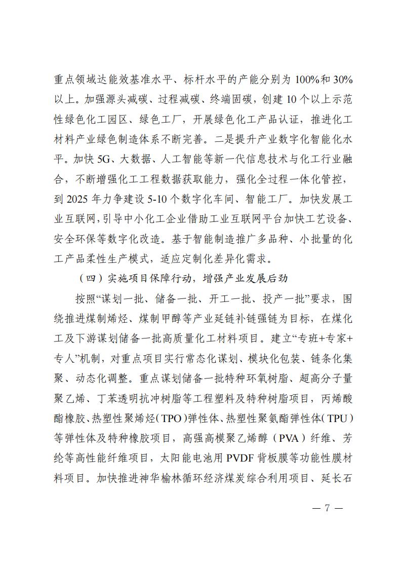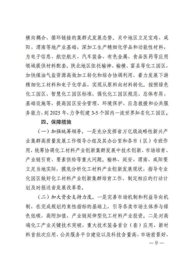 4月7日,陜西省發(fā)展和改革委員會關(guān)于印發(fā)《陜西省培育千億級化工材料產(chǎn)業(yè)創(chuàng)新集群行動計(jì)劃》(以下簡稱《計(jì)劃》)的通知。 《計(jì)劃》指出,實(shí)施創(chuàng)新引領(lǐng)行動,增強(qiáng)產(chǎn)業(yè)發(fā)展動能 依托秦創(chuàng)原創(chuàng)新驅(qū)動平臺和西安交通大學(xué)等高校、科研院 所、龍頭企業(yè),加強(qiáng)理論研究和基礎(chǔ)研究,加快突破新興催化、 綠色合成、功能—結(jié)構(gòu)一體化高分子材料制造、綠氫規(guī)?;瘧?yīng)用 以及煤制芳烴、合成氣一步法制烯烴等關(guān)鍵技術(shù),布局基礎(chǔ)化學(xué) 品短流程制備、智能仿生材料、新型儲能材料等前沿技術(shù)。加快 推進(jìn)國家級現(xiàn)代煤化工工程技術(shù)中心、省級煤炭分質(zhì)利用工程技 術(shù)中心等創(chuàng)新平臺建設(shè)。支持高校、科研院所、企業(yè)多方合作建 設(shè)聯(lián)合實(shí)驗(yàn)室、中試基地等。支持企業(yè)牽頭組建產(chǎn)業(yè)技術(shù)創(chuàng)新聯(lián) 盟、上下游合作機(jī)制等協(xié)同創(chuàng)新組織。到 2025 年,力爭建成化工 材料產(chǎn)業(yè)工程研究中心 5 個以上,企業(yè)工程技術(shù)中心 6 個以上。 原文如下: 陜西省發(fā)展和改革委員會關(guān)于印發(fā)《陜西省培育千億級化工材料產(chǎn)業(yè)創(chuàng)新集群行動計(jì)劃》的通知 各設(shè)區(qū)市發(fā)展改革委、楊凌示范區(qū)發(fā)展改革局,各有關(guān)單位: 為貫徹落實(shí)《關(guān)于加快構(gòu)建具有陜西特色的現(xiàn)代化產(chǎn)業(yè)體系推動高質(zhì)量發(fā)展的意見》《陜西省高水平推進(jìn)產(chǎn)業(yè)創(chuàng)新集群建設(shè)加快形成新質(zhì)生產(chǎn)力實(shí)施方案》,搶抓化工材料產(chǎn)業(yè)發(fā)展機(jī)遇,加快形成新質(zhì)生產(chǎn)力,不斷塑造高質(zhì)量發(fā)展新動能,結(jié)合我省實(shí)際,特制定《陜西省培育千億級化工材料產(chǎn)業(yè)創(chuàng)新集群行動計(jì)劃》。 請有關(guān)市區(qū)立足當(dāng)?shù)貙?shí)際,深入分析產(chǎn)業(yè)創(chuàng)新發(fā)展現(xiàn)狀,落實(shí)落細(xì)產(chǎn)業(yè)發(fā)展“五大體系”和“六個一”工作機(jī)制,突出抓項(xiàng)目、促創(chuàng)新、強(qiáng)主體、優(yōu)生態(tài),指導(dǎo)專業(yè)化園區(qū)做好化工材料產(chǎn)業(yè)創(chuàng)新集群培育工作,制定相應(yīng)行動計(jì)劃及時報送省發(fā)展改革委。 陜西省發(fā)展和改革委員會 2024年4月4日