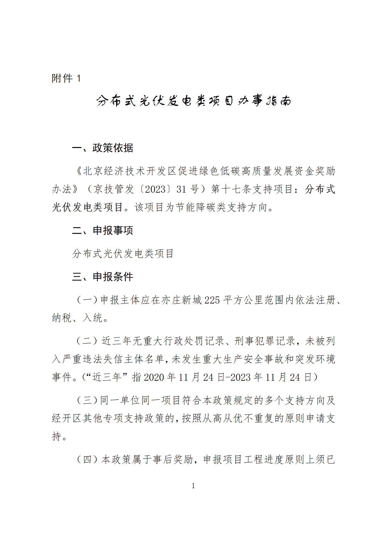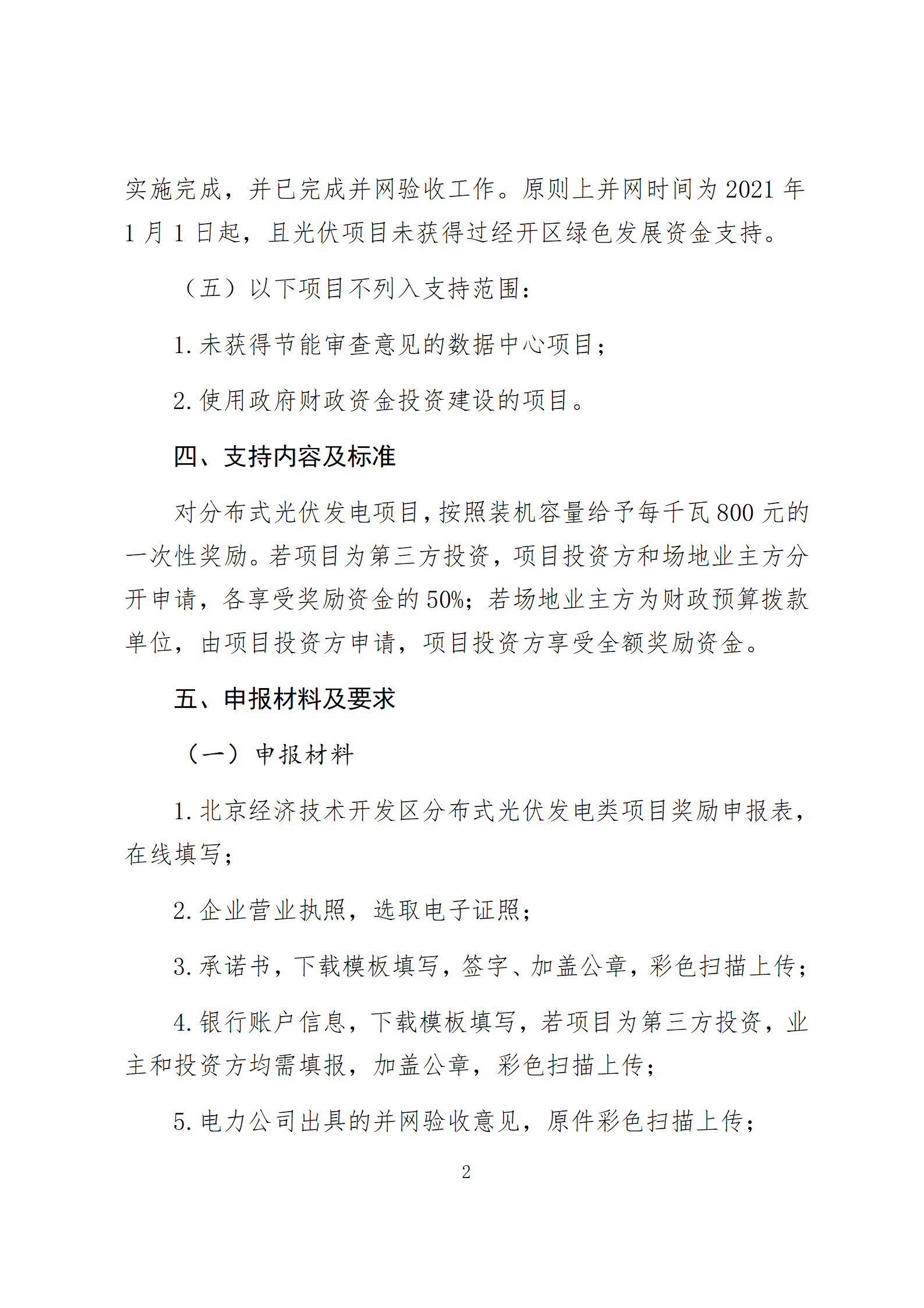 4月15日,北京市經(jīng)開(kāi)區(qū)政務(wù)服務(wù)中心發(fā)布關(guān)于開(kāi)展《北京經(jīng)濟(jì)技術(shù)開(kāi)發(fā)區(qū)促進(jìn)綠色低碳高質(zhì)量發(fā)展資金獎(jiǎng)勵(lì)辦法》節(jié)能降碳類(lèi)事項(xiàng)申報(bào)的通知。 其中,在附件《分布式光伏發(fā)電類(lèi)項(xiàng)目辦事指南》提到,對(duì)分布式光伏發(fā)電項(xiàng)目,按照裝機(jī)容量給予每千瓦800元的一次性獎(jiǎng)勵(lì)。若項(xiàng)目為第三方投資,項(xiàng)目投資方和場(chǎng)地業(yè)主方分開(kāi)申請(qǐng),各享受獎(jiǎng)勵(lì)資金的50%;若場(chǎng)地業(yè)主方為財(cái)政預(yù)算撥款單位,由項(xiàng)目投資方申請(qǐng),項(xiàng)目投資方享受全額獎(jiǎng)勵(lì)資金。 原文如下: 關(guān)于開(kāi)展《北京經(jīng)濟(jì)技術(shù)開(kāi)發(fā)區(qū)促進(jìn)綠色低碳高質(zhì)量發(fā)展資金獎(jiǎng)勵(lì)辦法》節(jié)能降碳類(lèi)事項(xiàng)申報(bào)的通知 各相關(guān)企業(yè): 為貫徹落實(shí)《北京經(jīng)濟(jì)技術(shù)開(kāi)發(fā)區(qū)促進(jìn)綠色低碳高質(zhì)量發(fā)展資金獎(jiǎng)勵(lì)辦法》(京技管發(fā)〔2023〕31號(hào))的工作要求,現(xiàn)開(kāi)展2023年綠色低碳高質(zhì)量發(fā)展資金獎(jiǎng)勵(lì)辦法節(jié)能降碳類(lèi)相關(guān)事項(xiàng)申報(bào)工作,通知如下: 一、申報(bào)時(shí)間 自2024年4月16日至2024年4月30日期間通過(guò)經(jīng)開(kāi)區(qū)官網(wǎng)政策兌現(xiàn)模塊進(jìn)入政策兌現(xiàn)綜合服務(wù)平臺(tái),或使用360瀏覽器的極速模式登錄網(wǎng)址:zcdx.kfqgw.beijing.gov.cn,注冊(cè)登錄后進(jìn)行項(xiàng)目申報(bào)。如未在規(guī)定時(shí)間內(nèi)提交申報(bào)材料的,視為自動(dòng)放棄。 二、申報(bào)詳情 詳見(jiàn)附件中《辦事指南》或政策兌現(xiàn)綜合服務(wù)平臺(tái)“項(xiàng)目申報(bào)”頁(yè)面。 三、聯(lián)系方式 政策咨詢(xún): 經(jīng)開(kāi)區(qū)政務(wù)服務(wù)中心“政策申報(bào)”窗口,聯(lián)系電話(huà):010-67857687;010-67857878轉(zhuǎn)4,工作日上午9:00—12:00,下午1:30—5:00。 經(jīng)開(kāi)區(qū)經(jīng)濟(jì)發(fā)展局,聯(lián)系電話(huà):010-67882073,工作日上午9:00—12:00,下午2:00—6:00。 技術(shù)支持: 聯(lián)系電話(huà):010-67857638,工作日上午9:00—12:00,下午2:00—6:00。 經(jīng)開(kāi)區(qū)經(jīng)濟(jì)發(fā)展局 2024年4月15日