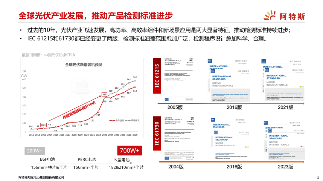 IEC 61215 與 IEC 61730,作為光伏組件領(lǐng)域至關(guān)重要的兩個基礎(chǔ)標(biāo)準(zhǔn),其新標(biāo)的發(fā)布標(biāo)志著產(chǎn)品質(zhì)量檢驗(yàn)再次升級,對光伏組件的研發(fā)、制造、銷售及運(yùn)營各個環(huán)節(jié)均產(chǎn)生深入影響。 2023年12月,阿特斯TOPCon系列組件率先通過了IEC 61215-2021和IEC 61730-2023新標(biāo)的嚴(yán)苛測試,并獲得VDE頒發(fā)的全球首張新版標(biāo)準(zhǔn)光伏組件認(rèn)證證書。截止目前,阿特斯旗下所有在售光伏組件產(chǎn)品均成功獲得新標(biāo)認(rèn)證,再次彰顯了阿特斯組件產(chǎn)品的卓越品質(zhì)。 近日,阿特斯成功舉辦《探究IEC新標(biāo)切換背后的故事》線上直播活動,向觀眾分享了新標(biāo)切換背后的阿特斯故事。 一、引領(lǐng)光伏全球化和高質(zhì)量發(fā)展 作為全球化運(yùn)營最成功的老牌光伏企業(yè)之一,阿特斯始終站在行業(yè)前沿。新標(biāo)的成功切換不僅鞏固了其在全球市場的領(lǐng)先地位,更進(jìn)一步提升了產(chǎn)品質(zhì)量,為光伏行業(yè)的高質(zhì)量發(fā)展注入了強(qiáng)大動力。 IEC 61215和61730標(biāo)準(zhǔn)在全球范圍內(nèi)被廣泛采用,是光伏組件的基礎(chǔ)認(rèn)證測試標(biāo)準(zhǔn)。目前,這兩個系列標(biāo)準(zhǔn)已升級到第三版,對光伏組件的性能和質(zhì)量要求更加嚴(yán)格。 憑借22年的深厚積淀,阿特斯已連續(xù)13年穩(wěn)居全球光伏出貨前五的行列。新標(biāo)的導(dǎo)入將進(jìn)一步擴(kuò)大阿特斯組件產(chǎn)品在全球市場的銷售優(yōu)勢,同時(shí)新標(biāo)的順利實(shí)施也是阿特斯發(fā)展新質(zhì)生產(chǎn)力、以質(zhì)量為核心競爭力的生動體現(xiàn)。 二、先進(jìn)管理經(jīng)驗(yàn)和全面可靠性體系,馭“標(biāo)”而行 阿特斯在光伏領(lǐng)域擁有眾多IEC TC82注冊專家,是國內(nèi)光伏企業(yè)中參與和制定國際、國內(nèi)標(biāo)準(zhǔn)最多的企業(yè)之一。目前,阿特斯擁有3名IEC TC82注冊專家,他們積極參與IEC標(biāo)準(zhǔn)的討論與制定,已主導(dǎo)并發(fā)布了三項(xiàng)IEC國際標(biāo)準(zhǔn):IEC 60904-5、IEC TS 63202-3和IEC TS 63202-4。在IEC 61215和61730的改版過程中,阿特斯的多項(xiàng)建議得到了采納。 正是憑借在標(biāo)準(zhǔn)制定方面的領(lǐng)先能力,阿特斯將這一優(yōu)勢提前融入產(chǎn)品的研發(fā)與銷售之中。 例如,早在2022年,阿特斯在西藏昌都4000m高海拔項(xiàng)目中,便提前參照了IEC 61730-2023標(biāo)準(zhǔn)中的脈沖電壓新測試標(biāo)準(zhǔn),考慮了實(shí)驗(yàn)室海拔的影響,將脈沖電壓基準(zhǔn)由16kV提高到了19.68kV,最終阿特斯210系列CS7N-MB-AG組件通過了最高30kV的超高脈沖電壓測試,對應(yīng)可滿足5000~6000m海拔要求。 此外,早在2021年,阿特斯就率先在行業(yè)內(nèi)完成了IEC 63126高溫應(yīng)用組件的認(rèn)證,截至目前,阿特斯所有系列組件均具備IEC 63126 Level1的認(rèn)證,將組件的適應(yīng)運(yùn)行溫度提升至80℃。(IEC 61215-2021中指出:當(dāng)組件運(yùn)行溫度的第98百分位數(shù)超過70℃時(shí),應(yīng)參照IEC TS 63126相關(guān)的測試要求) 多年來,阿特斯憑借深厚的技術(shù)積累和先進(jìn)的實(shí)驗(yàn)室優(yōu)勢,在組件研發(fā)中始終堅(jiān)持高標(biāo)準(zhǔn)、嚴(yán)要求的原則。阿特斯將繼續(xù)以最可靠的品質(zhì)和堅(jiān)定的承諾為全球客戶提供優(yōu)質(zhì)的產(chǎn)品與服務(wù)。 申明:本文中包含的產(chǎn)品規(guī)格、技術(shù)參數(shù)等實(shí)際可能略有偏差,相關(guān)測試結(jié)果僅供參考。由于不斷創(chuàng)新、 研發(fā)和產(chǎn)品改良,阿特斯有權(quán)在不事先通知的情況下,隨時(shí)調(diào)整本文中所對應(yīng)的信息,以上信息僅供參考??蛻艉炗喓贤瑫r(shí)應(yīng)向阿特斯商務(wù)或技術(shù)支持部門仔細(xì)獲取最新產(chǎn)品規(guī)格、技術(shù)參數(shù)等,并以屆時(shí)簽訂的有效版本為準(zhǔn)。