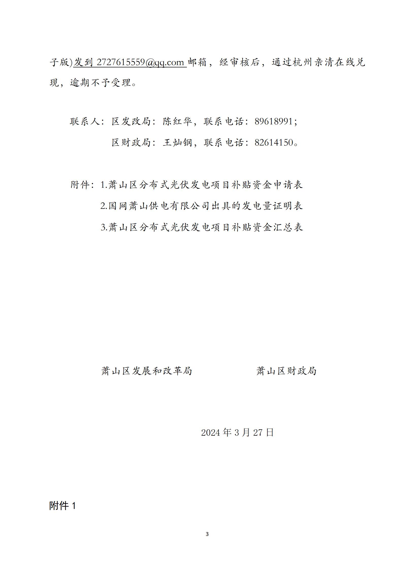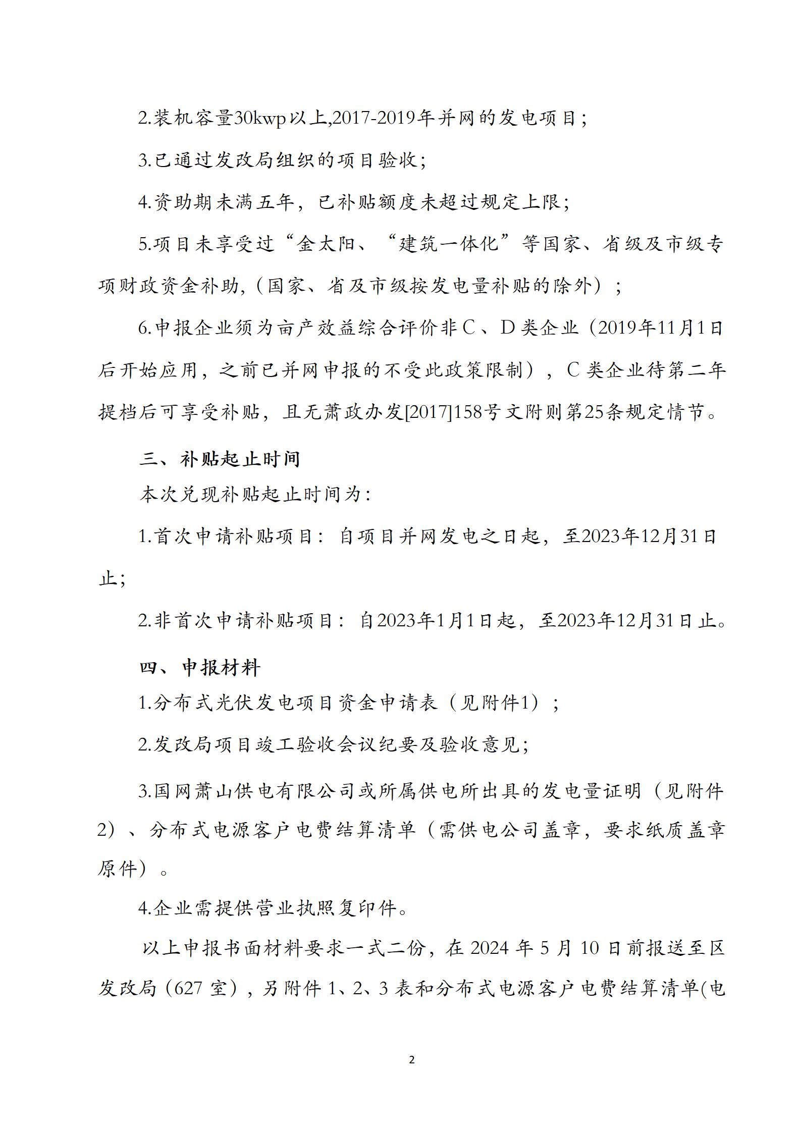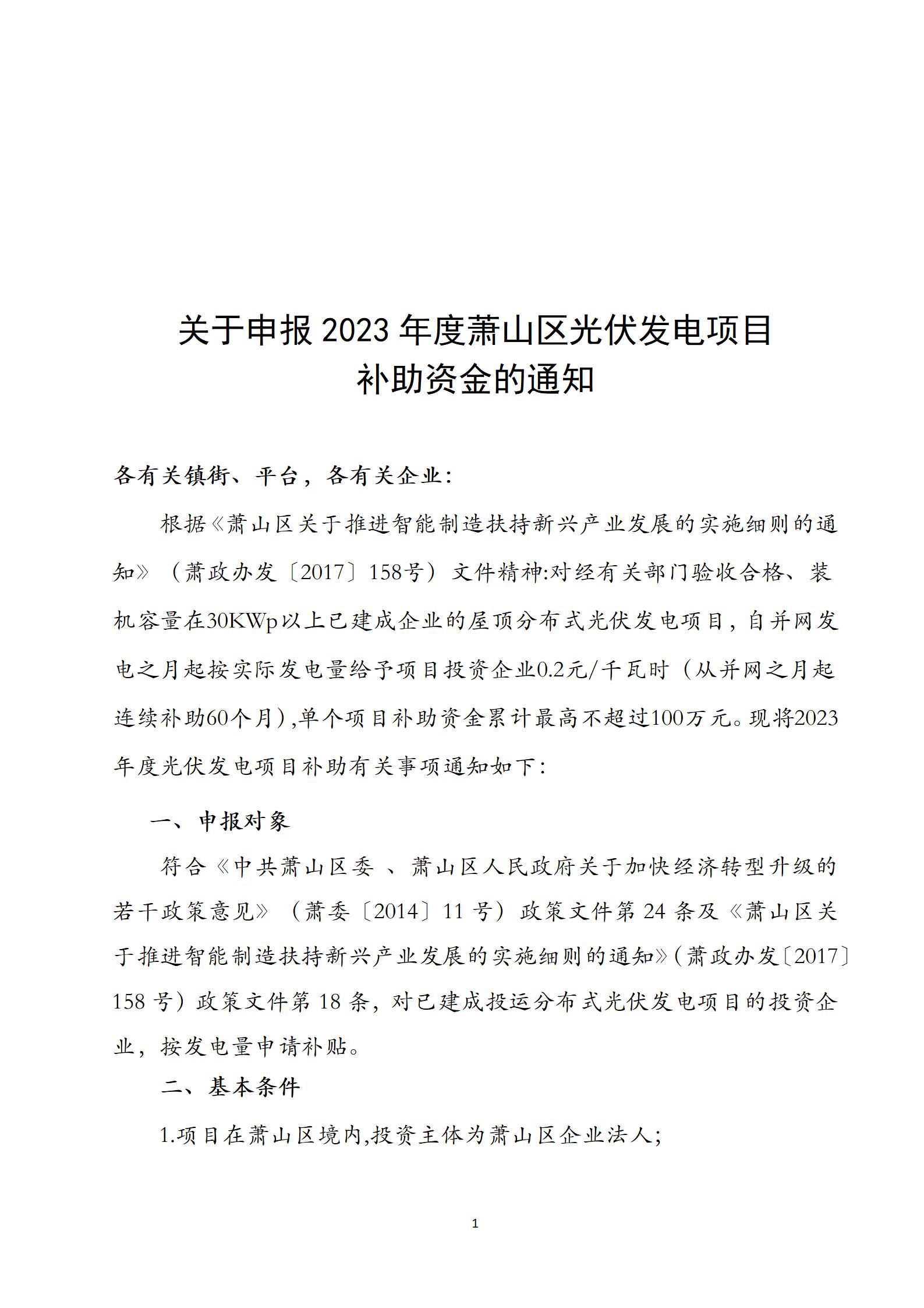 蕭山區(qū)發(fā)展和改革局發(fā)布關(guān)于申報2023年度蕭山區(qū)光伏發(fā)電項目補助資金的通知,通知指出,對經(jīng)有關(guān)部門驗收合格、裝機容量在30KWp以上已建成企業(yè)的屋頂分布式光伏發(fā)電項目,自并網(wǎng)發(fā)電之月起按實際發(fā)電量給予項目投資企業(yè)0.2元/千瓦時(從并網(wǎng)之月起連續(xù)補助60個月),單個項目補助資金累計最高不超過100萬元。 原文如下: 關(guān)于申報2023年度蕭山區(qū)光伏發(fā)電項目補助資金的通知 各有關(guān)鎮(zhèn)街、平臺,各有關(guān)企業(yè): 根據(jù)《蕭山區(qū)關(guān)于推進智能制造扶持新興產(chǎn)業(yè)發(fā)展的實施細則的通知》(蕭政辦發(fā)〔2017〕158號)文件精神:對經(jīng)有關(guān)部門驗收合格、裝機容量在30KWp以上已建成企業(yè)的屋頂分布式光伏發(fā)電項目,自并網(wǎng)發(fā)電之月起按實際發(fā)電量給予項目投資企業(yè)0.2元/千瓦時(從并網(wǎng)之月起連續(xù)補助60個月),單個項目補助資金累計最高不超過100萬元?,F(xiàn)將2023年度光伏發(fā)電項目補助有關(guān)事項通知如下: 一、申報對象 符合《中共蕭山區(qū)委 、蕭山區(qū)人民政府關(guān)于加快經(jīng)濟轉(zhuǎn)型升級的若干政策意見》(蕭委〔2014〕11號)政策文件第24條及《蕭山區(qū)關(guān)于推進智能制造扶持新興產(chǎn)業(yè)發(fā)展的實施細則的通知》(蕭政辦發(fā)〔2017〕158號)政策文件第18條,對已建成投運分布式光伏發(fā)電項目的投資企業(yè),按發(fā)電量申請補貼。 二、基本條件 1.項目在蕭山區(qū)境內(nèi),投資主體為蕭山區(qū)企業(yè)法人; 2.裝機容量30kwp以上,2017-2019年并網(wǎng)的發(fā)電項目; 3.已通過發(fā)改局組織的項目驗收; 4.資助期未滿五年,已補貼額度未超過規(guī)定上限; 5.項目未享受過“金太陽、“建筑一體化”等國家、省級及市級專項財政資金補助,(國家、省及市級按發(fā)電量補貼的除外); 6.申報企業(yè)須為畝產(chǎn)效益綜合評價非C、D類企業(yè)(2019年11月1日后開始應(yīng)用,之前已并網(wǎng)申報的不受此政策限制),C類企業(yè)待第二年提檔后可享受補貼,且無蕭政辦發(fā)[2017]158號文附則第25條規(guī)定情節(jié)。 三、補貼起止時間 本次兌現(xiàn)補貼起止時間為: 1.首次申請補貼項目:自項目并網(wǎng)發(fā)電之日起,至2023年12月31日止; 2.非首次申請補貼項目:自2023年1月1日起,至2023年12月31日止。 四、申報材料 1.分布式光伏發(fā)電項目資金申請表(見附件1); 2.發(fā)改局項目竣工驗收會議紀要及驗收意見; 3.國網(wǎng)蕭山供電有限公司或所屬供電所出具的發(fā)電量證明(見附件2)、分布式電源客戶電費結(jié)算清單(需供電公司蓋章,要求紙質(zhì)蓋章原件)。 4.企業(yè)需提供營業(yè)執(zhí)照復(fù)印件。 以上申報書面材料要求一式二份,在2024年5月10日前報送至區(qū)發(fā)改局(627室),另附件1、2、3表和分布式電源客戶電費結(jié)算清單(電子版)發(fā)到2727615559@qq.com郵箱,經(jīng)審核后,通過杭州親清在線兌現(xiàn),逾期不予受理。 聯(lián)系人:區(qū)發(fā)改局:陳紅華,聯(lián)系電話:89618991; 區(qū)財政局:王燦鋼,聯(lián)系電話:82614150。 附件:1.蕭山區(qū)分布式光伏發(fā)電項目補貼資金申請表 2.國網(wǎng)蕭山供電有限公司出具的發(fā)電量證明表 3.蕭山區(qū)分布式光伏發(fā)電項目補貼資金匯總表 蕭山區(qū)發(fā)展和改革局 蕭山區(qū)財政局 2024年3月27日 附件1:蕭山區(qū)分布式光伏發(fā)電項目補貼資金申請表 附件2:國網(wǎng)蕭山供電有限公司出具的發(fā)電量證明表 附件3:蕭山區(qū)分布式光伏發(fā)電項目申請補貼資金匯總表